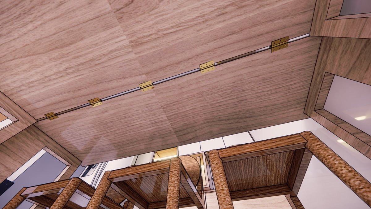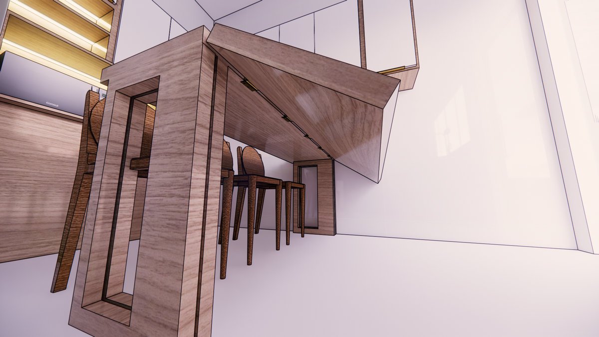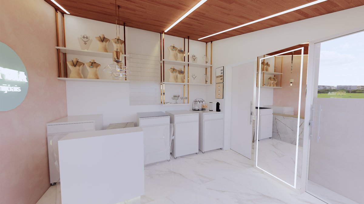 No interior da loja, foi proposta uma marcenaria dividida em módulos (que abrem e fecham), com rodinhas, permitido maior funcionalidade.