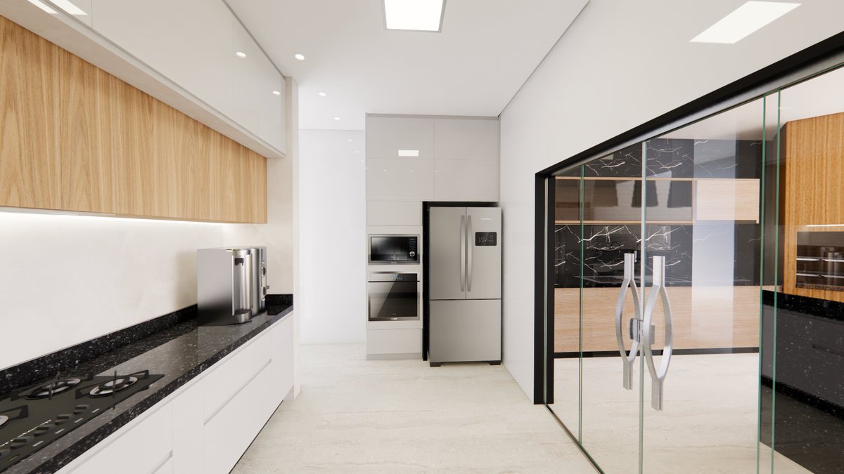 Uma cozinha linda, arejada, funcional e integrada com o espaço gourmet.