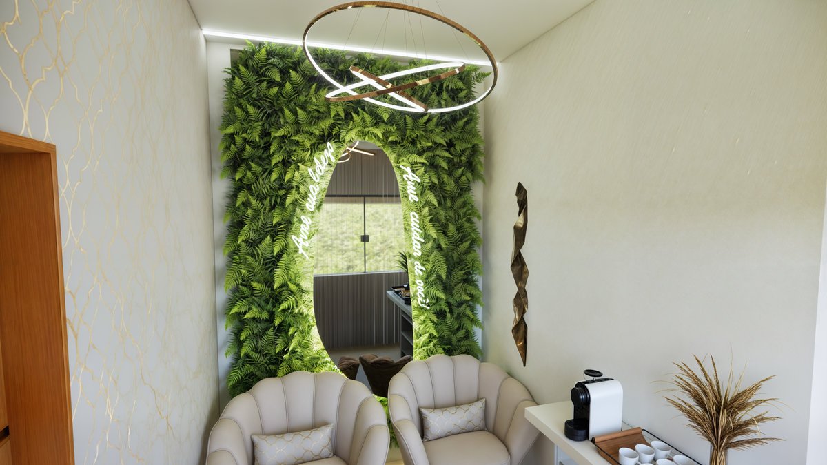A fluidez do gesso em formato orgânico, na sala de procedimentos, trouxe personalidade à clínica, juntamente com o jardim vertical da recepção, o qual compôs com o espelho e as frases iluminadas ao redor dele, criando um ambiente instagramáveis e muito aconchegante!