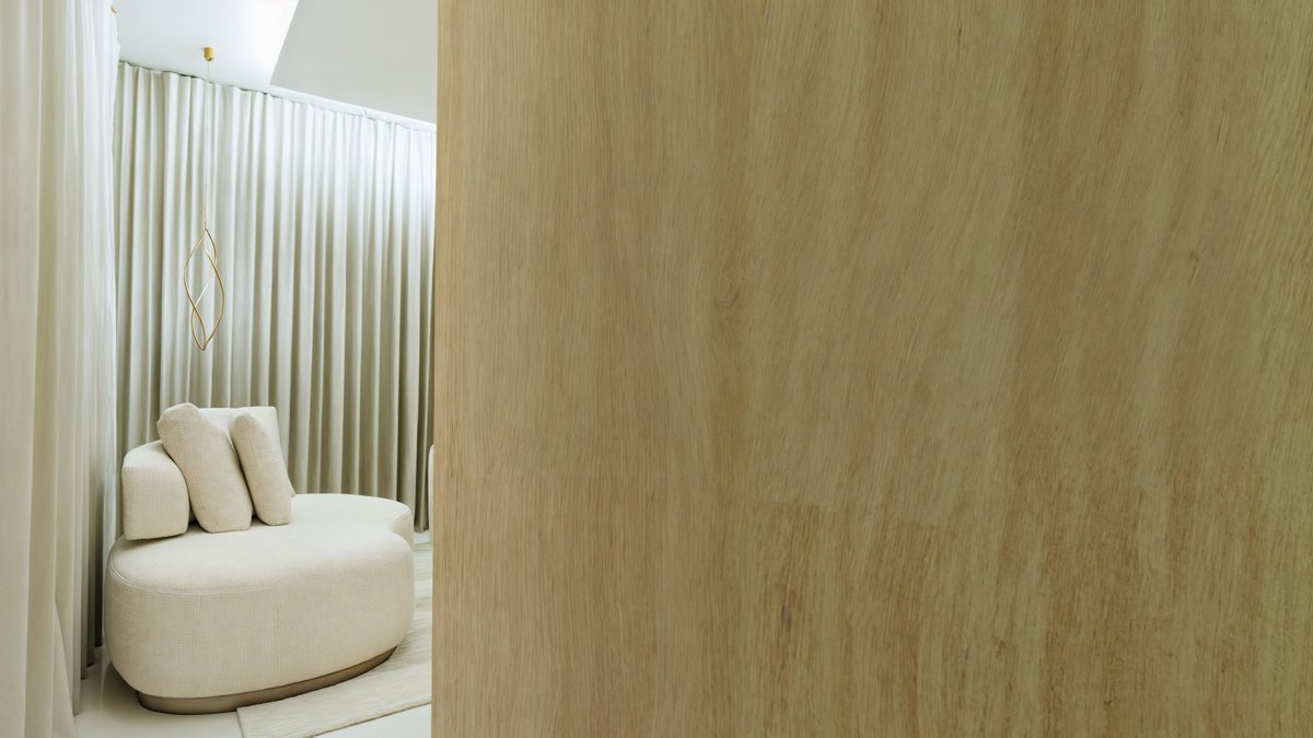 Como eles já tinham comprado os acabamentos em tons de preto, a ideia foi trazer um elemento que trouxesse mais aconchego e que contrastasse com a cor preta, sem pesar demais a estética do ambiente.