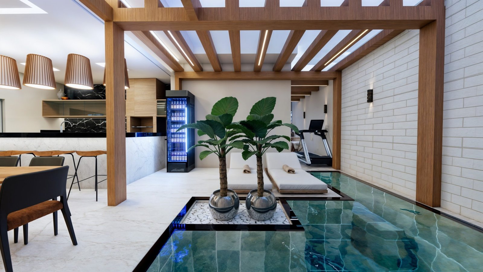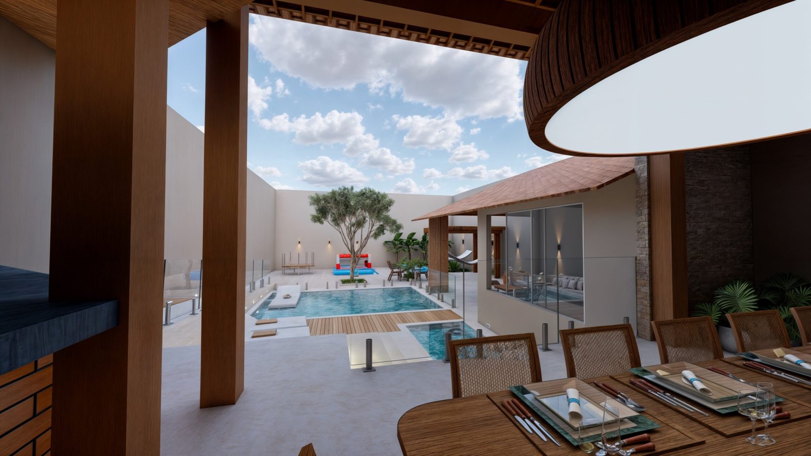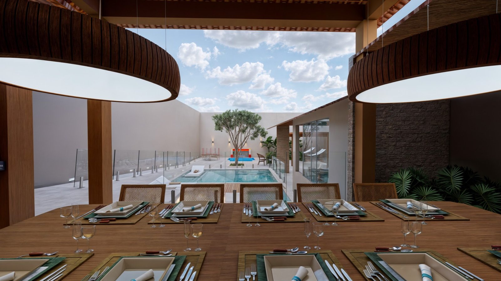 O jardim seco de pedra, no centro da piscina, permite uma interação com algum elemento da natureza, criando gatilhos mentais de descanso e frescor, além de criar uma estética muito agradável e autêntica para o local.