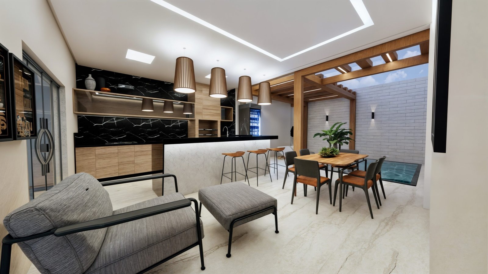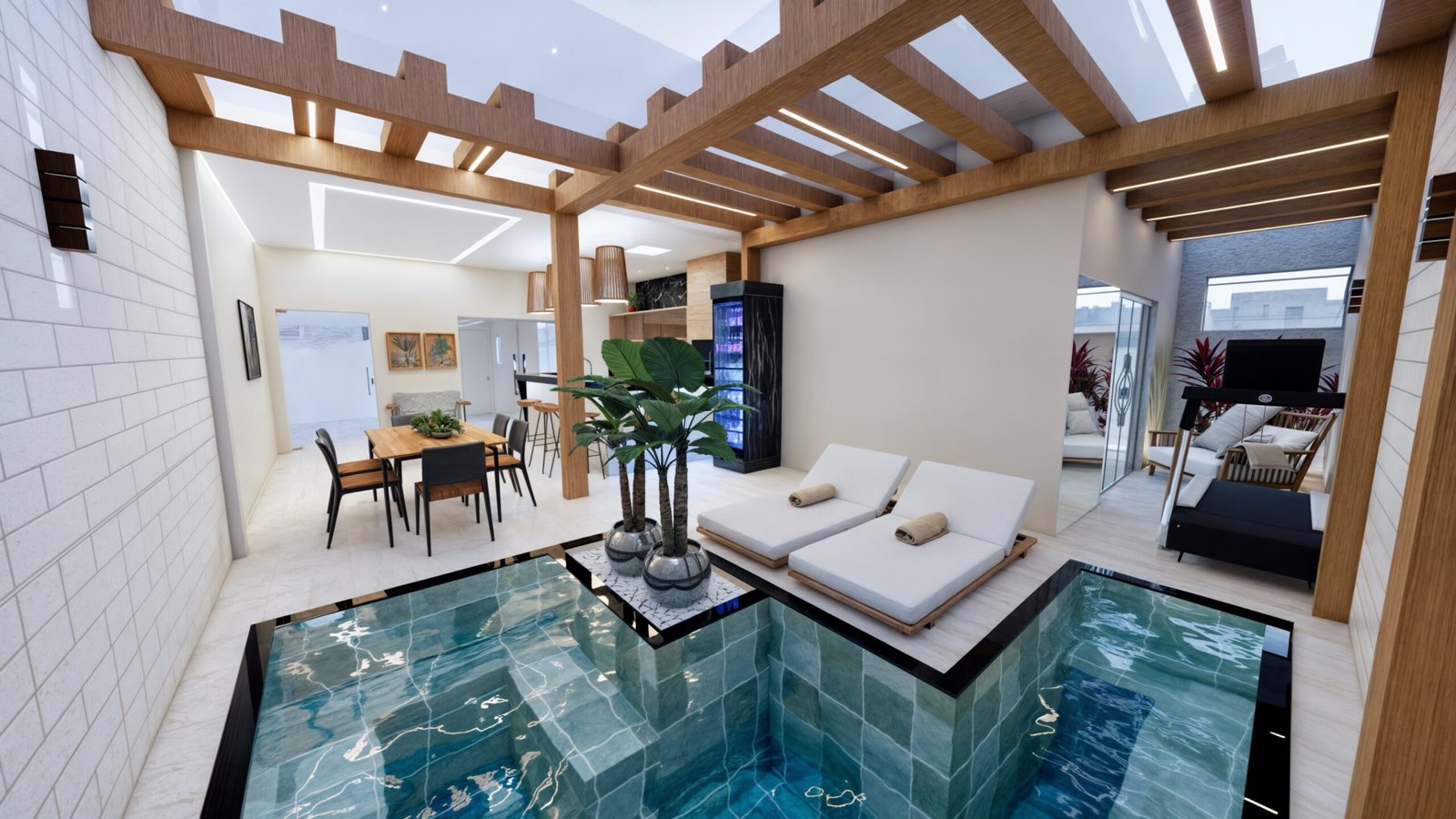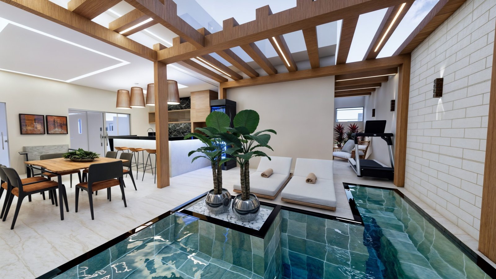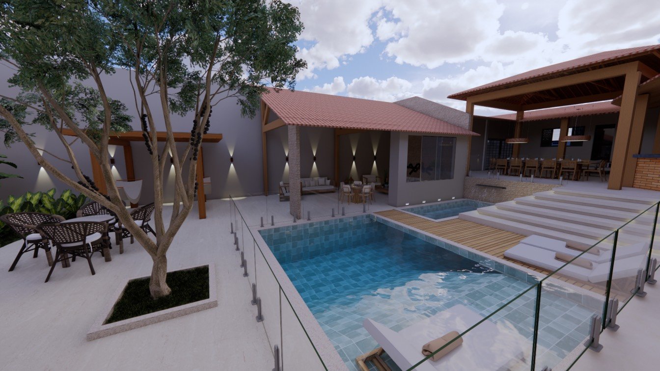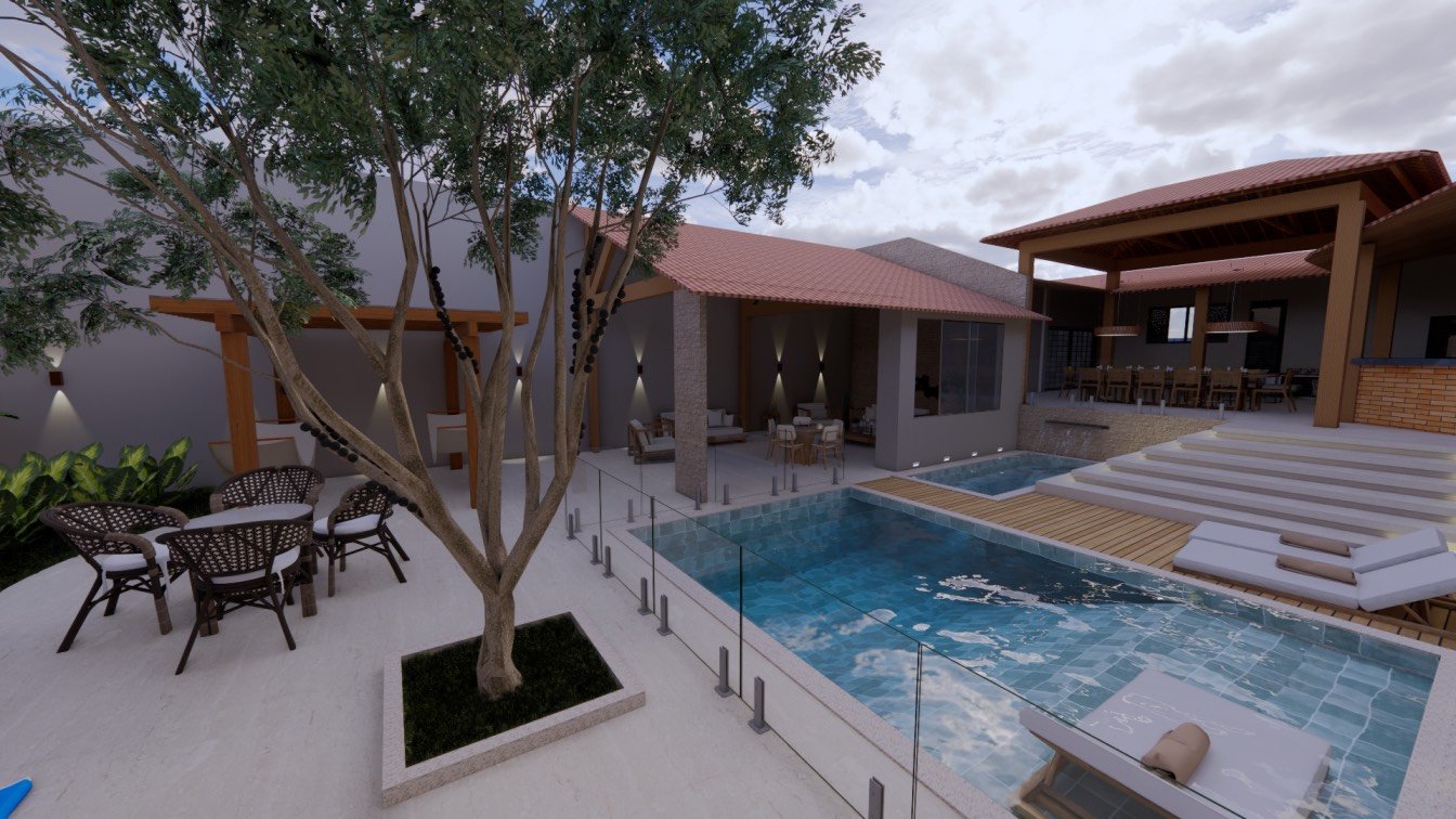 Desta forma, foi idealizada a piscina aquecida ao lado do espaço gourmet, criando uma conexão tanto para o gourmet como também para a varanda do quarto, que está voltada para o fundo do lote. Antes, a porta do quarto estava localizada para frente da piscina e então sugerimos que trocassem a porta de lugar, permitindo maior privacidade. Além disso, fechando a porta do quarto, ganhamos espaço para as espreguiçadeiras que foram localizadas a frente da piscina, criando uma composição funcional.
