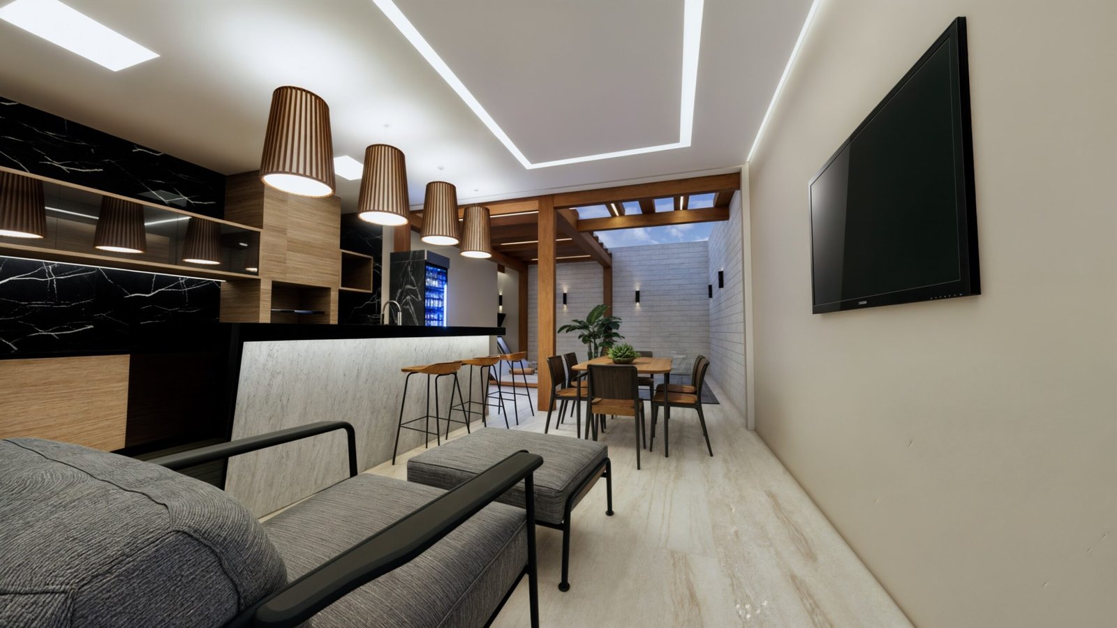 A madeira foi inserida também no painel da TV (com uma folha amadeirada frontal, iluminada por trás), permitindo uma ambiência agradável ao espaço.