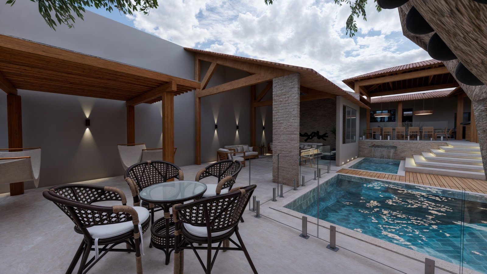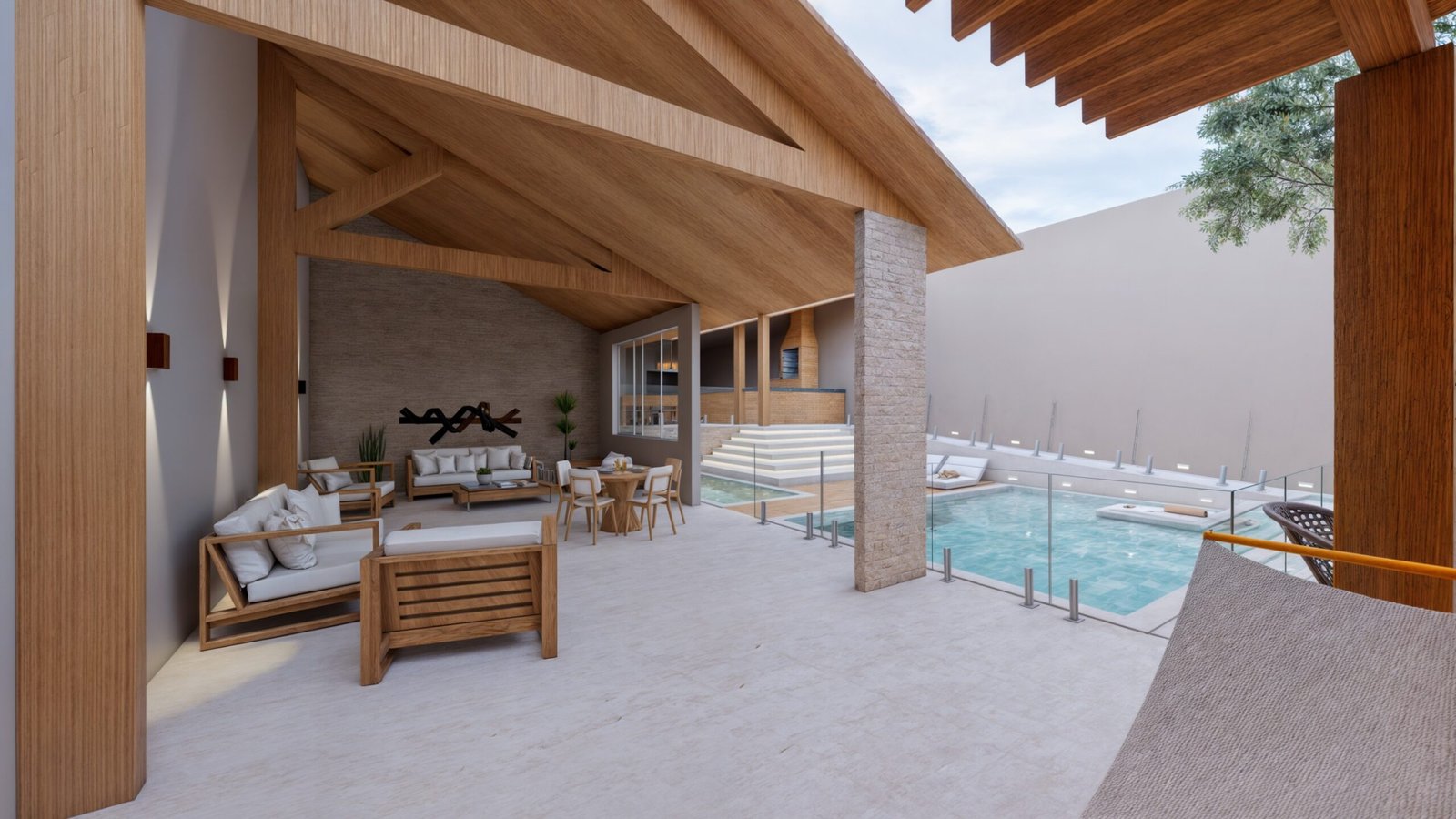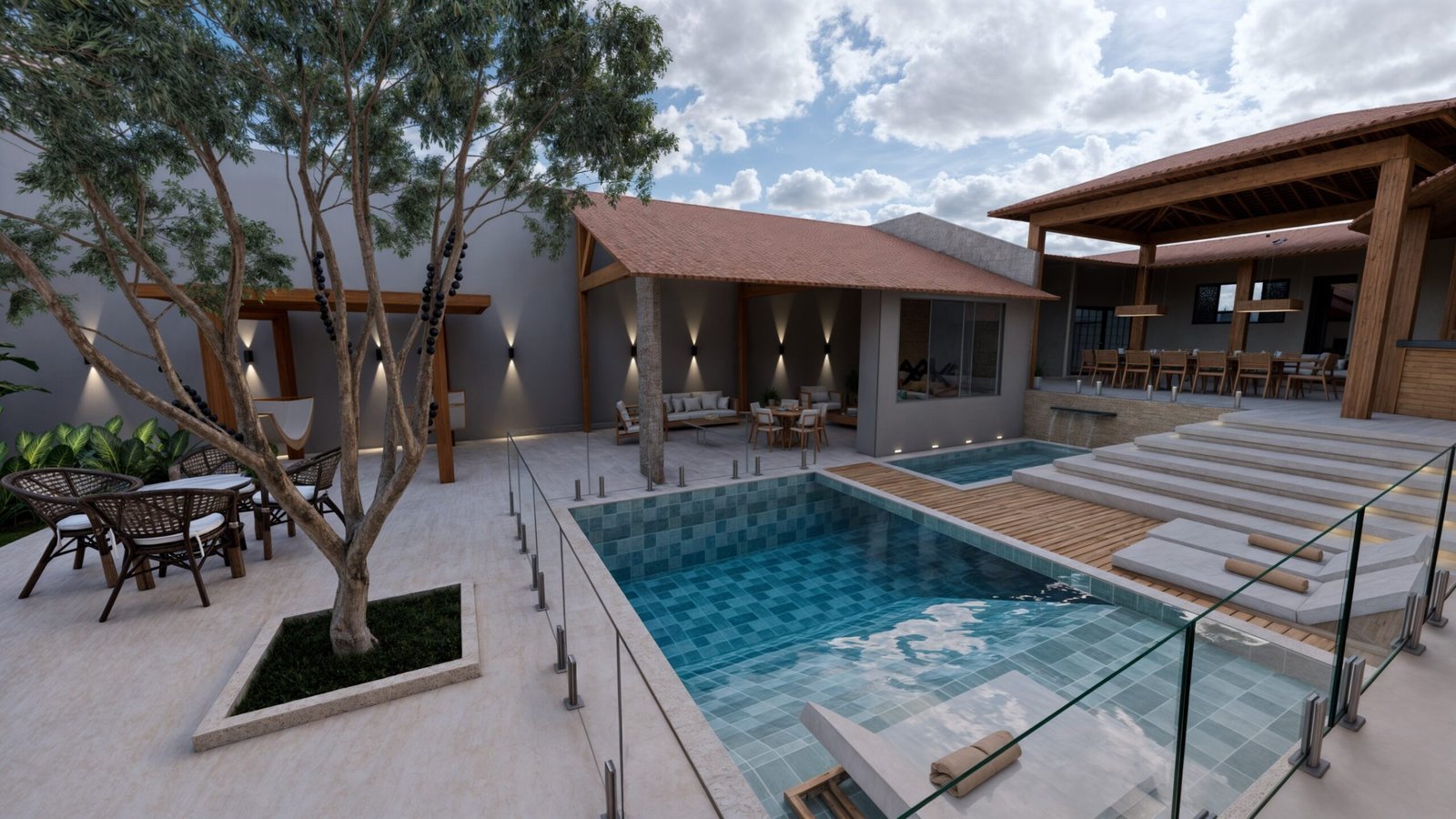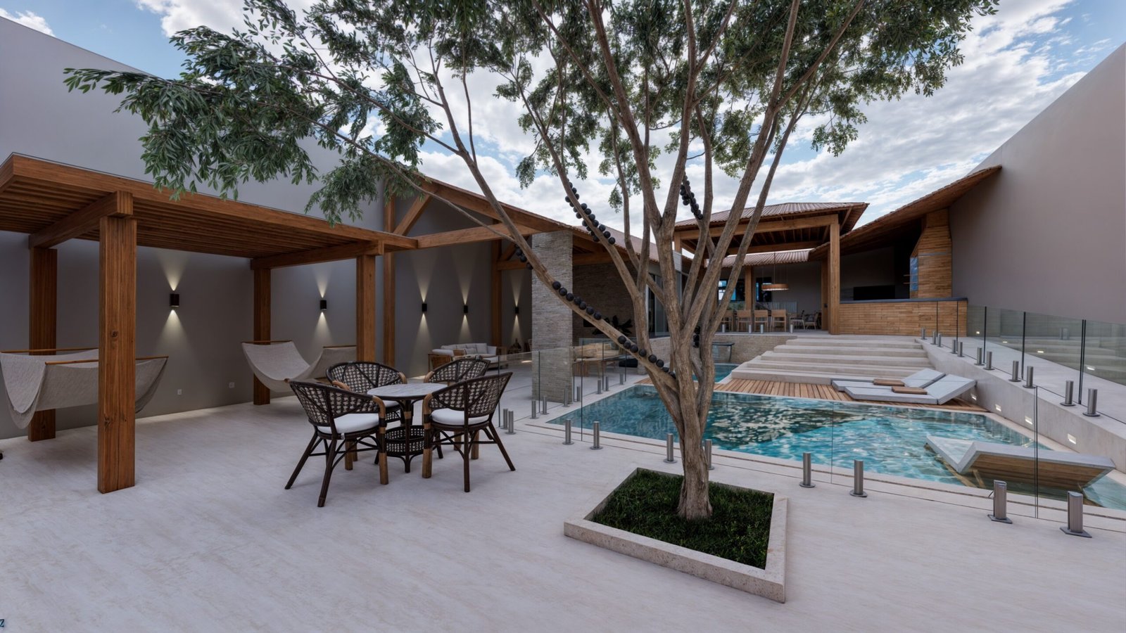 Para isso, aproveitei uma parte da edificação existente, mantendo uma área coberta, transformando-a em um lounge de descanso.