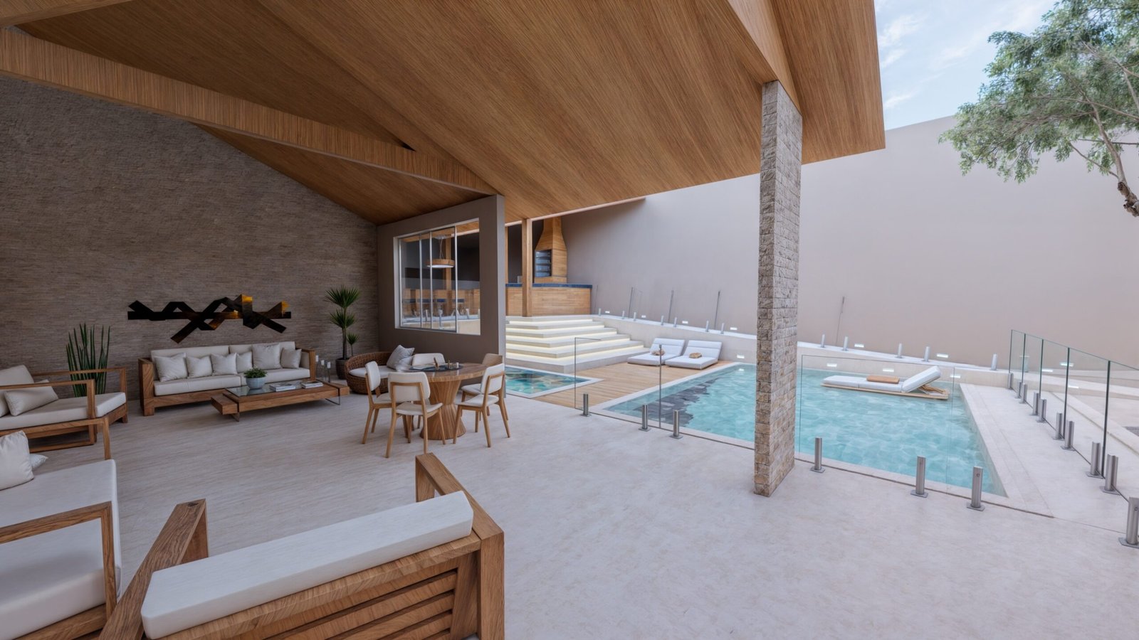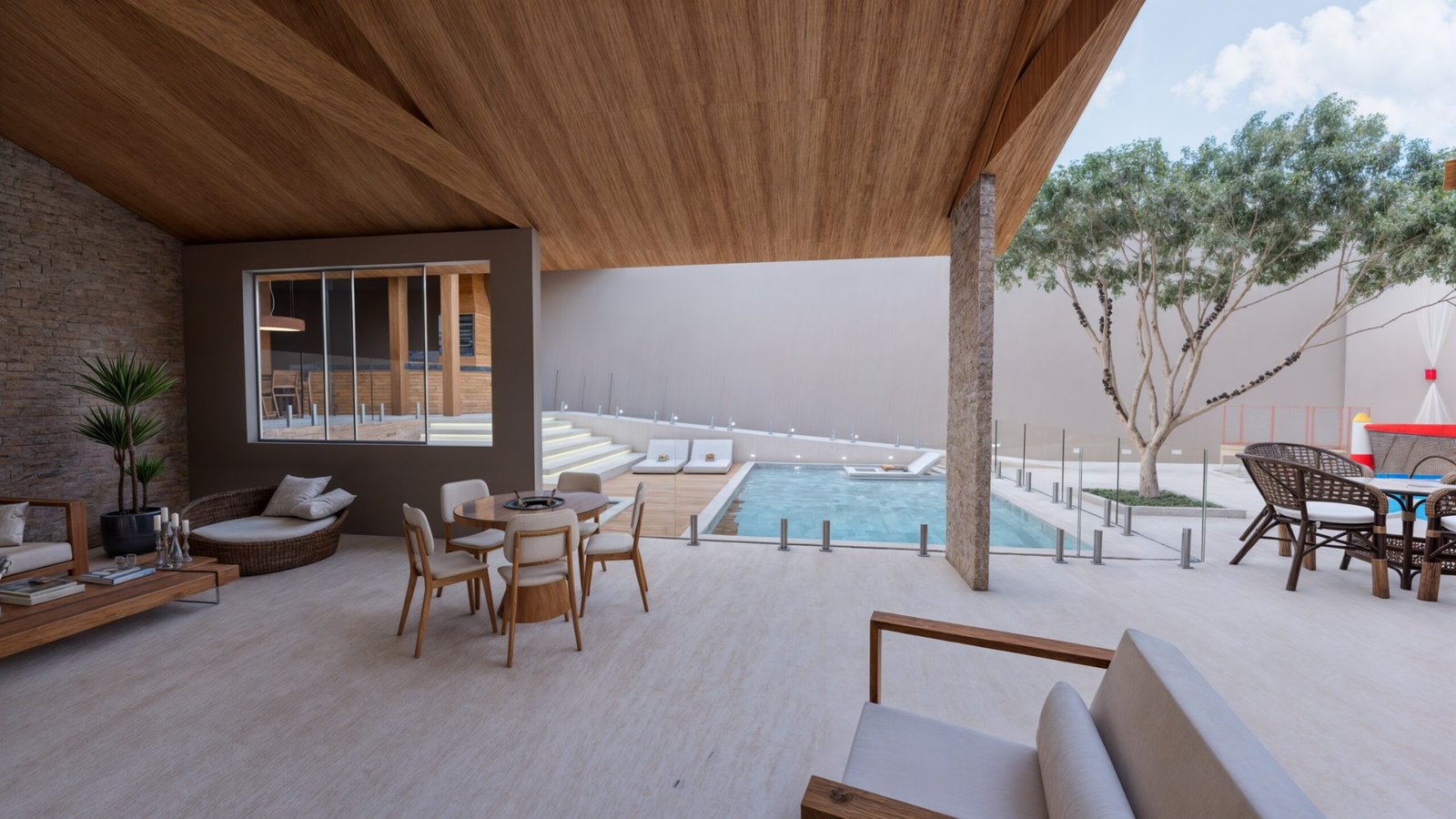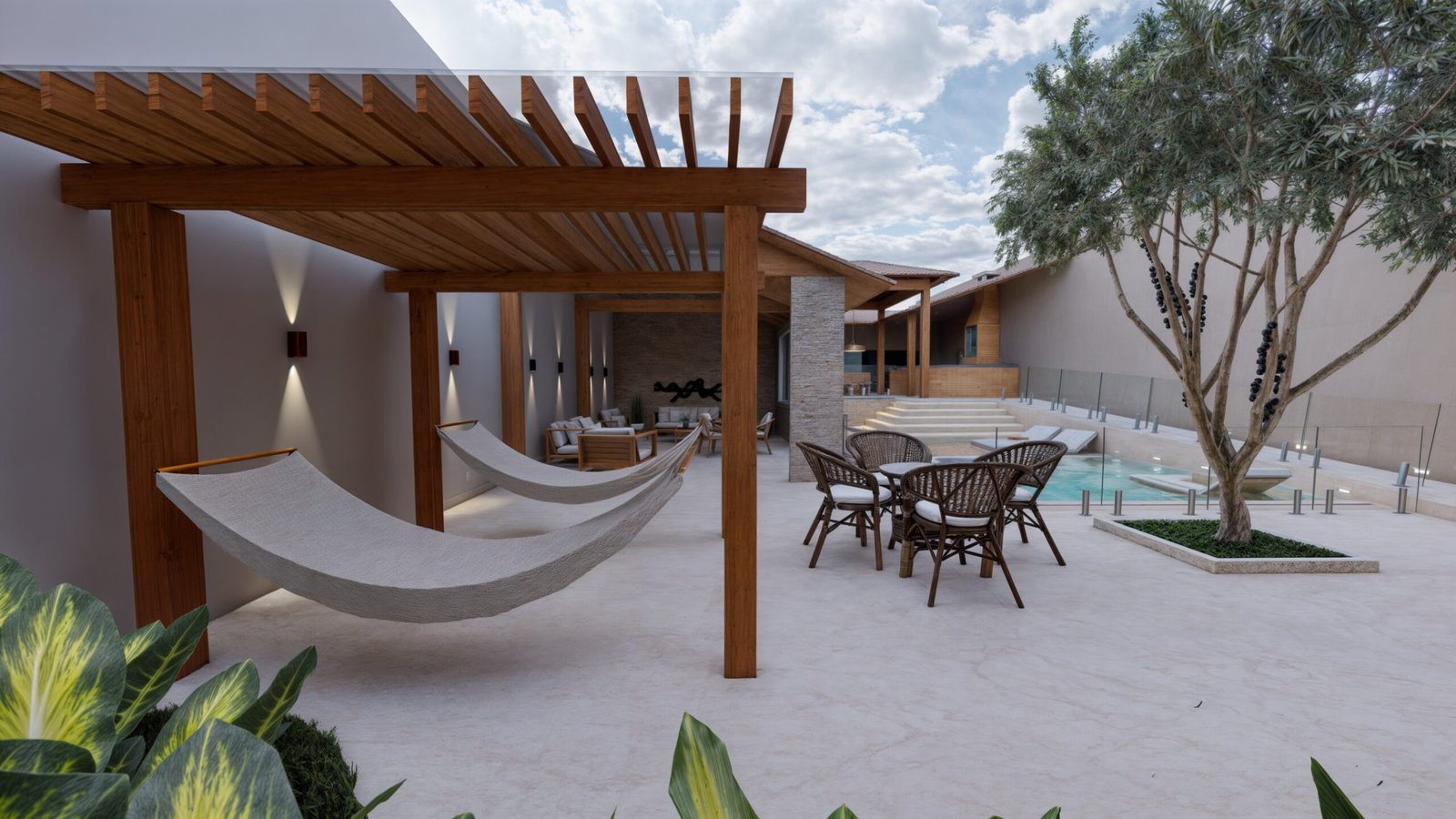 Para isso, aproveitei uma parte da edificação existente, mantendo uma área coberta, transformando-a em um lounge de descanso.