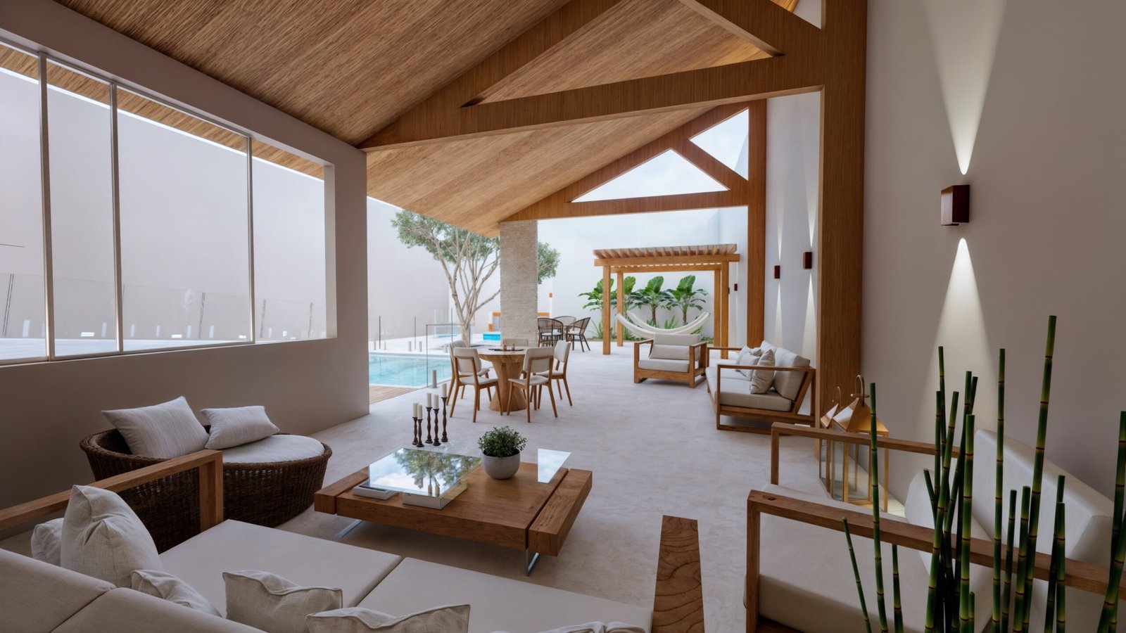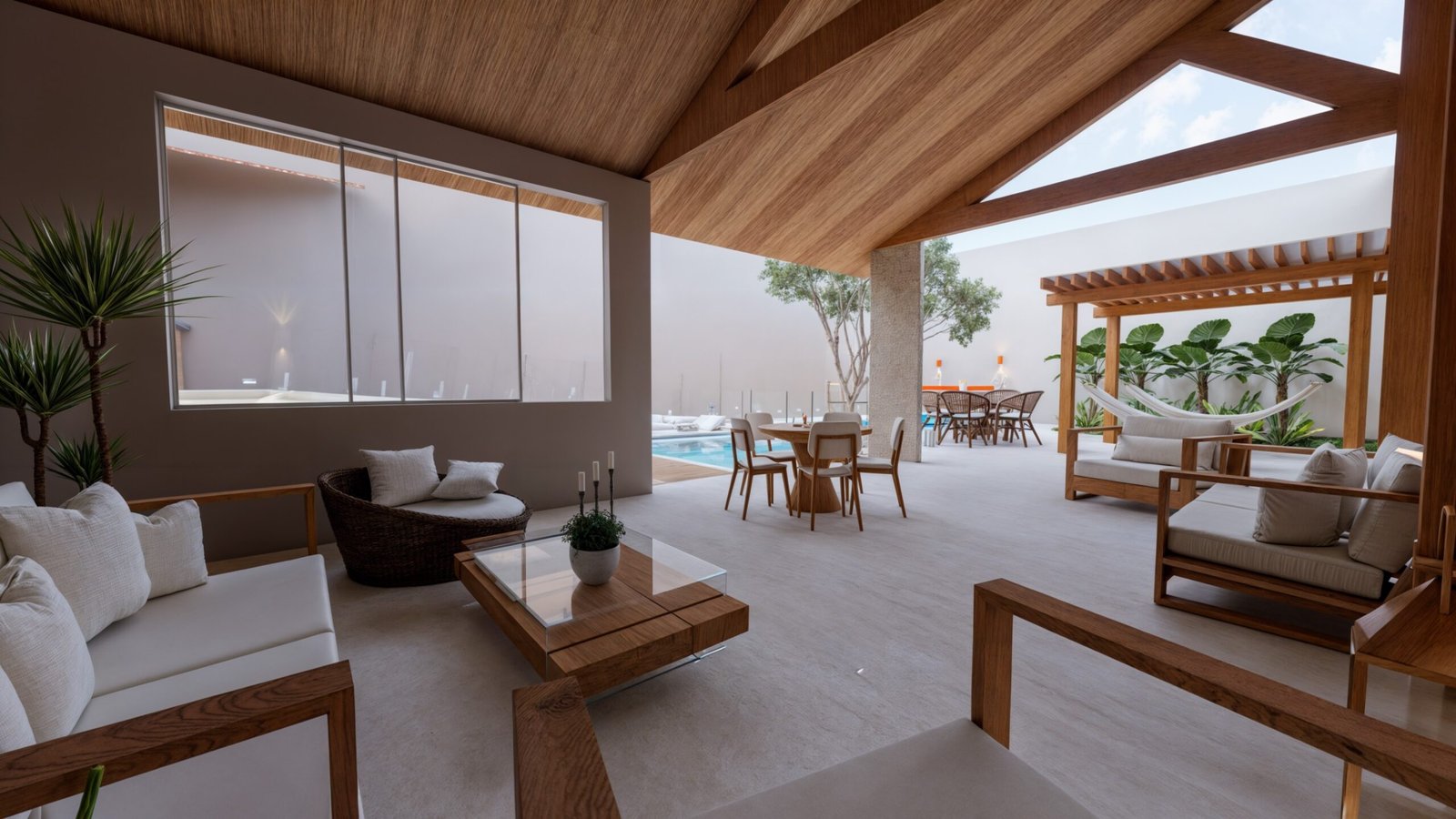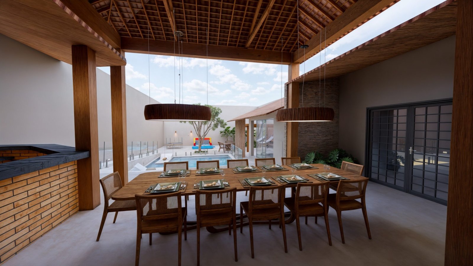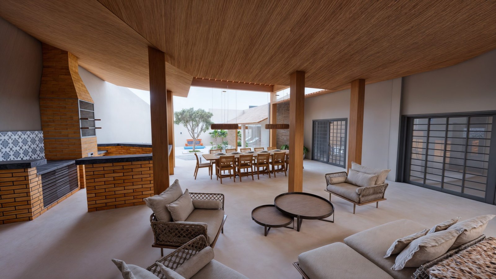 Para isso, aproveitei uma parte da edificação existente, mantendo uma área coberta, transformando-a em um lounge de descanso.