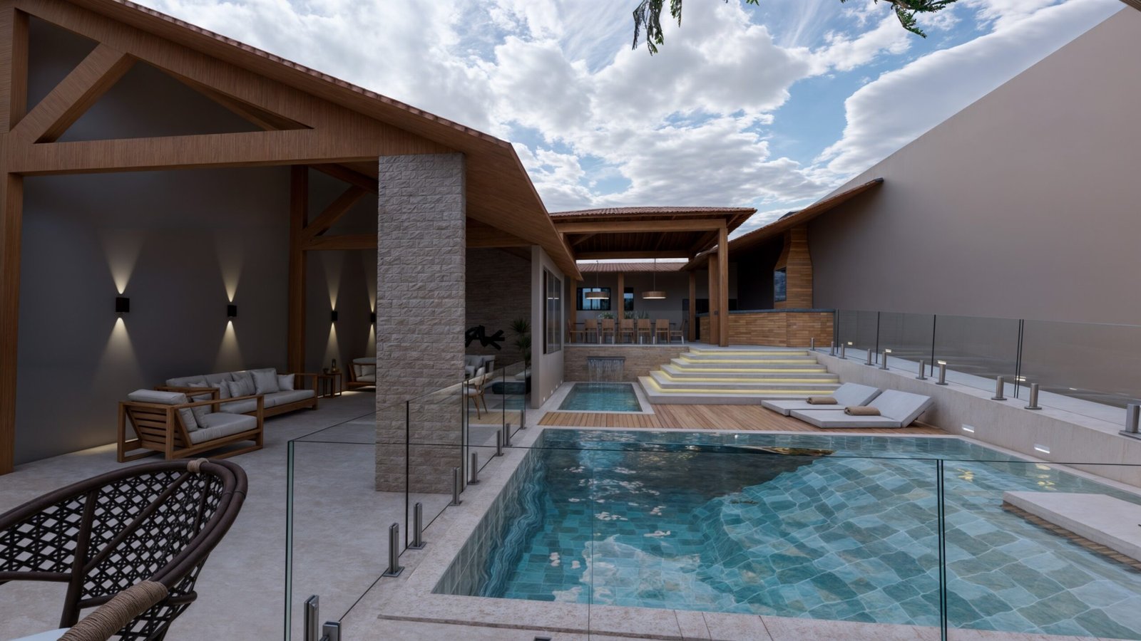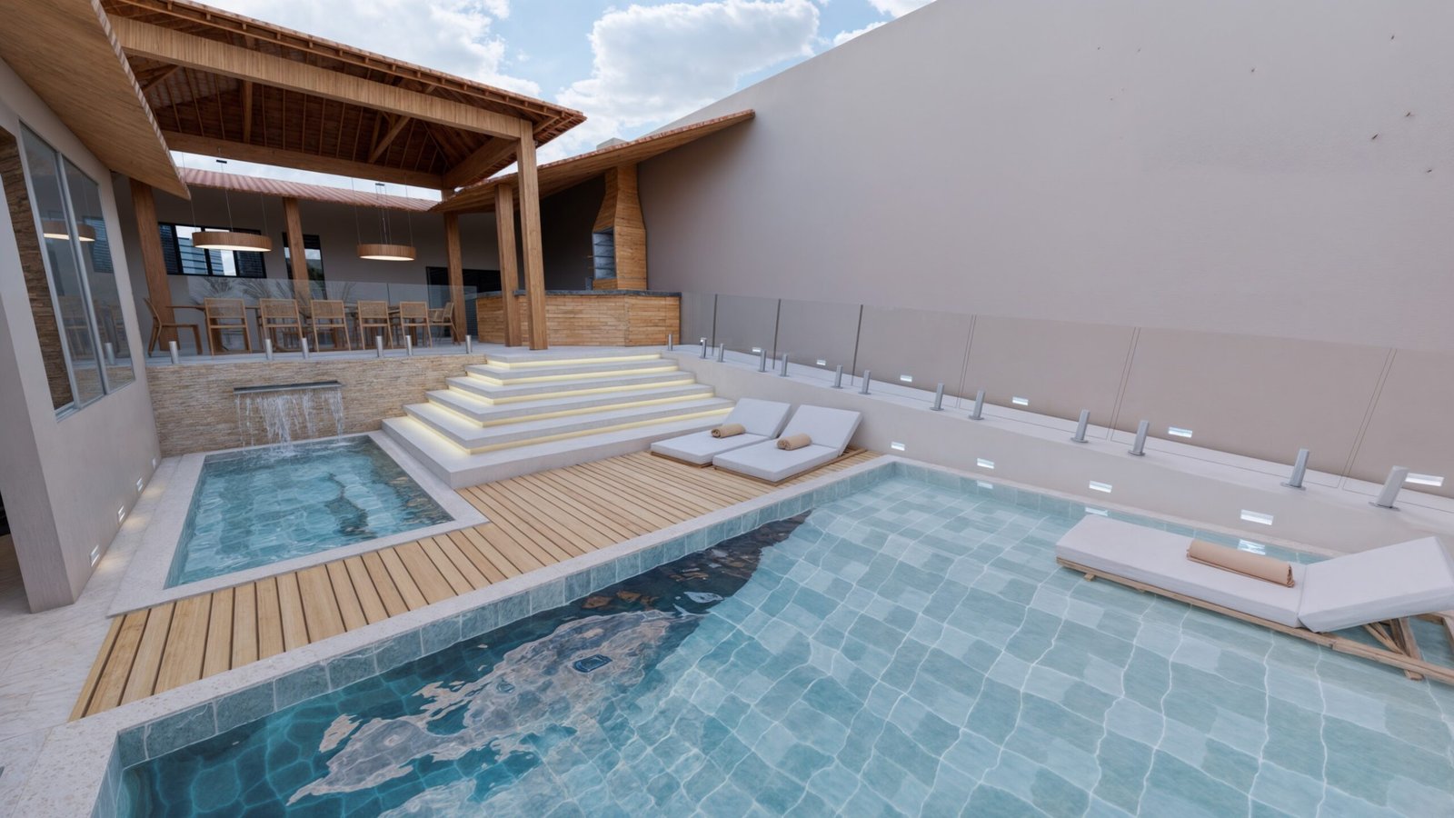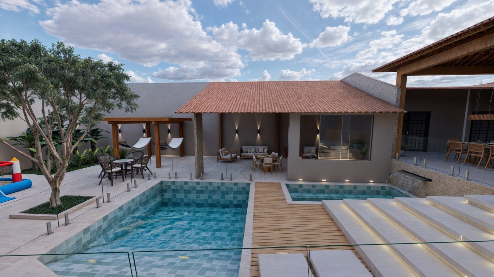 Próxima a área gourmet existente, criamos uma piscina com deck para as espreguiçadeiras. Ao lado da piscina, a escada com degraus maiores ameniza a altura do desnível entre o espaço gourmet e a área de lazer e evita espaços propícios a acidentes.