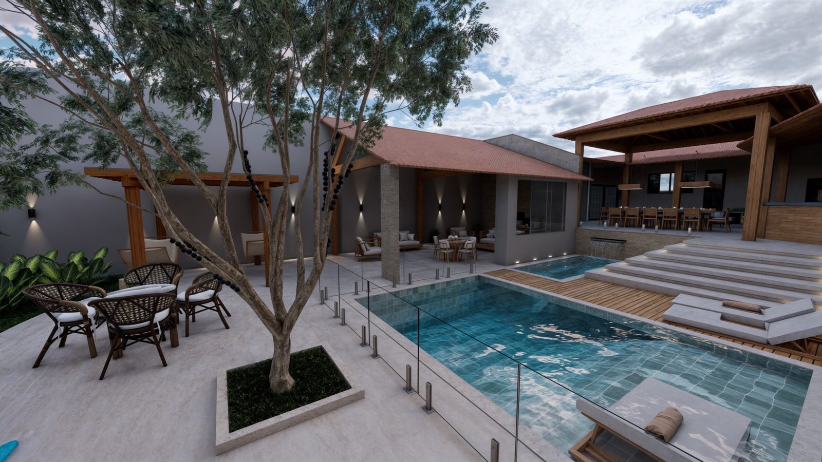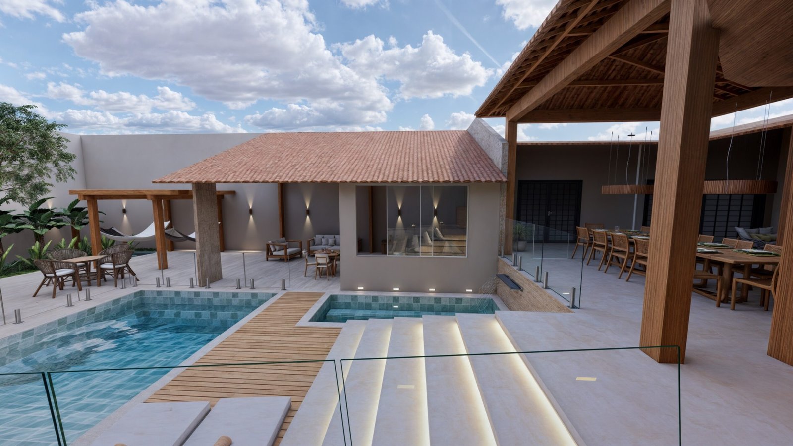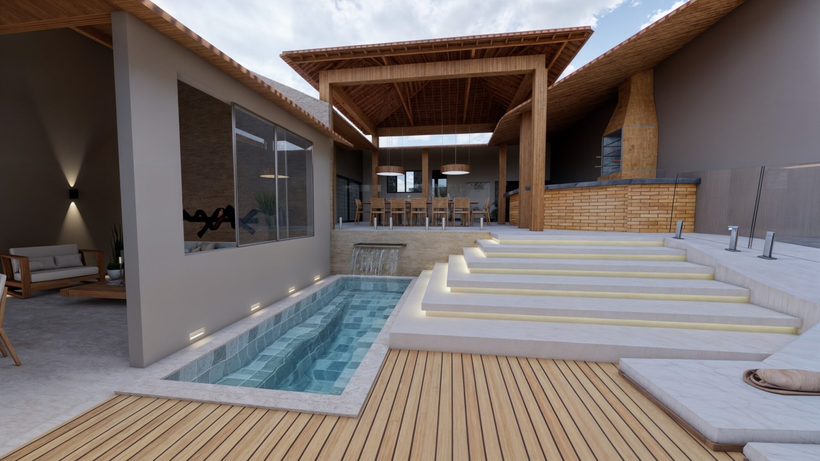 Próxima a área gourmet existente, criamos uma piscina com deck para as espreguiçadeiras. Ao lado da piscina, a escada com degraus maiores ameniza a altura do desnível entre o espaço gourmet e a área de lazer e evita espaços propícios a acidentes.
