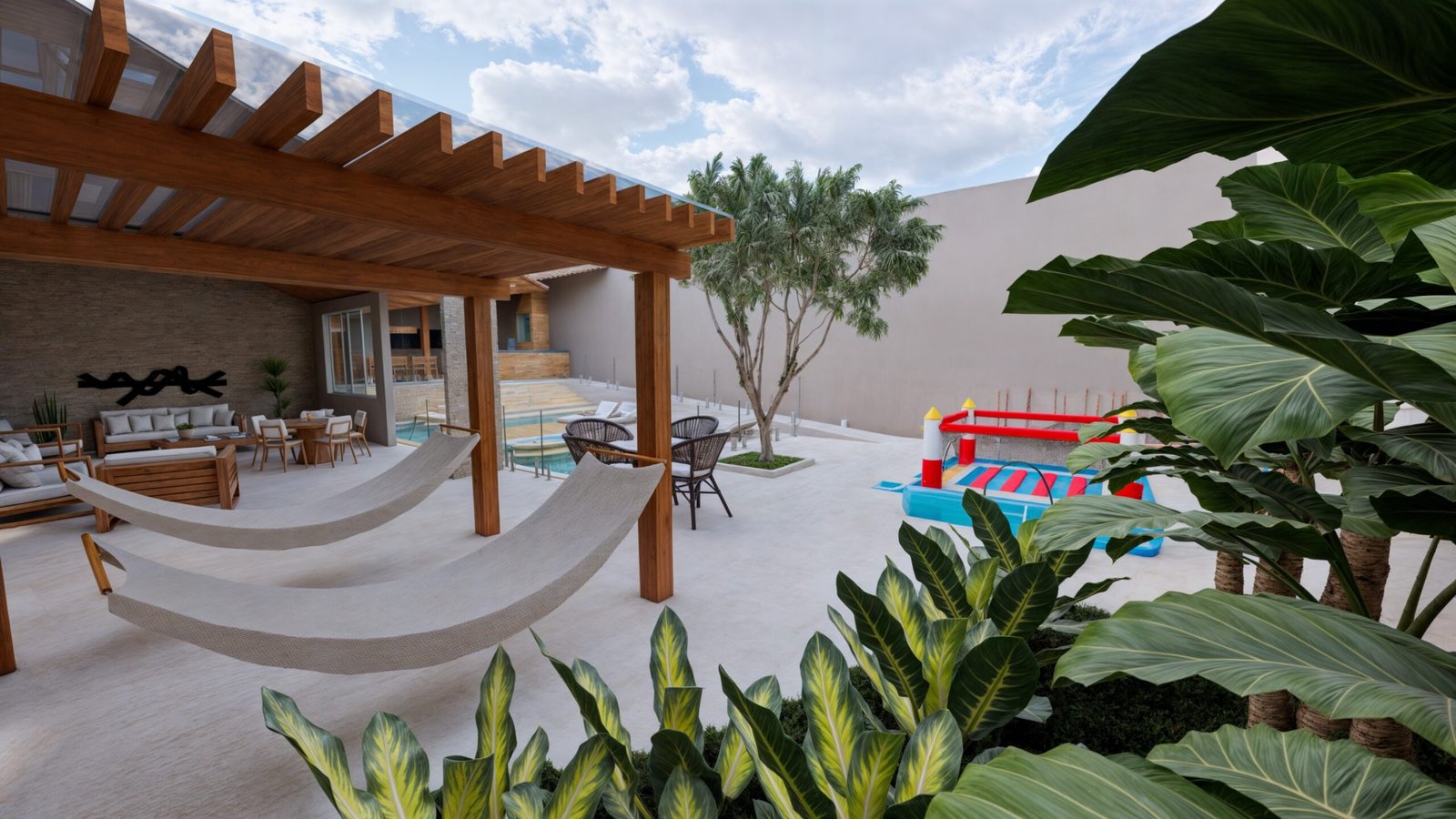 No fundo da área foi criado um espaço com paisagismo, um redário com pergolado e um espaço com brinquedos para as criança desfrutarem de bons momentos com muita diversão!!!