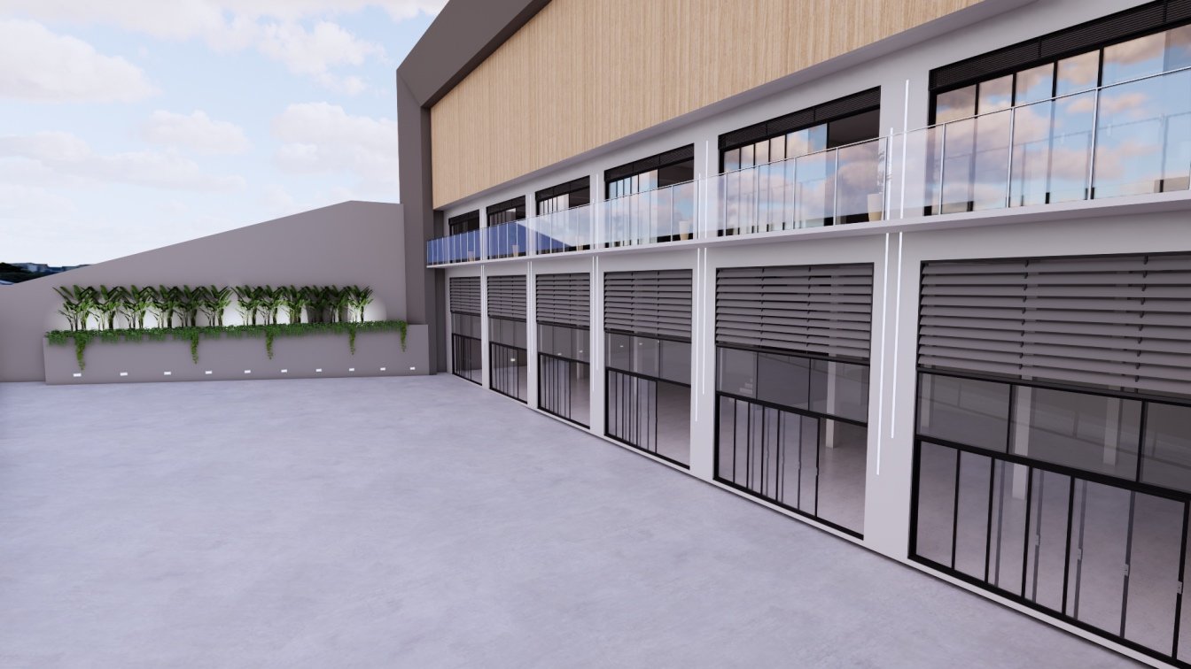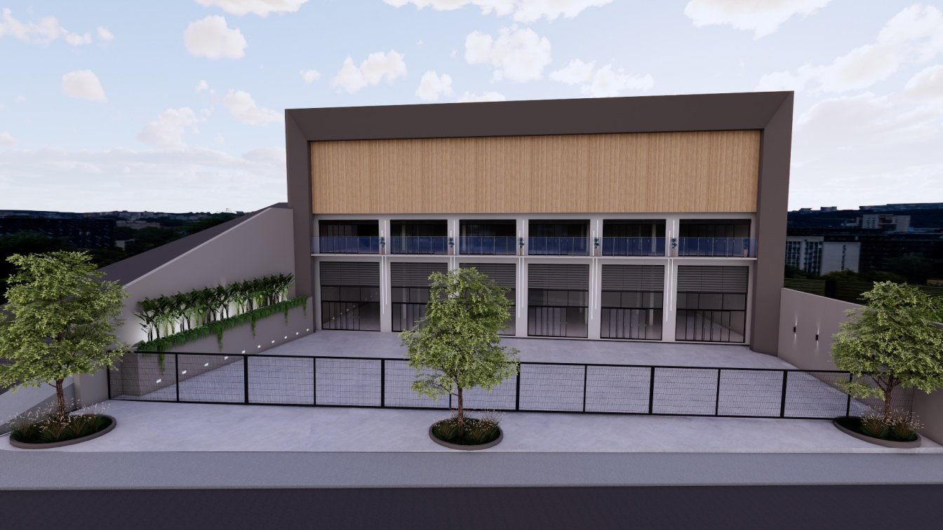 Neste terreno criamos um edifício misto, com um centro comercial, na frente, dando acesso para a avenida principal e apartamentos voltados para a rua local, na parte posterior do centro comercial.