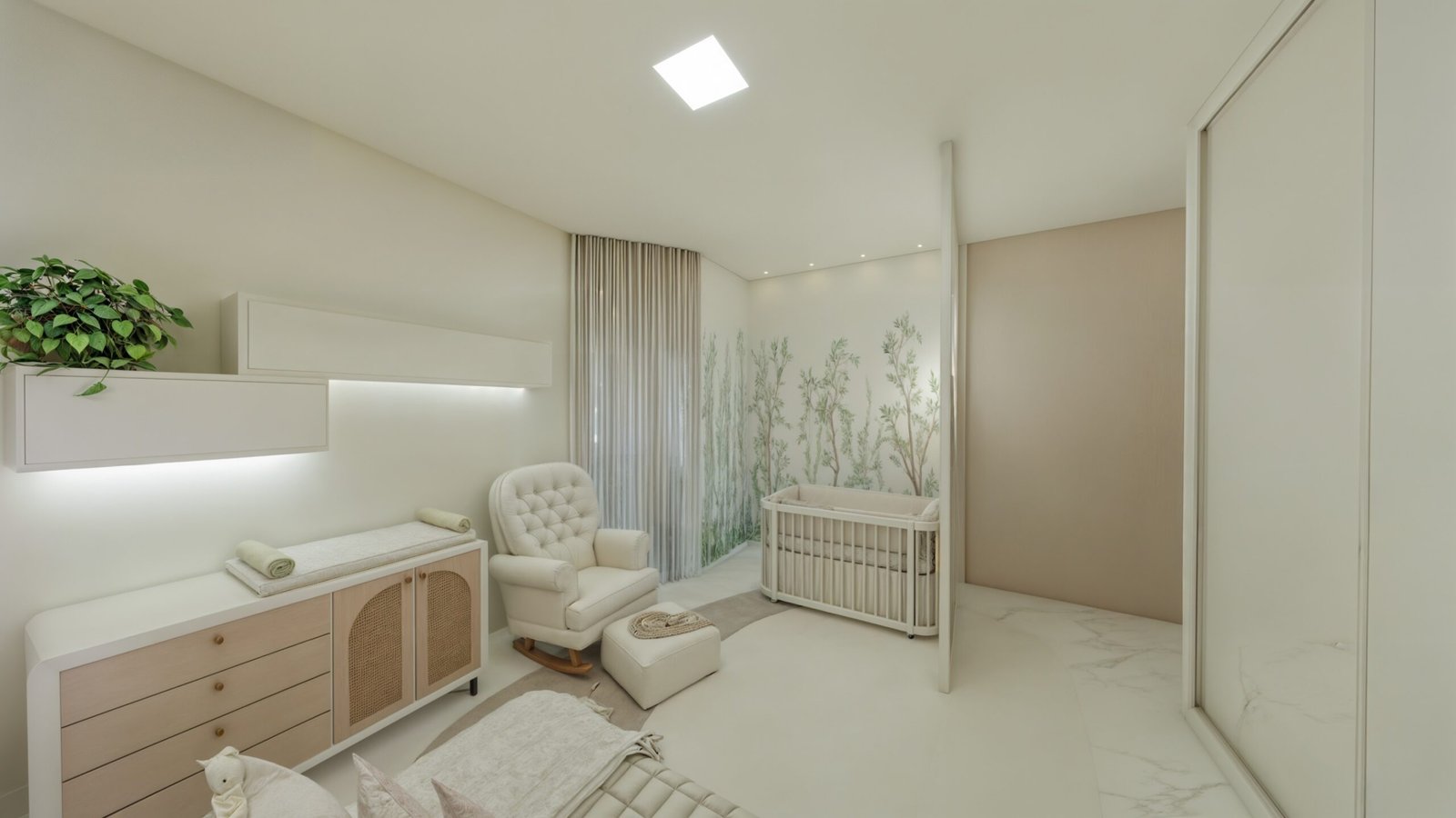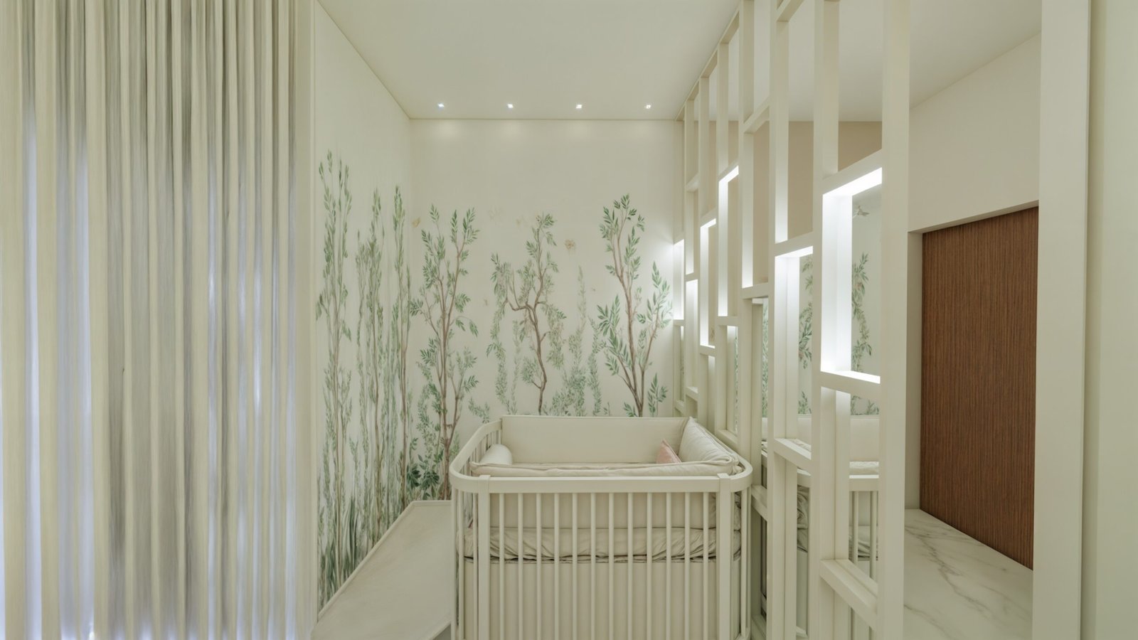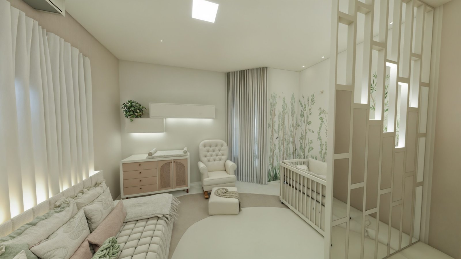 O espaço do berço foi delimitado de modo que quem entra no quarto não possui visão direta do bercinho e, sua localização, permite que a mamãe acesse os dois lados do móvel, para facilitar os cuidados com a bebê. Portanto, atrás do berço há um biombo planejado, com iluminação suave de Led, em estrutura quadriculada de MDF, na qual, em alguns quadrantes, há espelhos centrais, com espessura maior, como fechamento. Este biombo reserva a privacidade do quarto e permite delimitar o espaço do berço, com uma iluminação difusa. Nas duas paredes laterais ao berço foi inserido um papel de parede que remete a um bosque encantado!