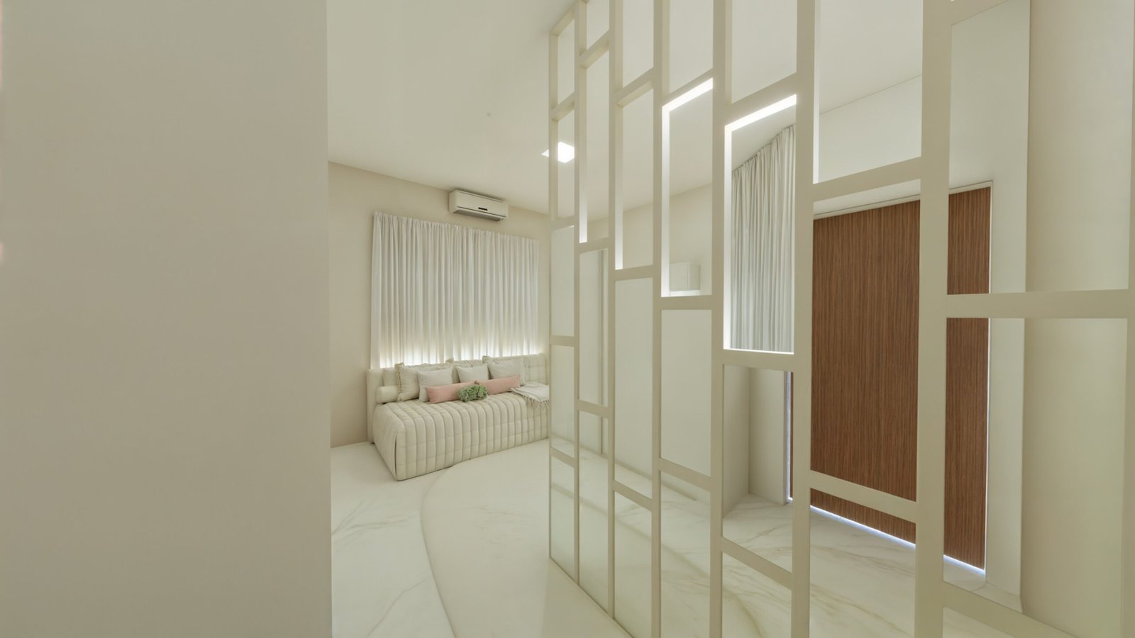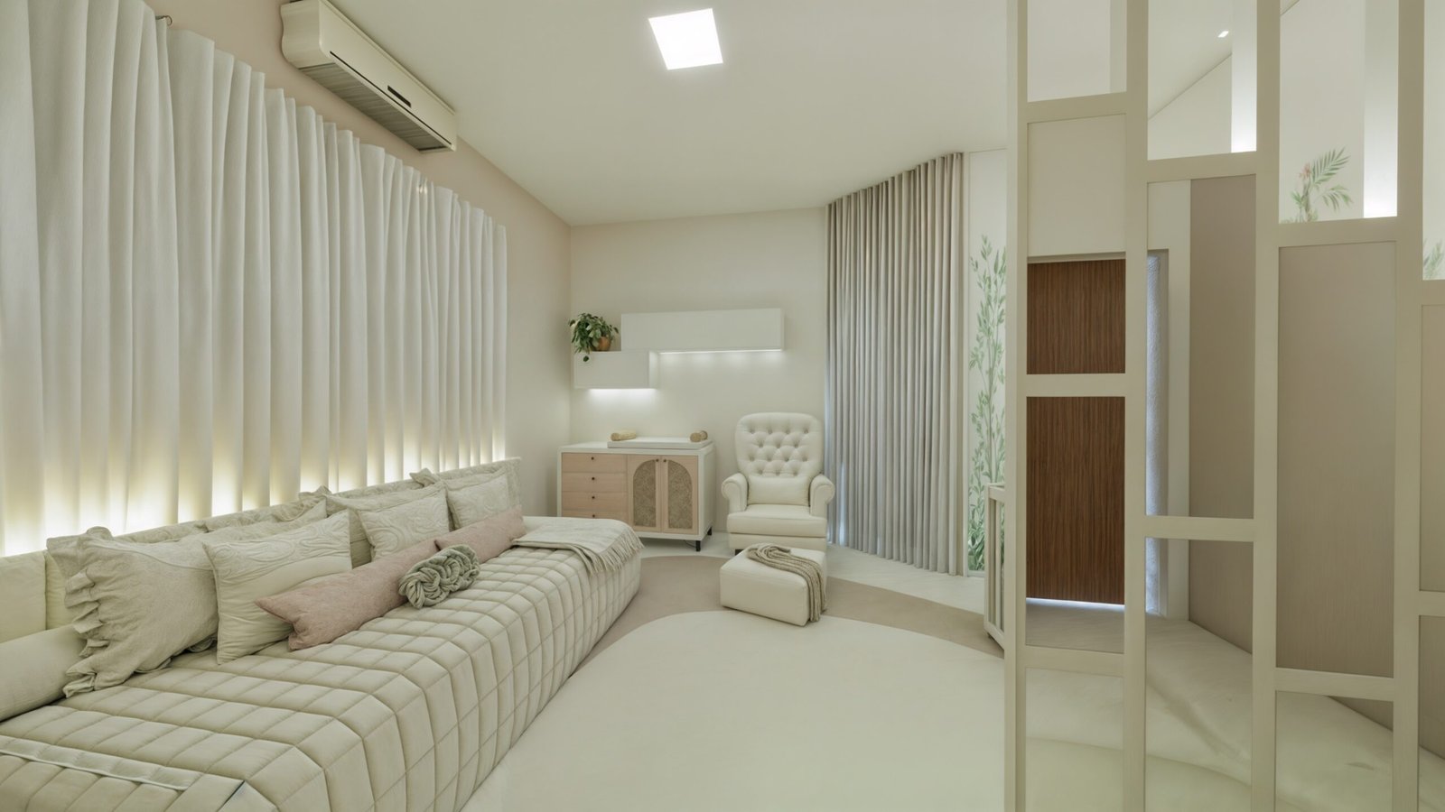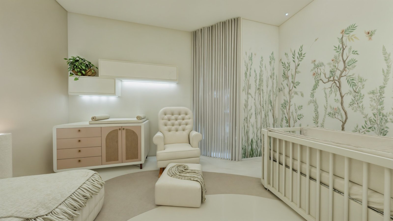 O espaço do berço foi delimitado de modo que quem entra no quarto não possui visão direta do bercinho e, sua localização, permite que a mamãe acesse os dois lados do móvel, para facilitar os cuidados com a bebê. Portanto, atrás do berço há um biombo planejado, com iluminação suave de Led, em estrutura quadriculada de MDF, na qual, em alguns quadrantes, há espelhos centrais, com espessura maior, como fechamento. Este biombo reserva a privacidade do quarto e permite delimitar o espaço do berço, com uma iluminação difusa. Nas duas paredes laterais ao berço foi inserido um papel de parede que remete a um bosque encantado!