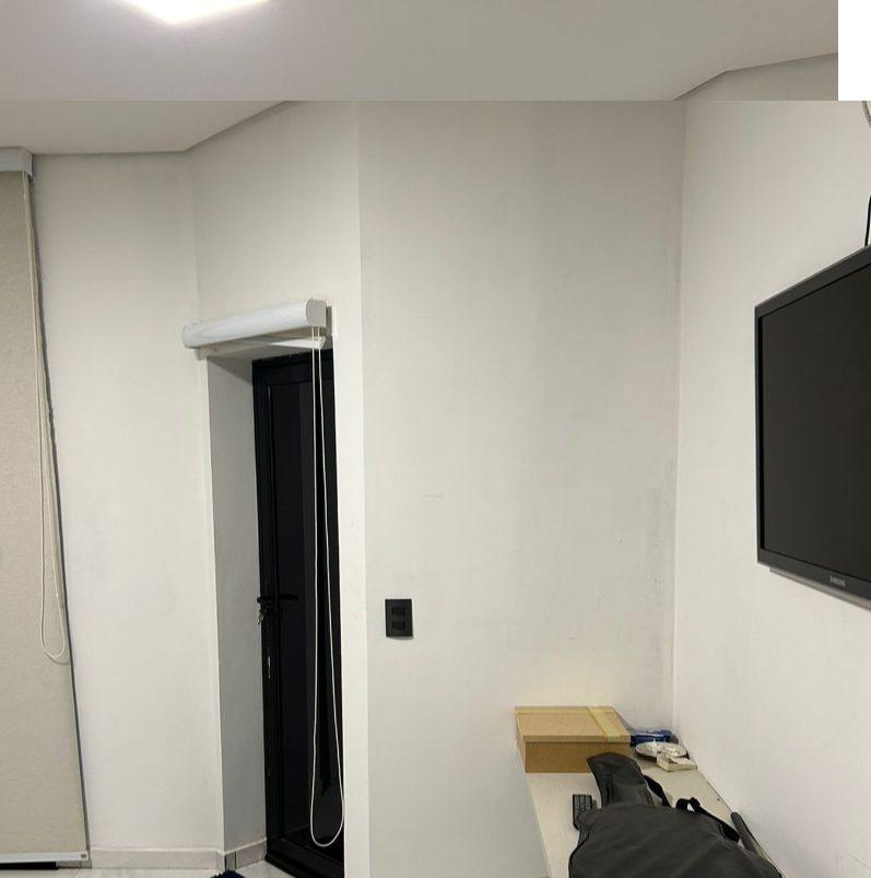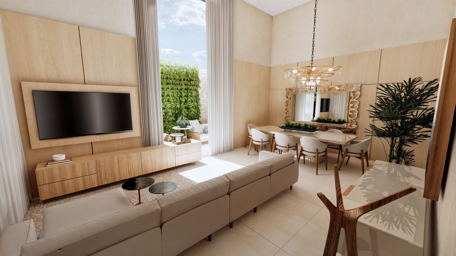Inicialmente, meus queridos clientes gostariam de aplicar algum porcelanato em uma das paredes. Porém, já há a aplicação de pedras na fachada, que fica ao lado desta sala…E pensando em um conforto maior, bem como em uma maior funcionalidade, sugeri uma readequação do layout, a fim de setorizar melhor o ambiente, além de propor também o uso da marcenaria, que é um material mais “quente” e mais propício para a finalidade do ambiente, considerando o tamanho do pé direito, a dimensão do espaço e as particularidades apresentadas pelos clientes.