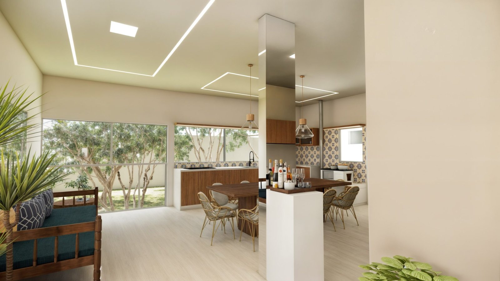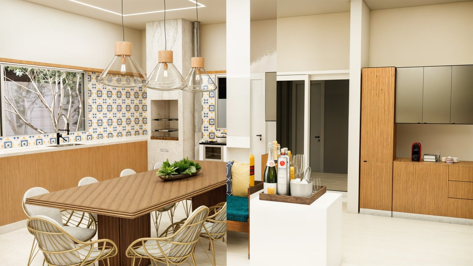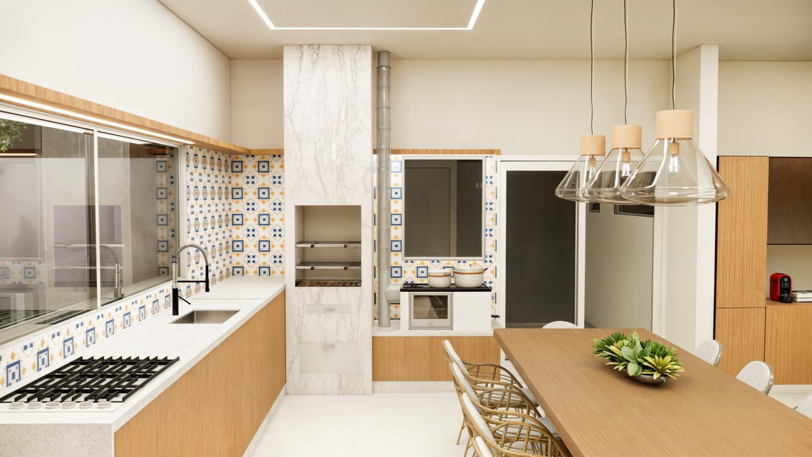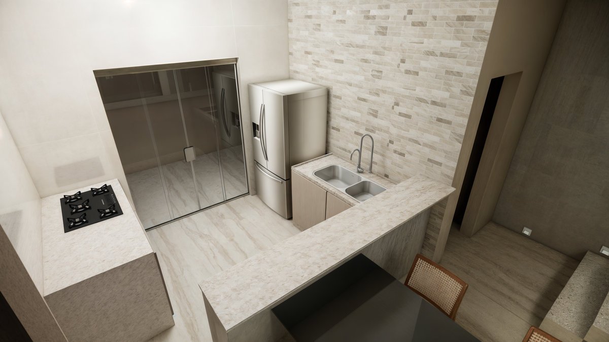 • Integração e Ampliação: Incorporamos a varanda existente ao corpo da casa, ampliando os espaços, especialmente a cozinha gourmet, tornando-a mais funcional e confortável.