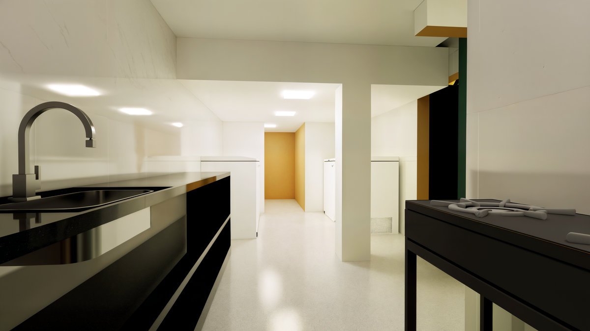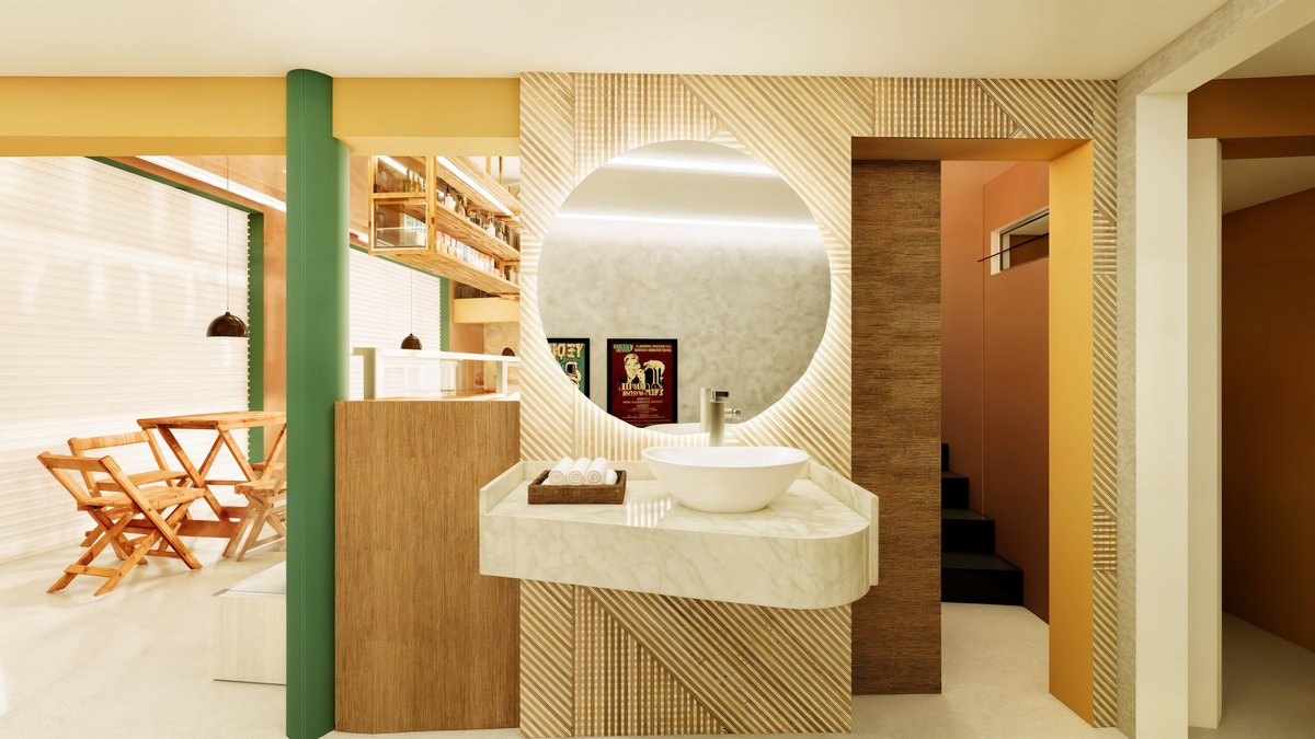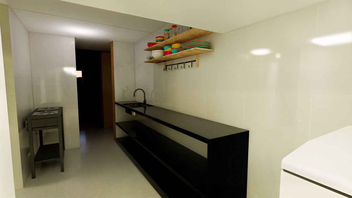 Também foram incluídos dois quartos, sendo uma suíte, oferecendo conforto e privacidade para a moradora.