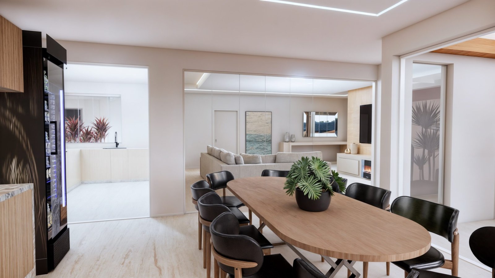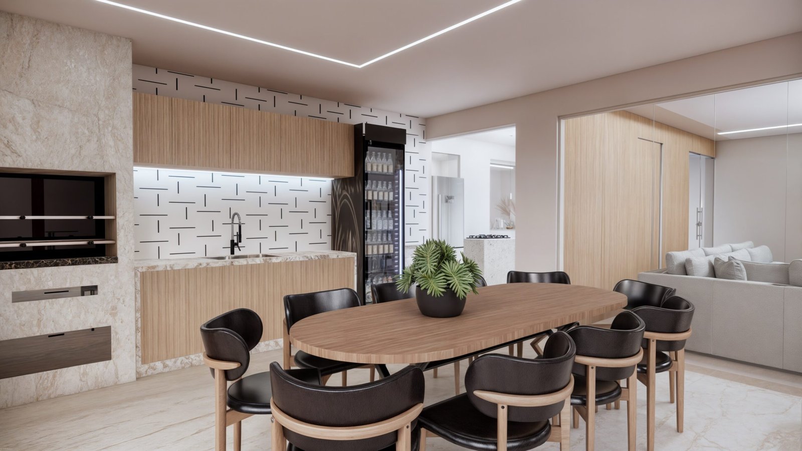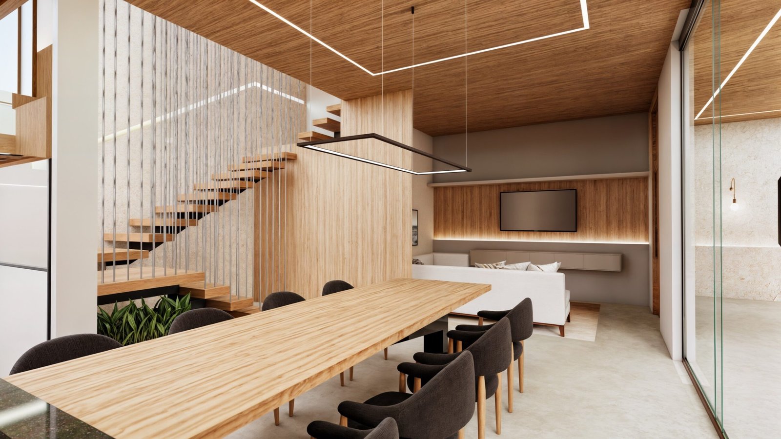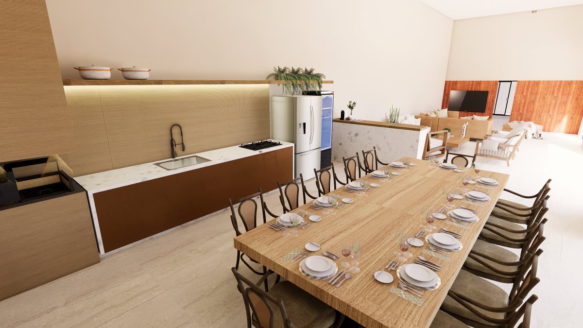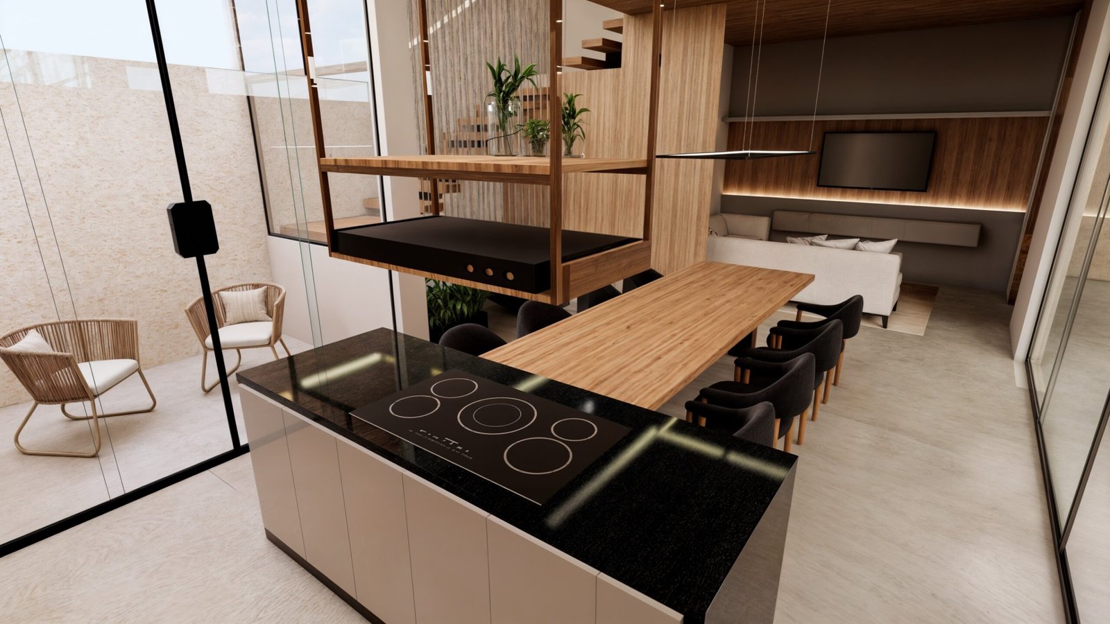Uma residência com ambientes sociais integrados, muito bem distribuídos e setorizados.
