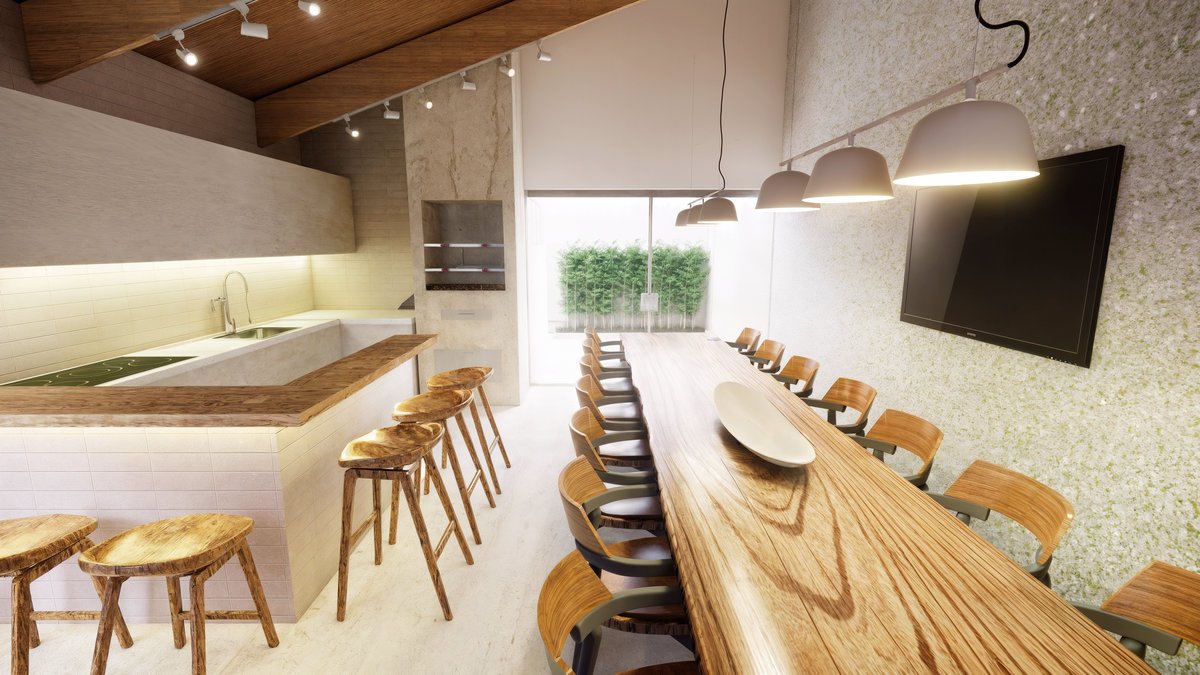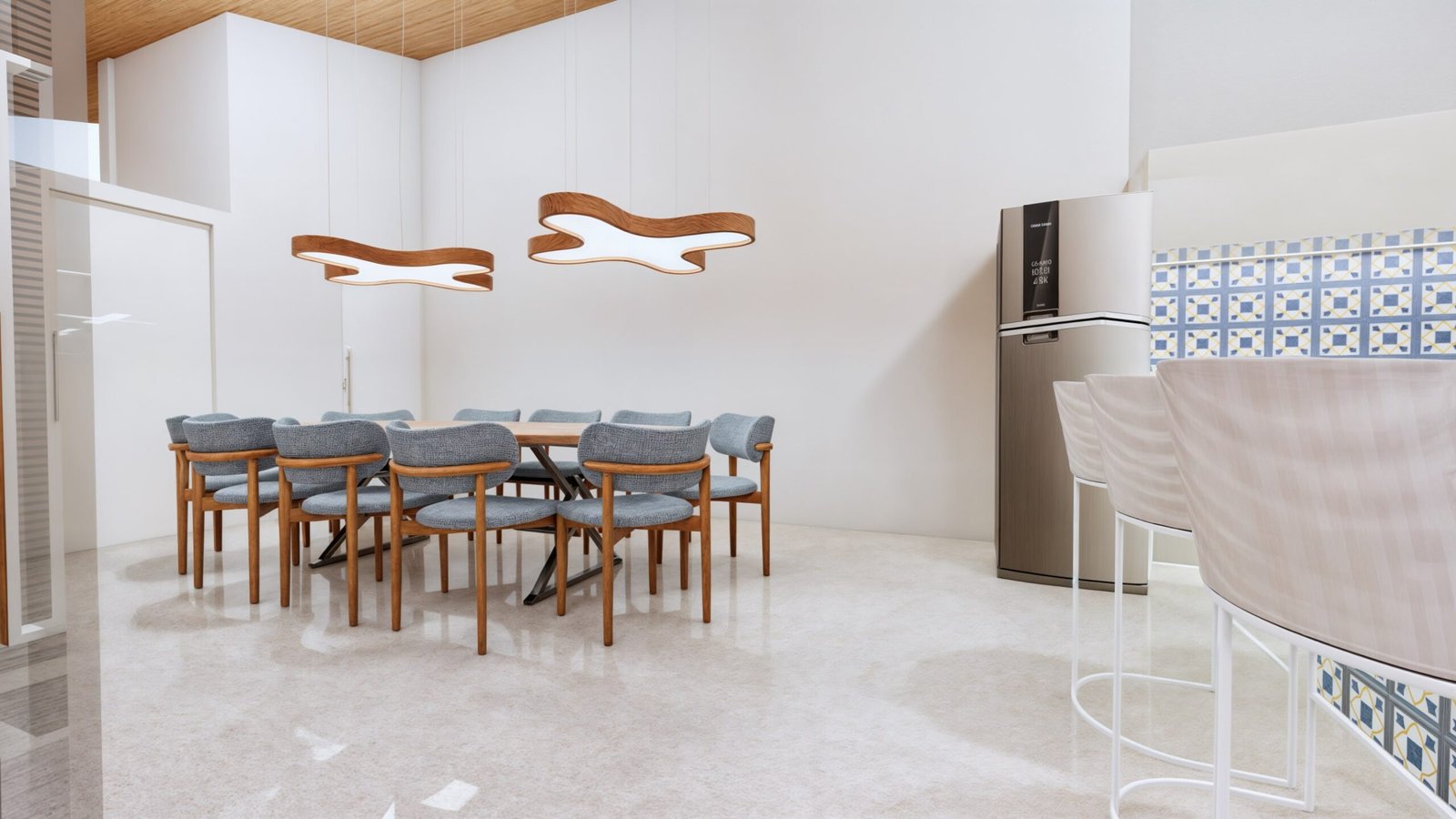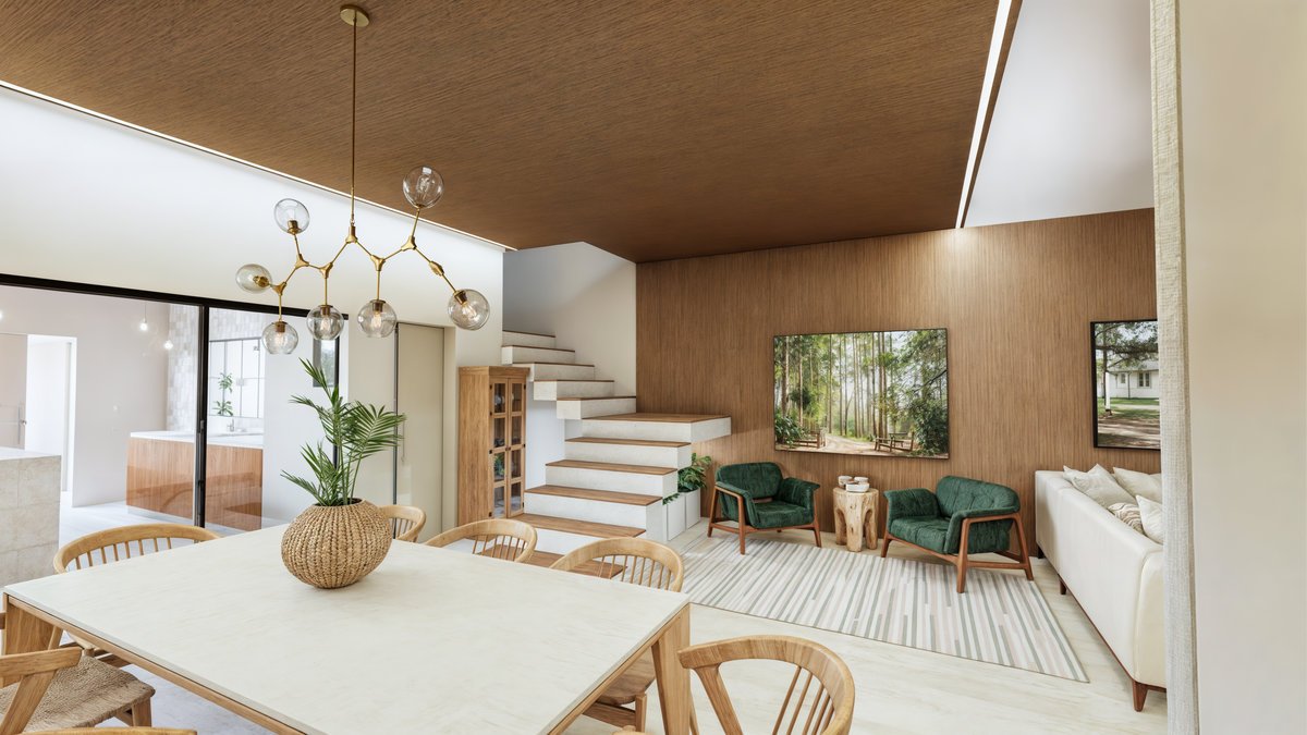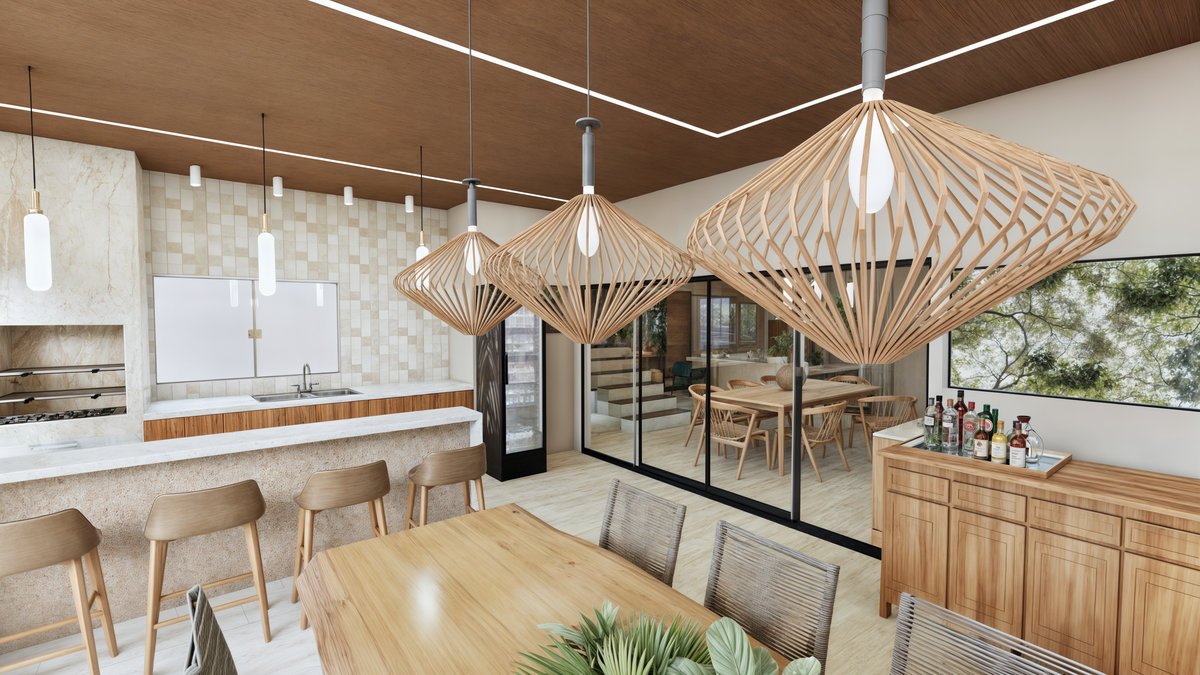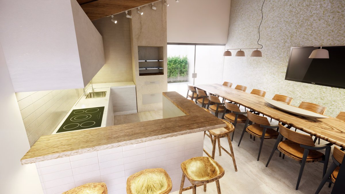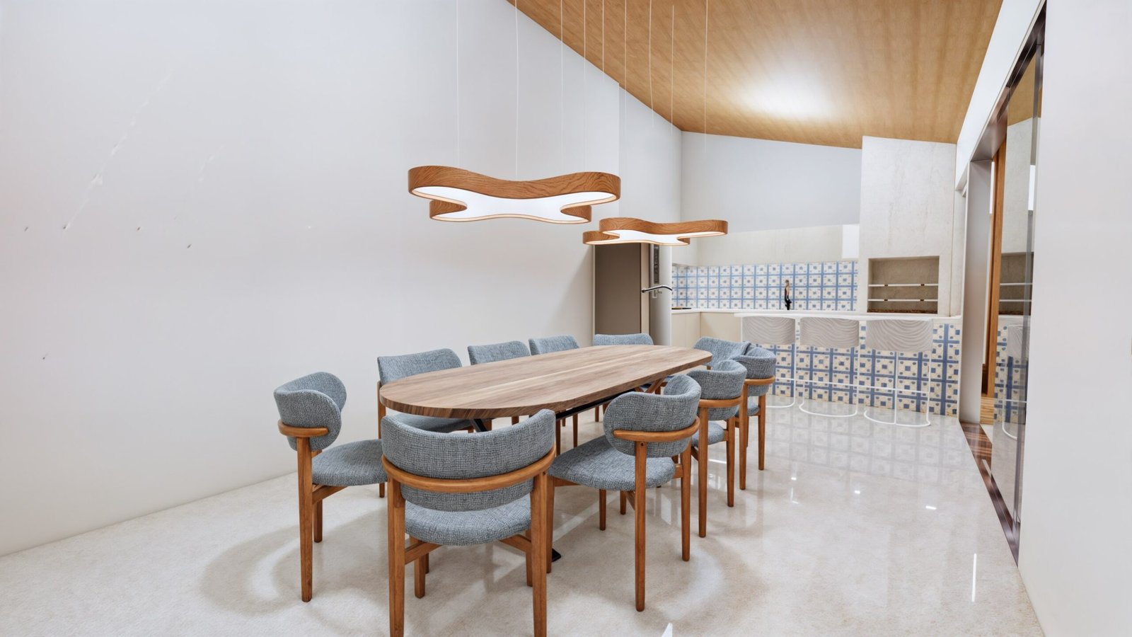 Uma residência com ambientes sociais integrados, muito bem distribuídos e setorizados.