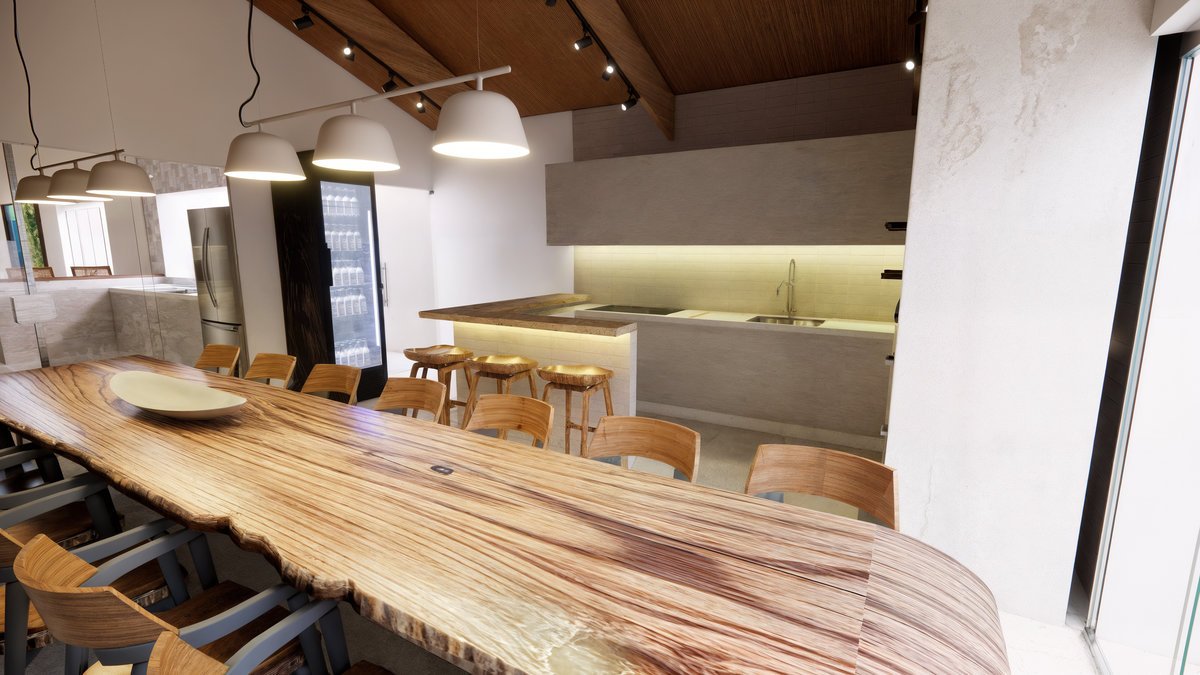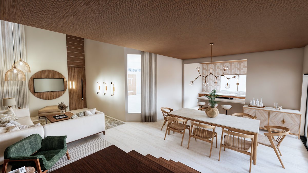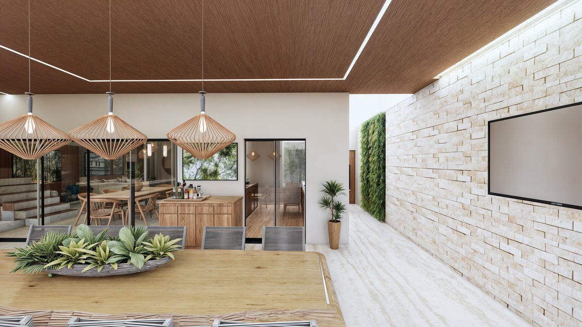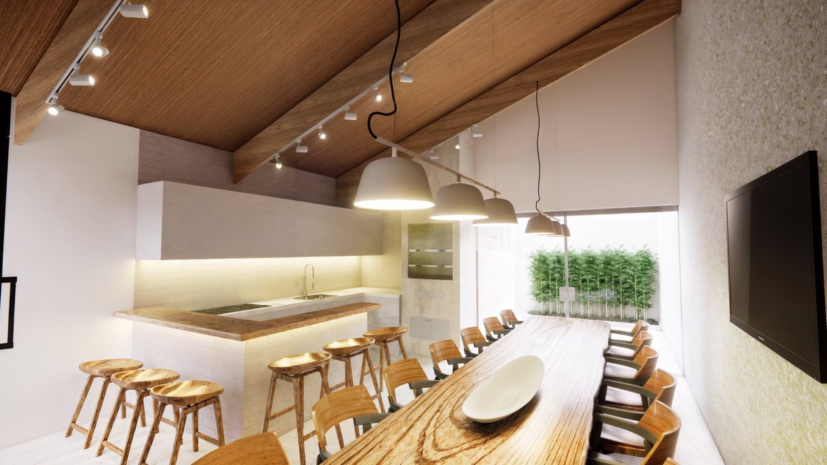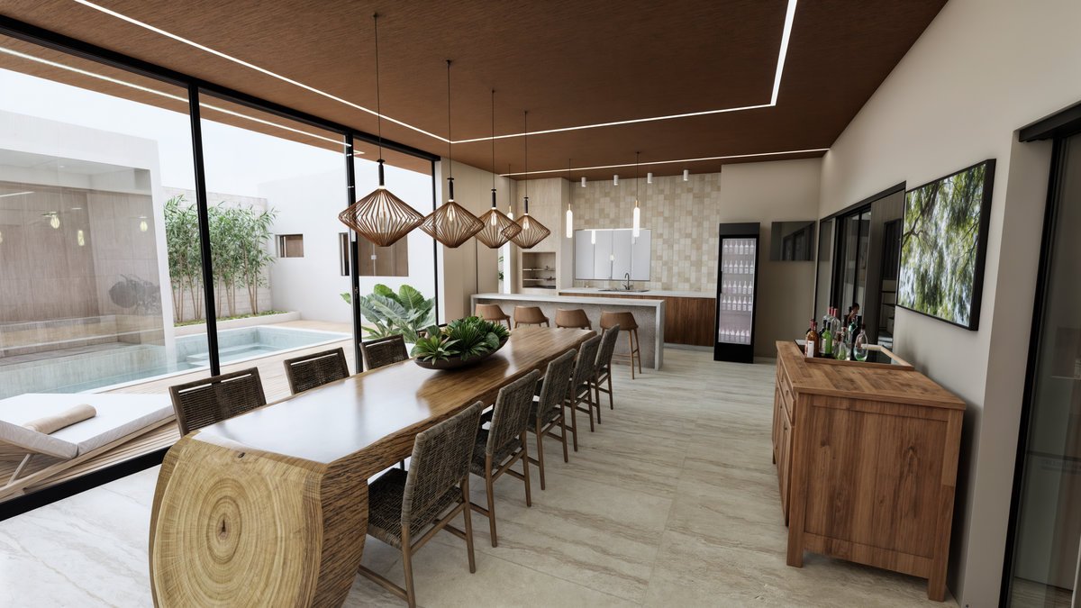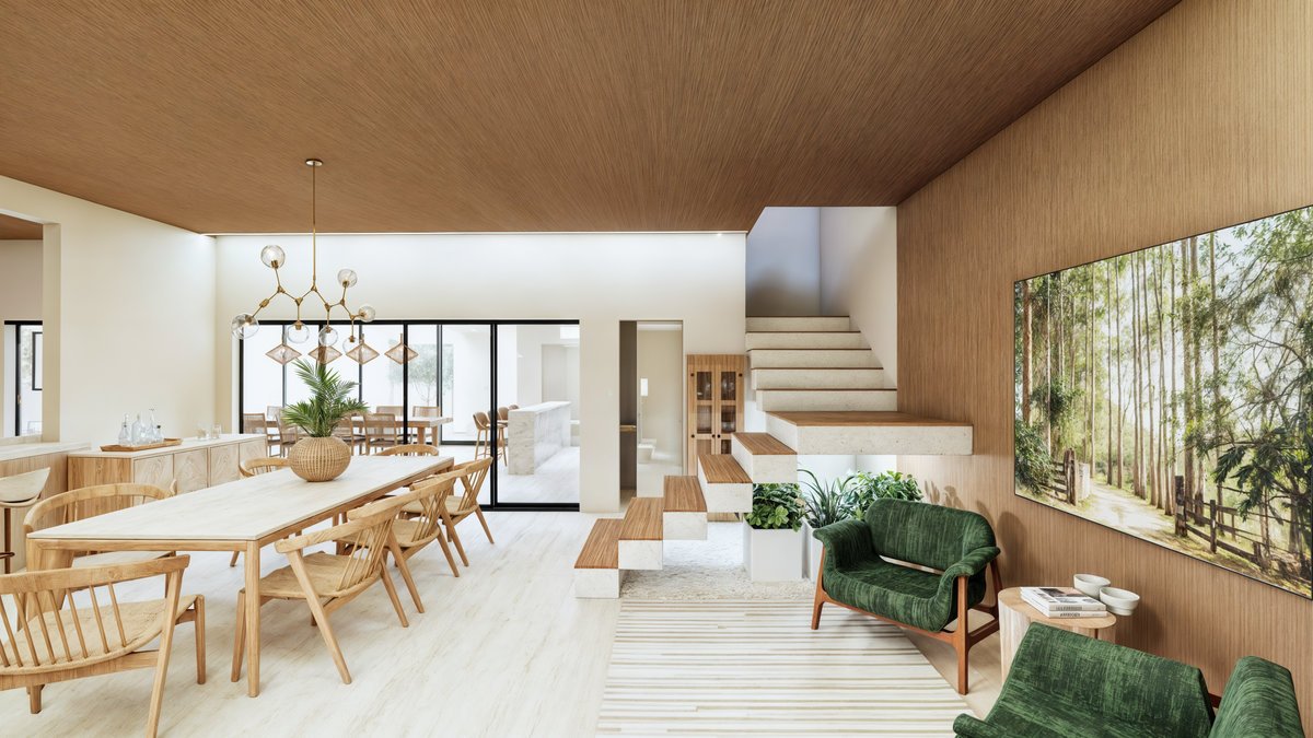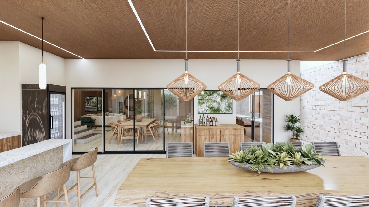 Uma residência com ambientes sociais integrados, muito bem distribuídos e setorizados.