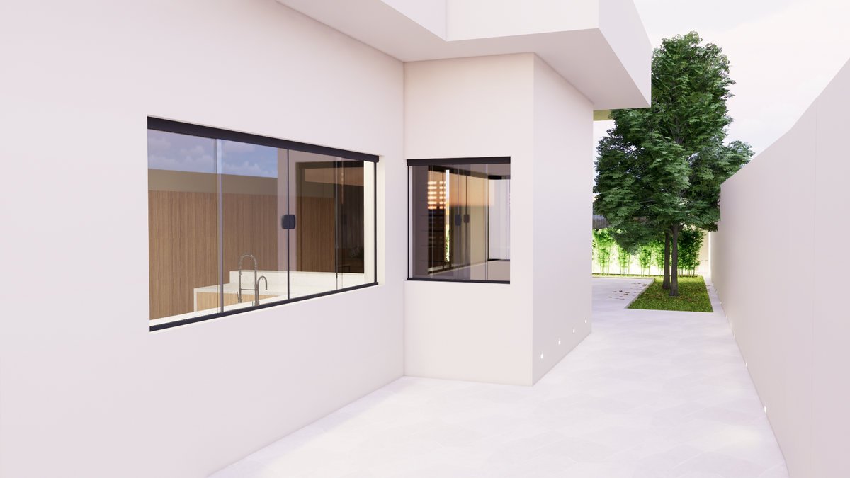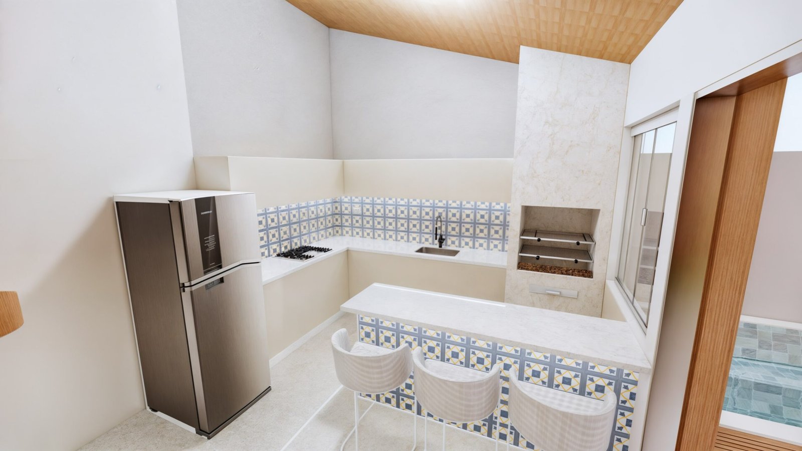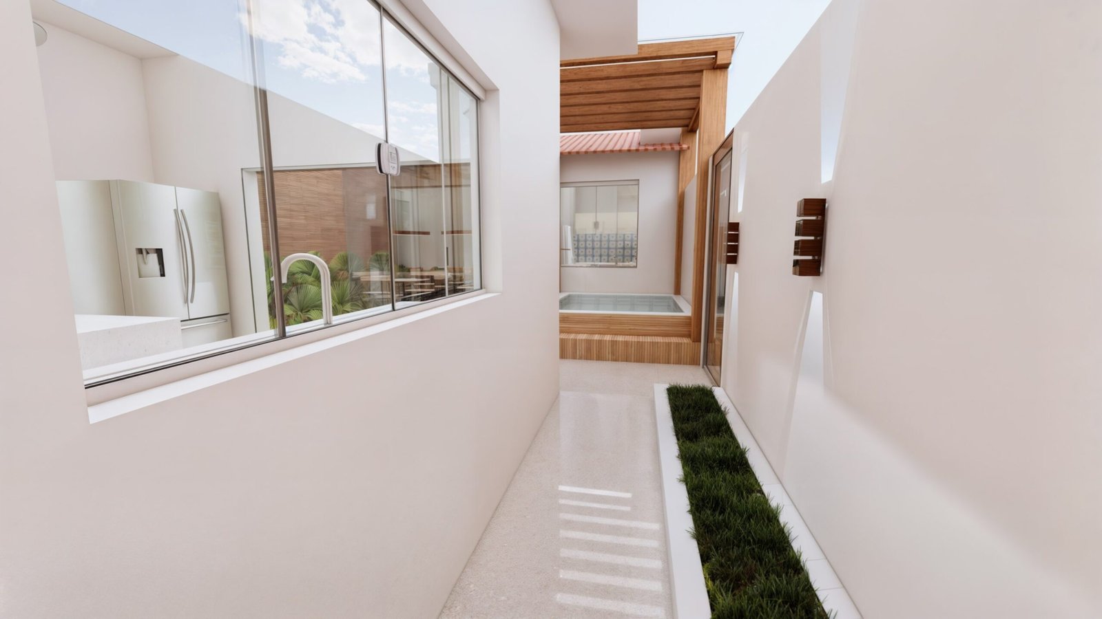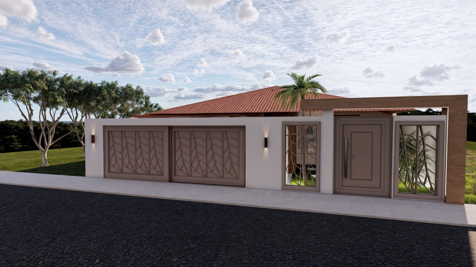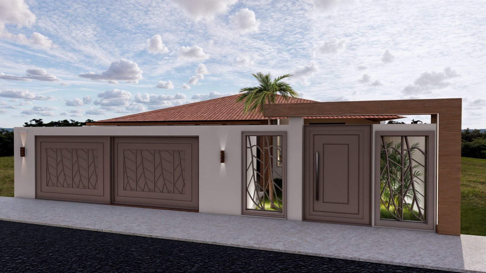 A solicitação dos nossos clientes era uma casa com três quartos, sendo uma suíte, sala integrada, cozinha, espaço gourmet e lavanderia.