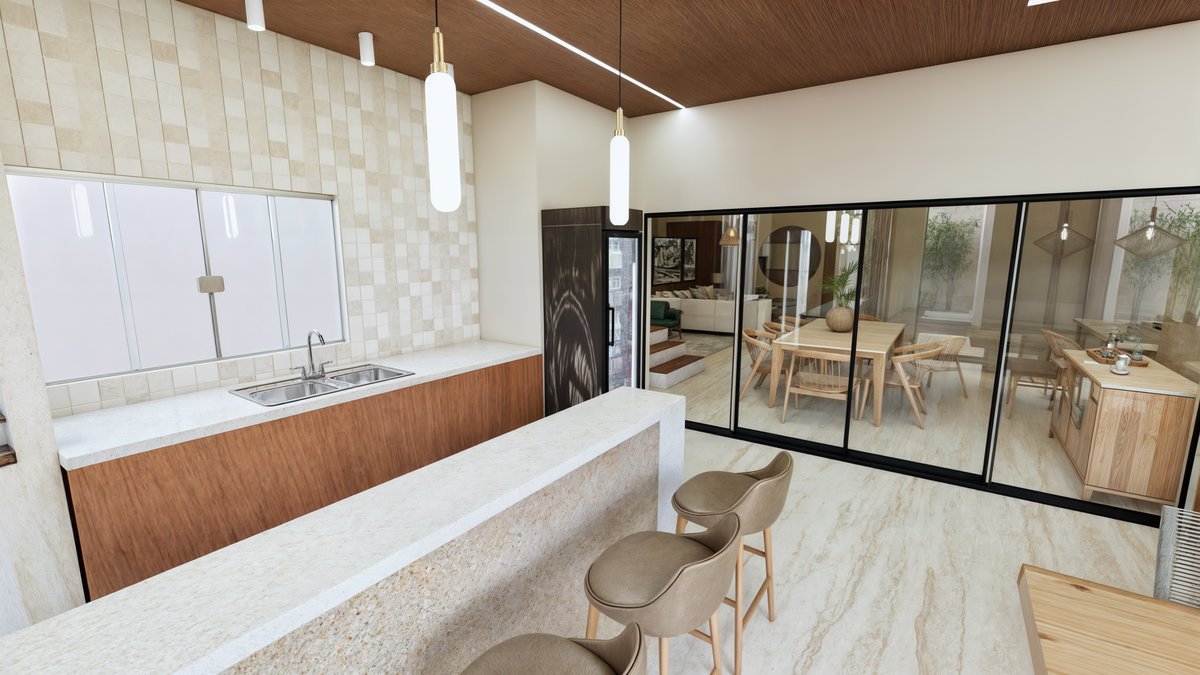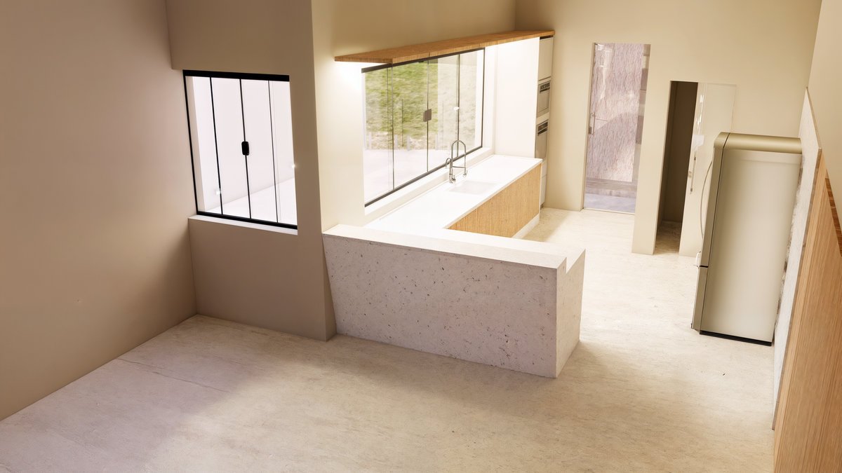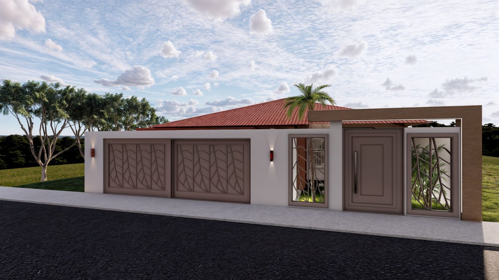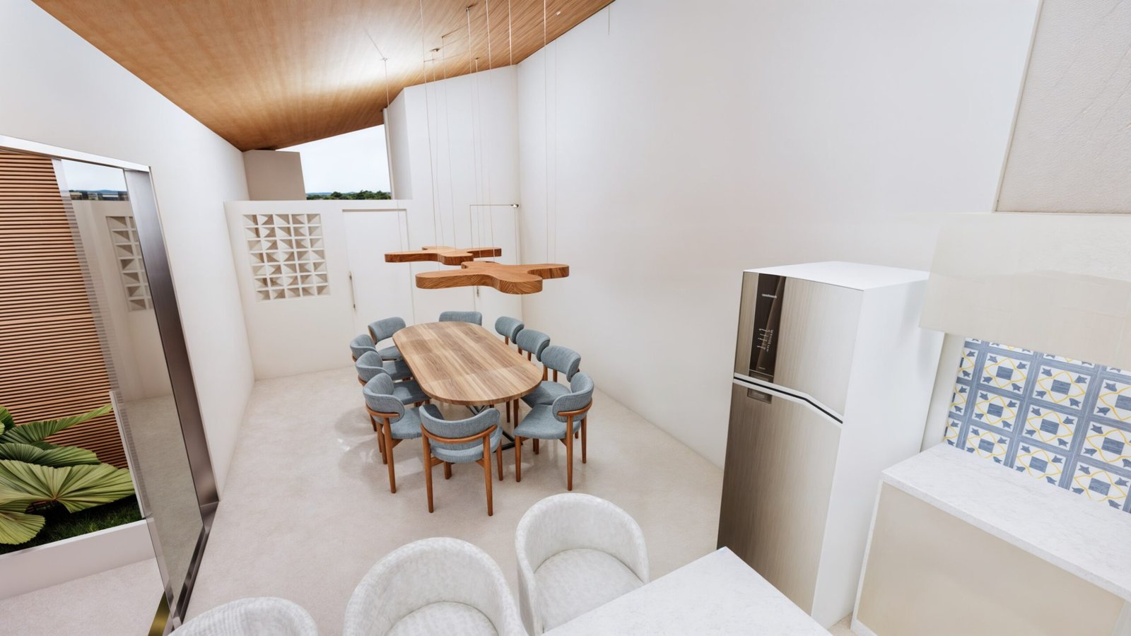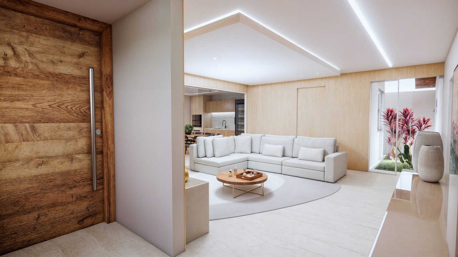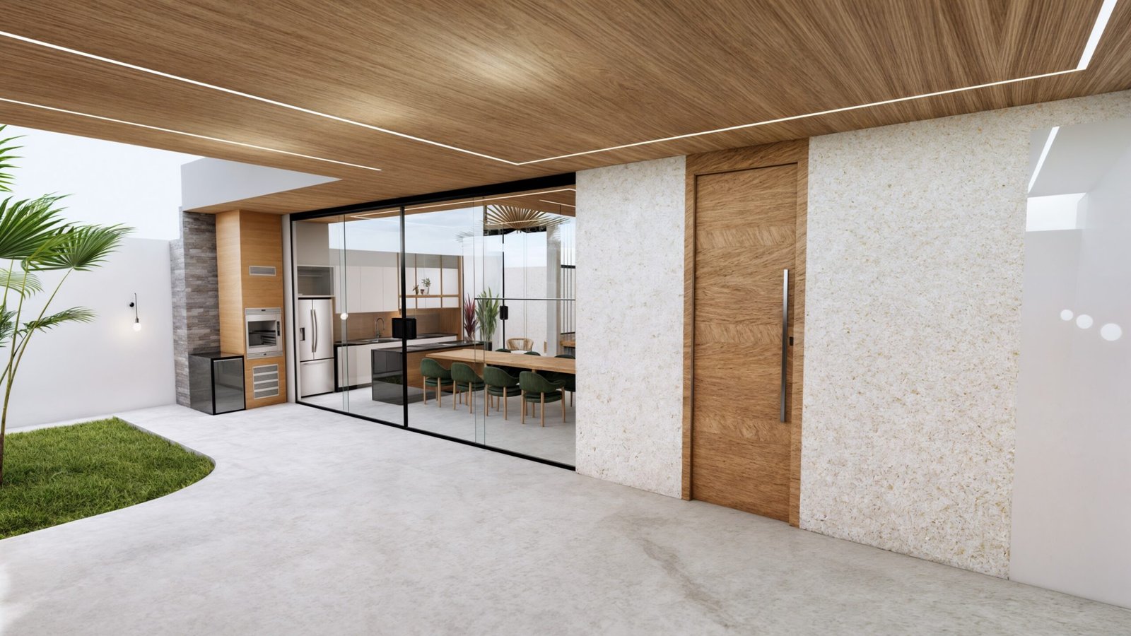 A solicitação dos nossos clientes era uma casa com três quartos, sendo uma suíte, sala integrada, cozinha, espaço gourmet e lavanderia.