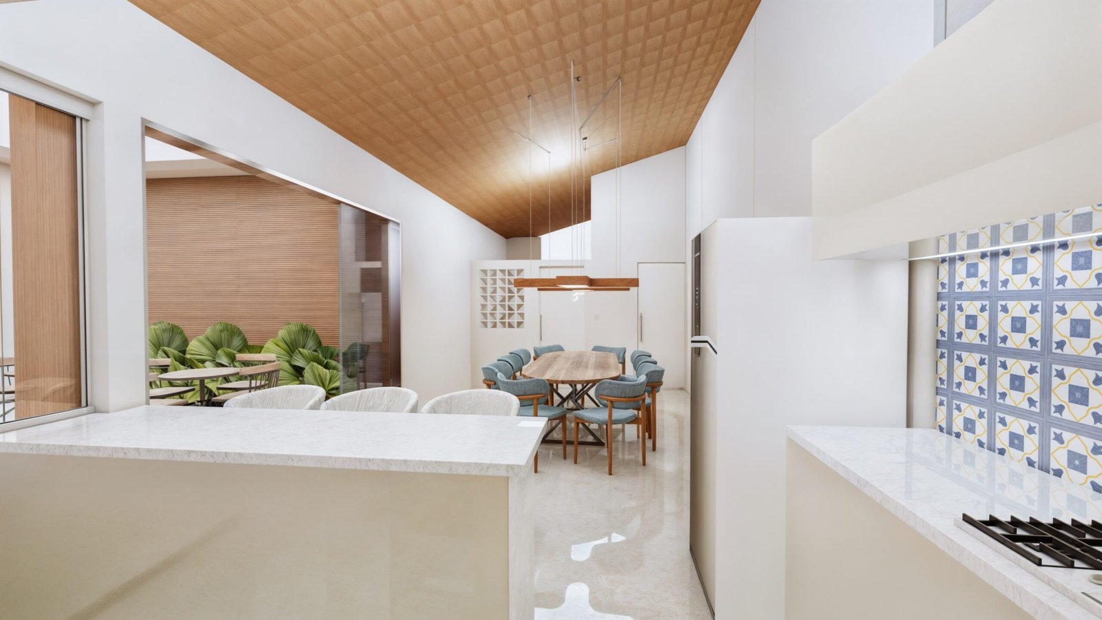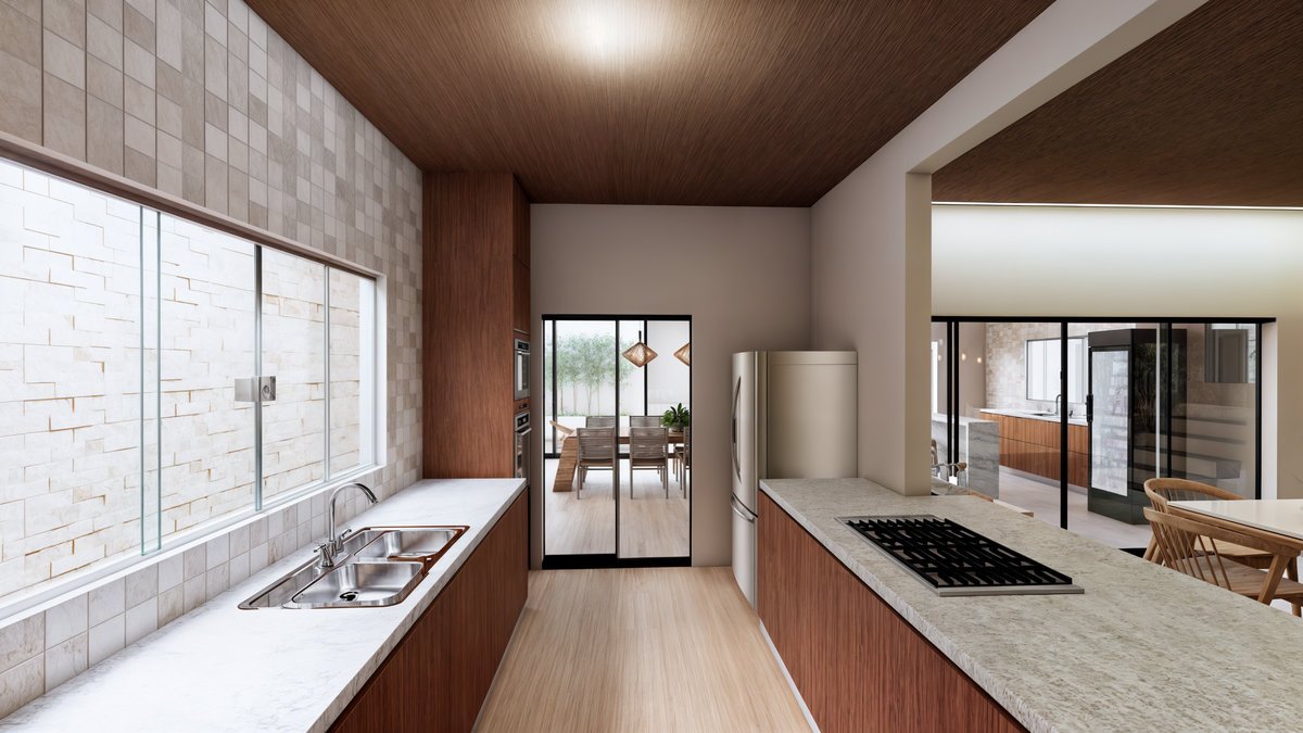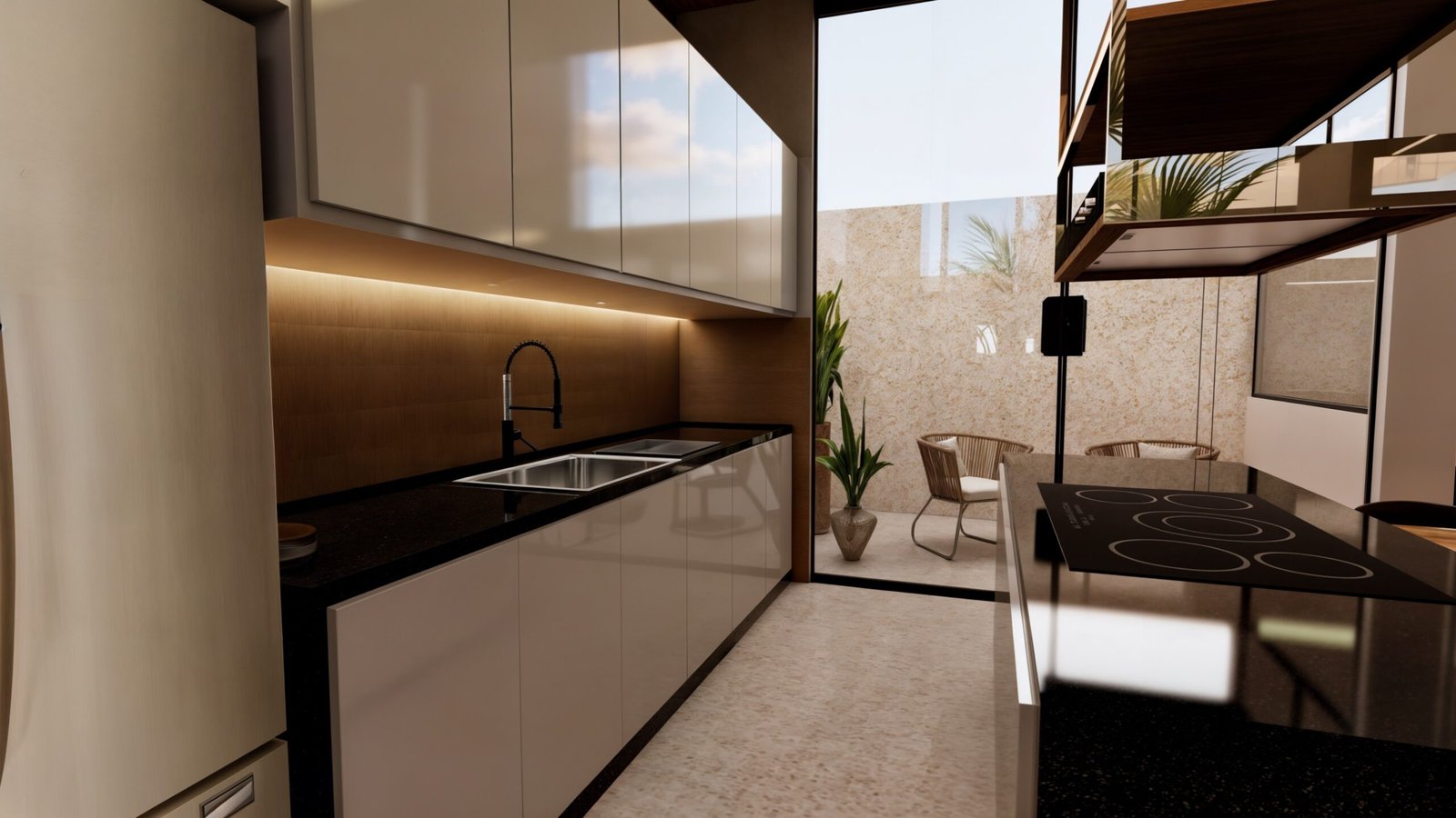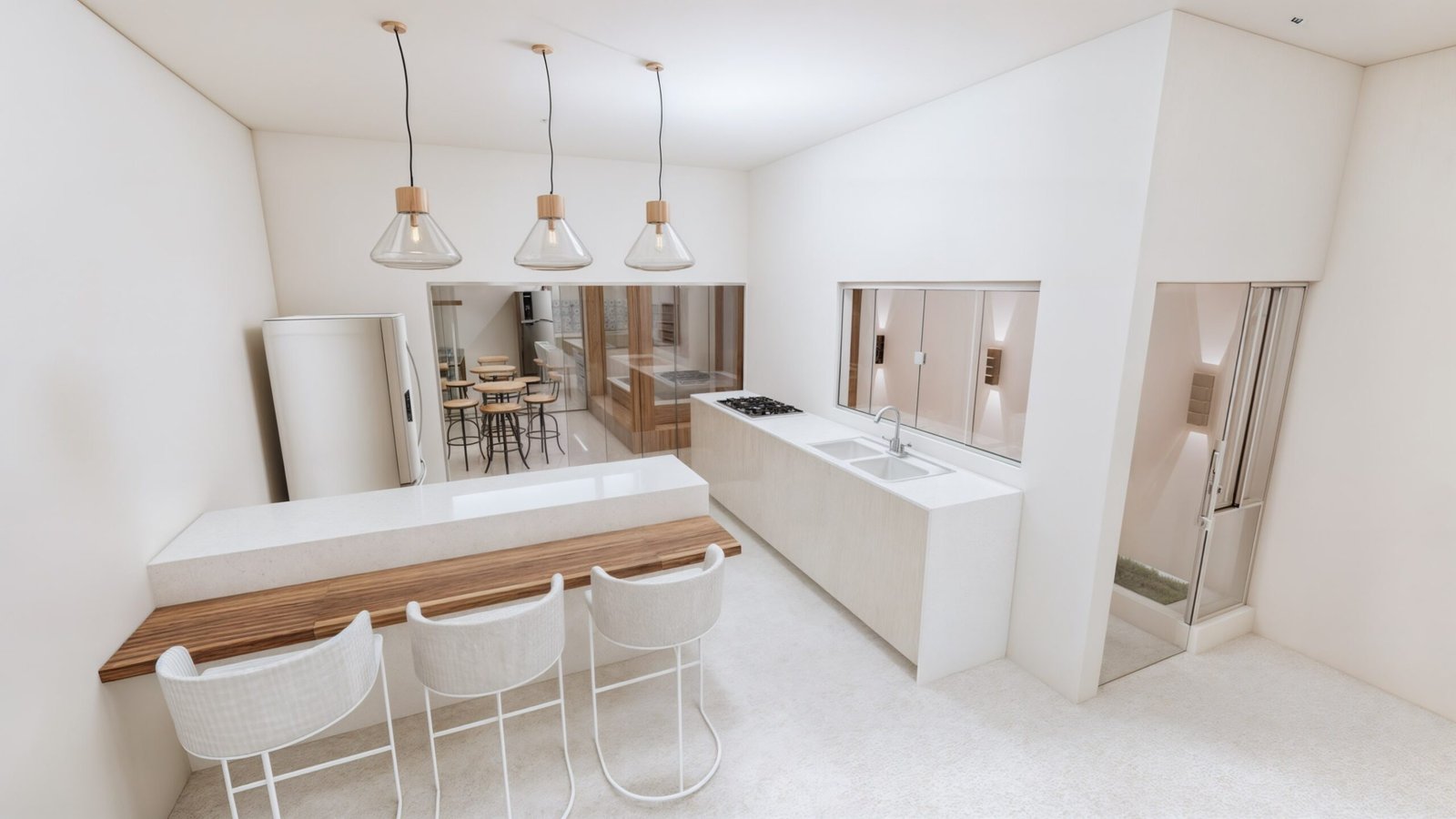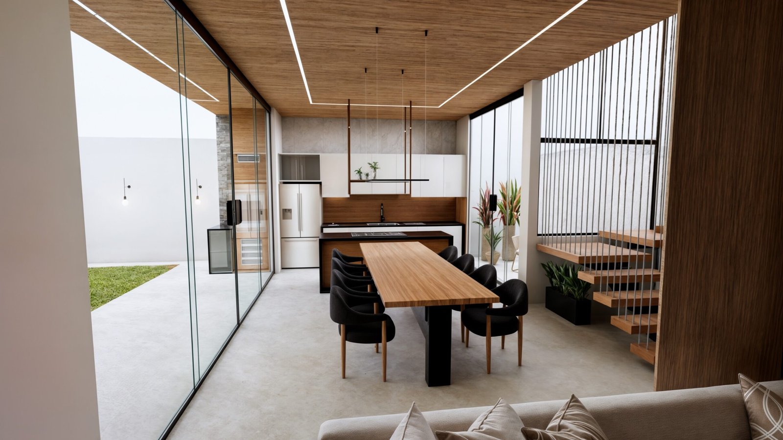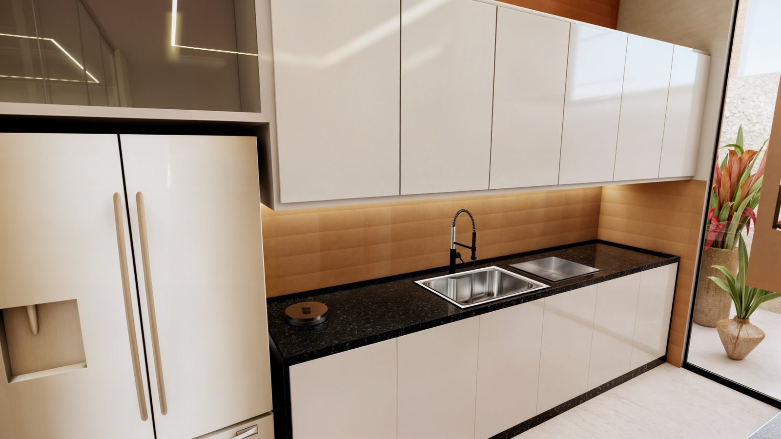 A solicitação dos nossos clientes era uma casa com três quartos, sendo uma suíte, sala integrada, cozinha, espaço gourmet e lavanderia.