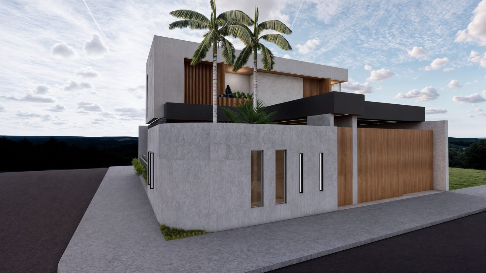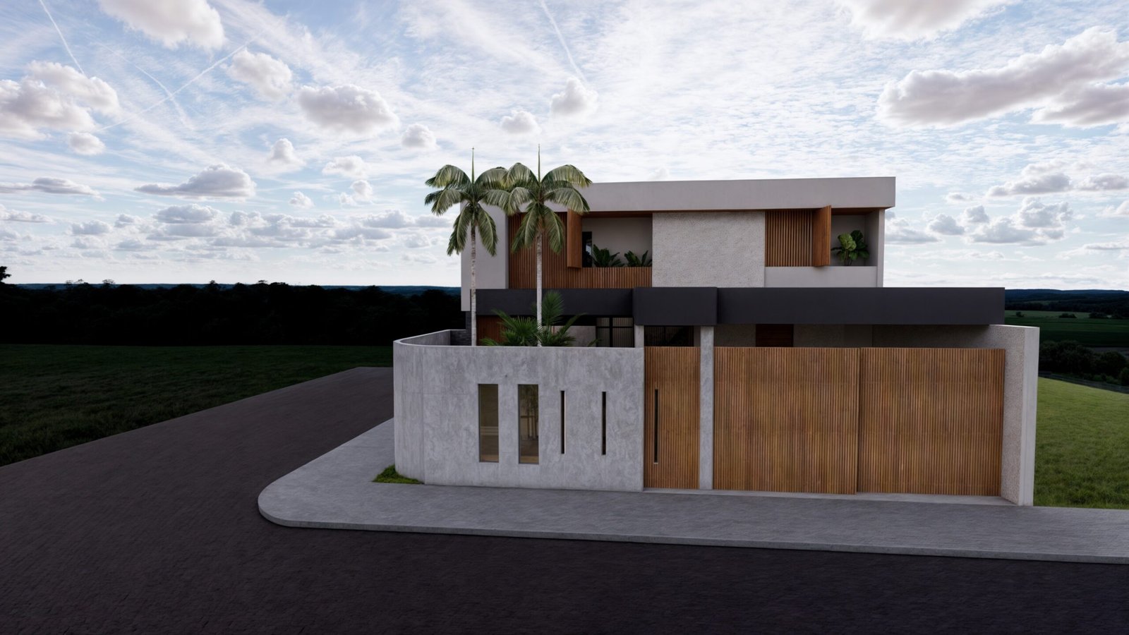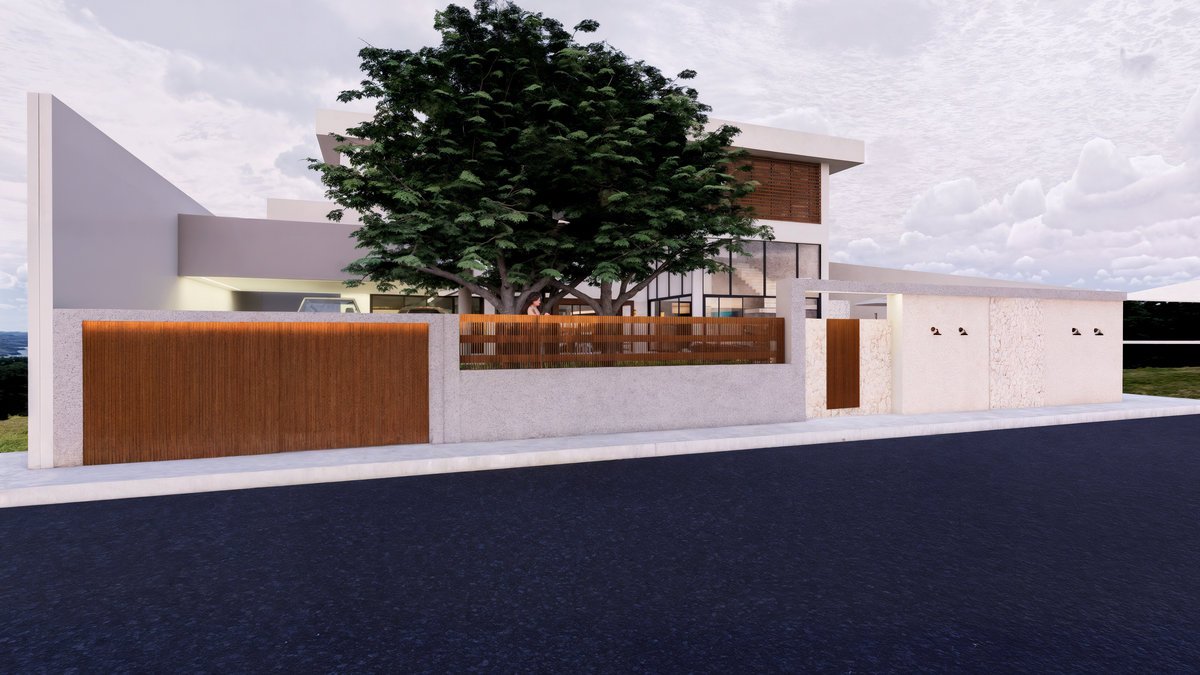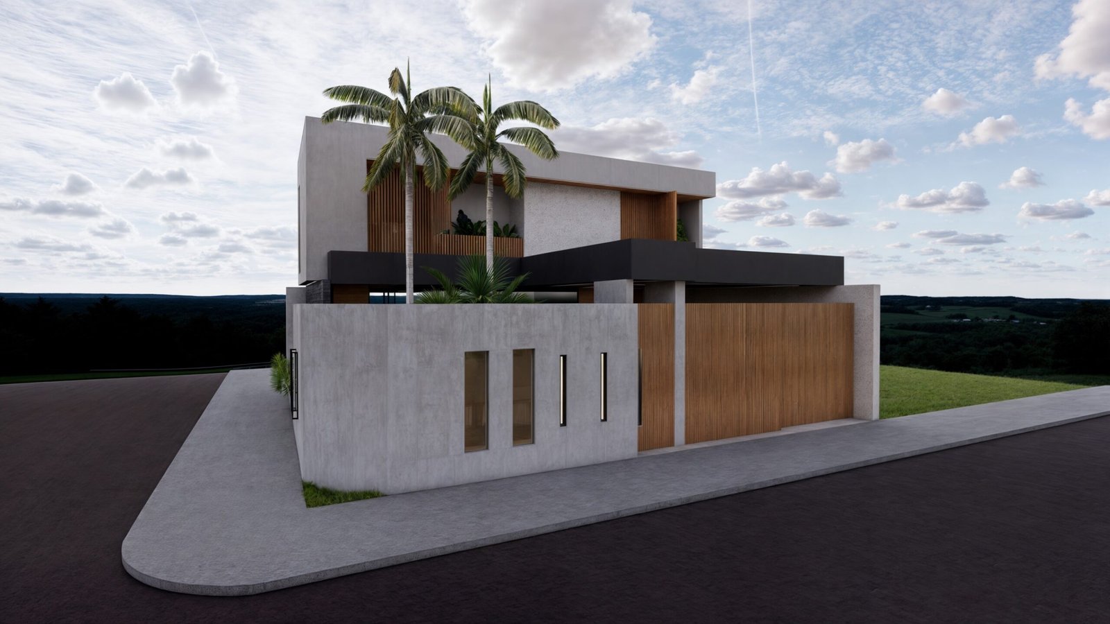 Uma residência contemporânea com toques de rusticidade e aconchego! Aqui vemos a entrada principal. Esta casa ocupará um amplo terreno, com acesso para duas ruas. O lote possui uma alta declividade. Devido a isso, buscamos aproveitar o desnível localizando a casa no nível do acesso principal e a área social (com área gourmet, pomar, playground, deck e piscina) no acesso à outra rua, em um nível abaixo. Desta forma, a residência possui dois pavimentos, devido ao desnível natural do terreno e ao aproveitamento consciente do mesmo.