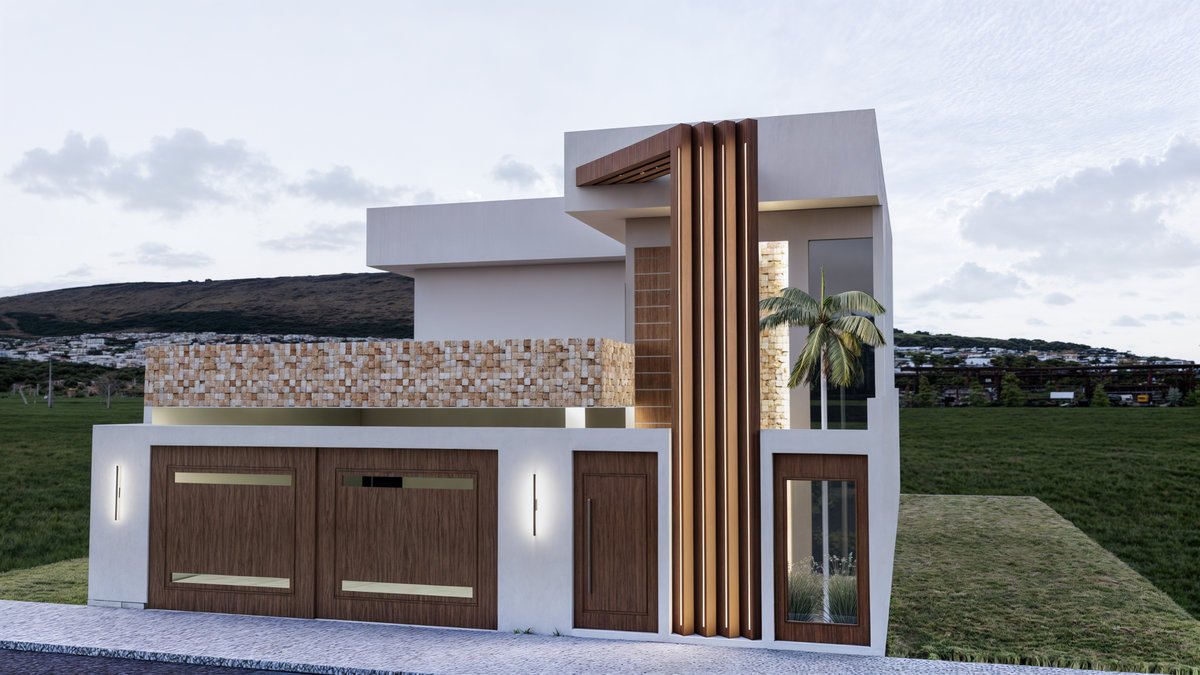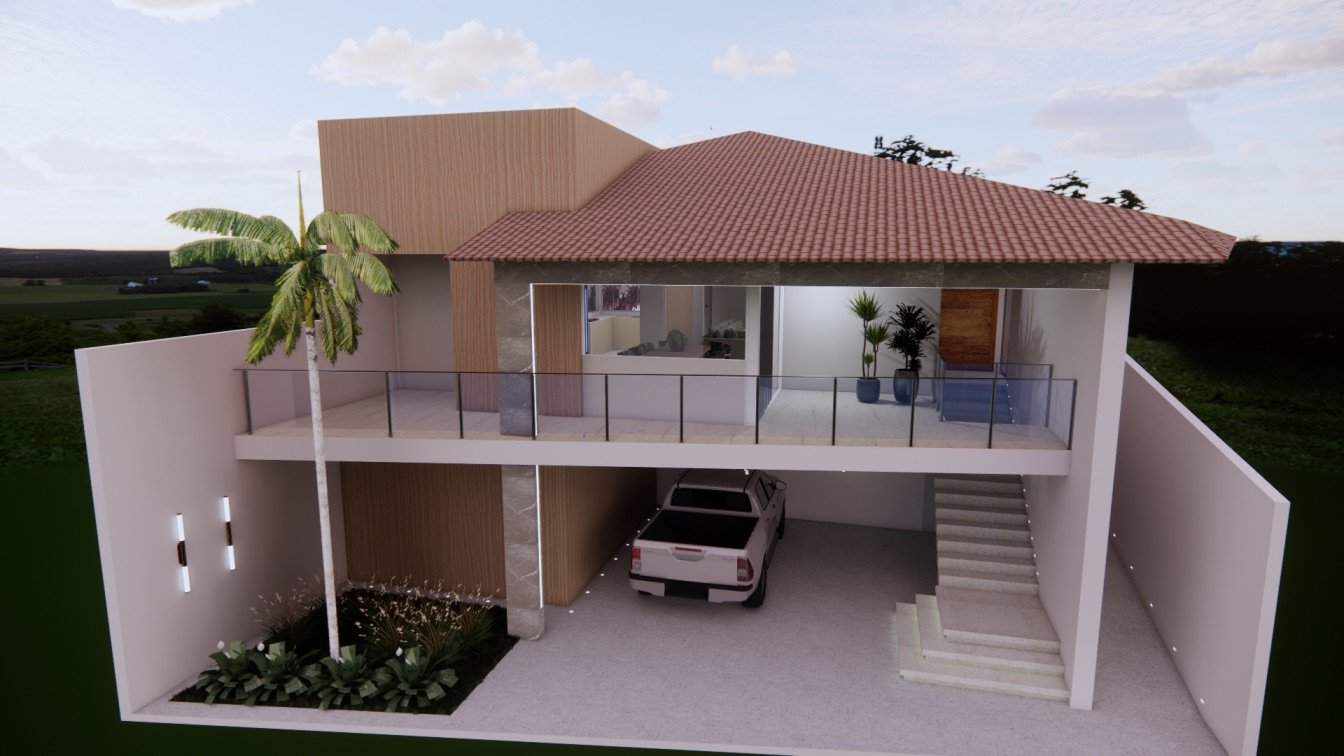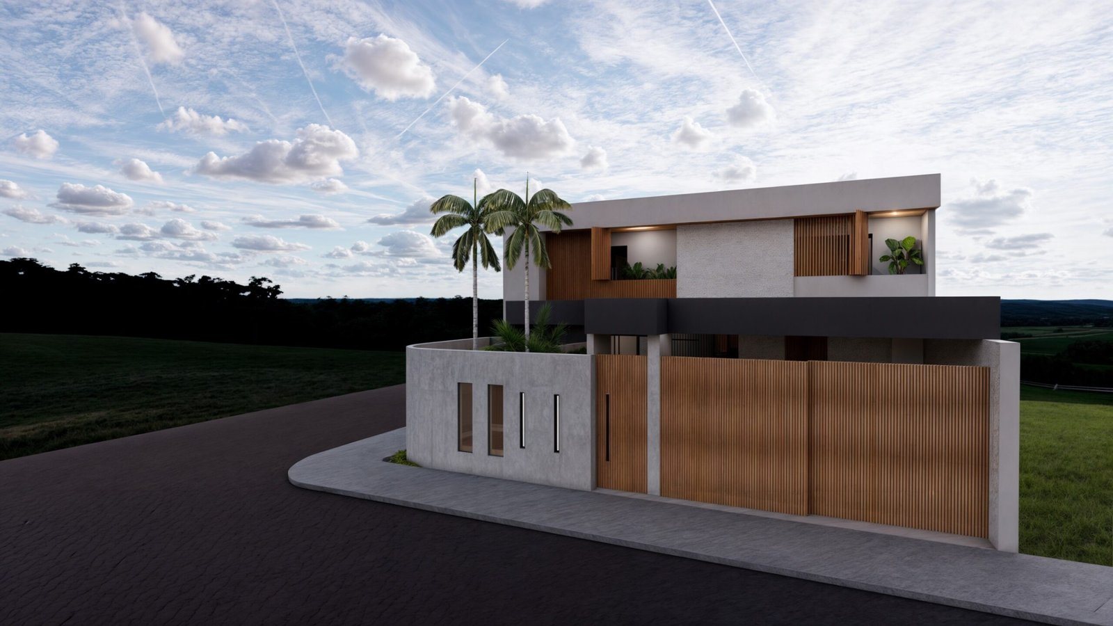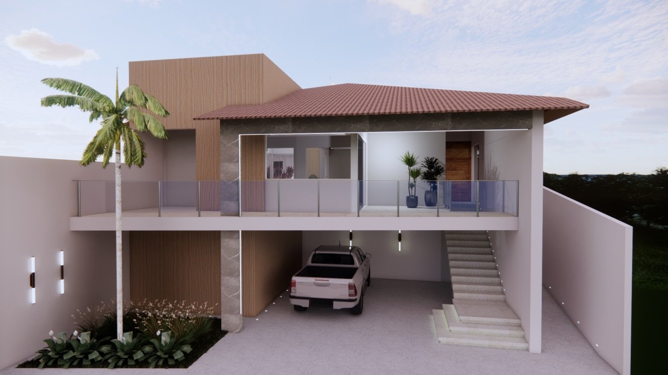 Uma residência contemporânea com toques de rusticidade e aconchego! Aqui vemos a entrada principal. Esta casa ocupará um amplo terreno, com acesso para duas ruas. O lote possui uma alta declividade. Devido a isso, buscamos aproveitar o desnível localizando a casa no nível do acesso principal e a área social (com área gourmet, pomar, playground, deck e piscina) no acesso à outra rua, em um nível abaixo. Desta forma, a residência possui dois pavimentos, devido ao desnível natural do terreno e ao aproveitamento consciente do mesmo.