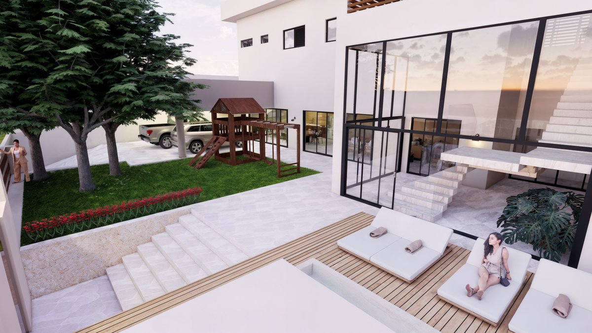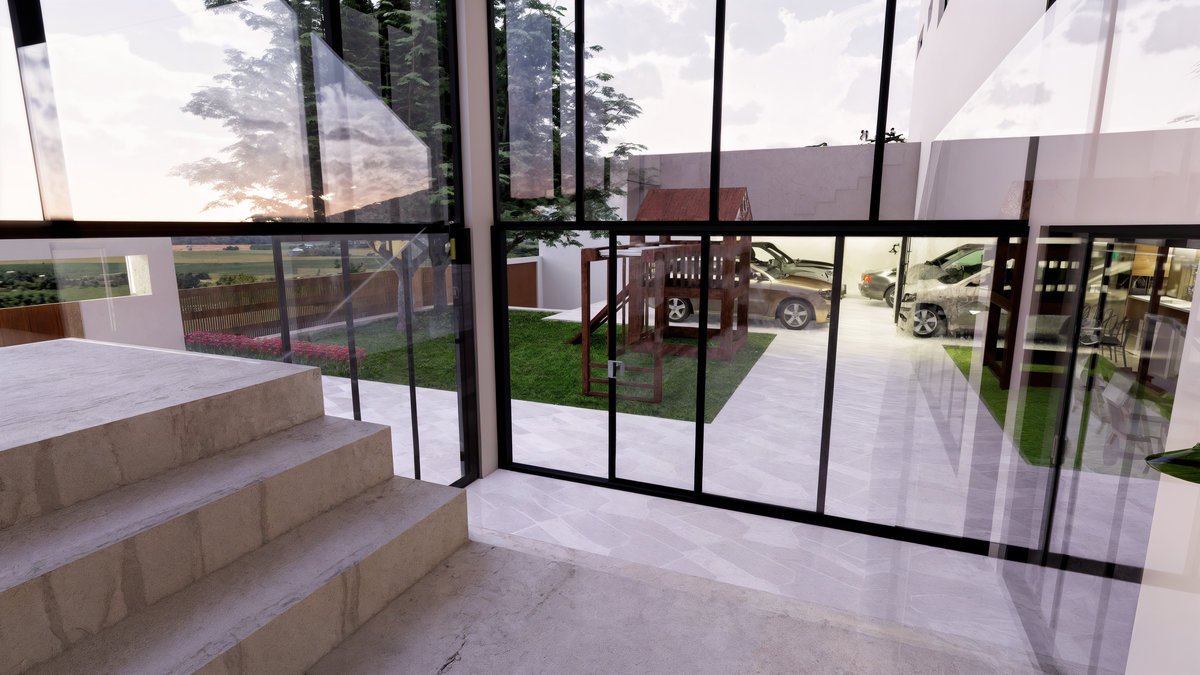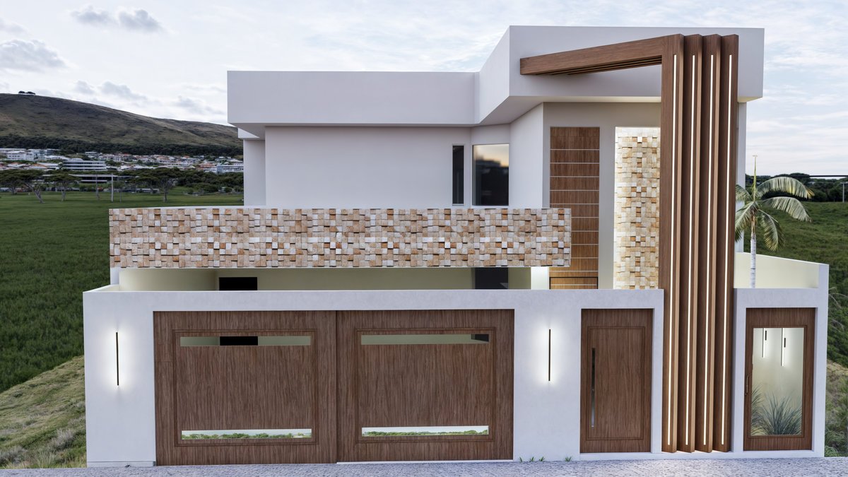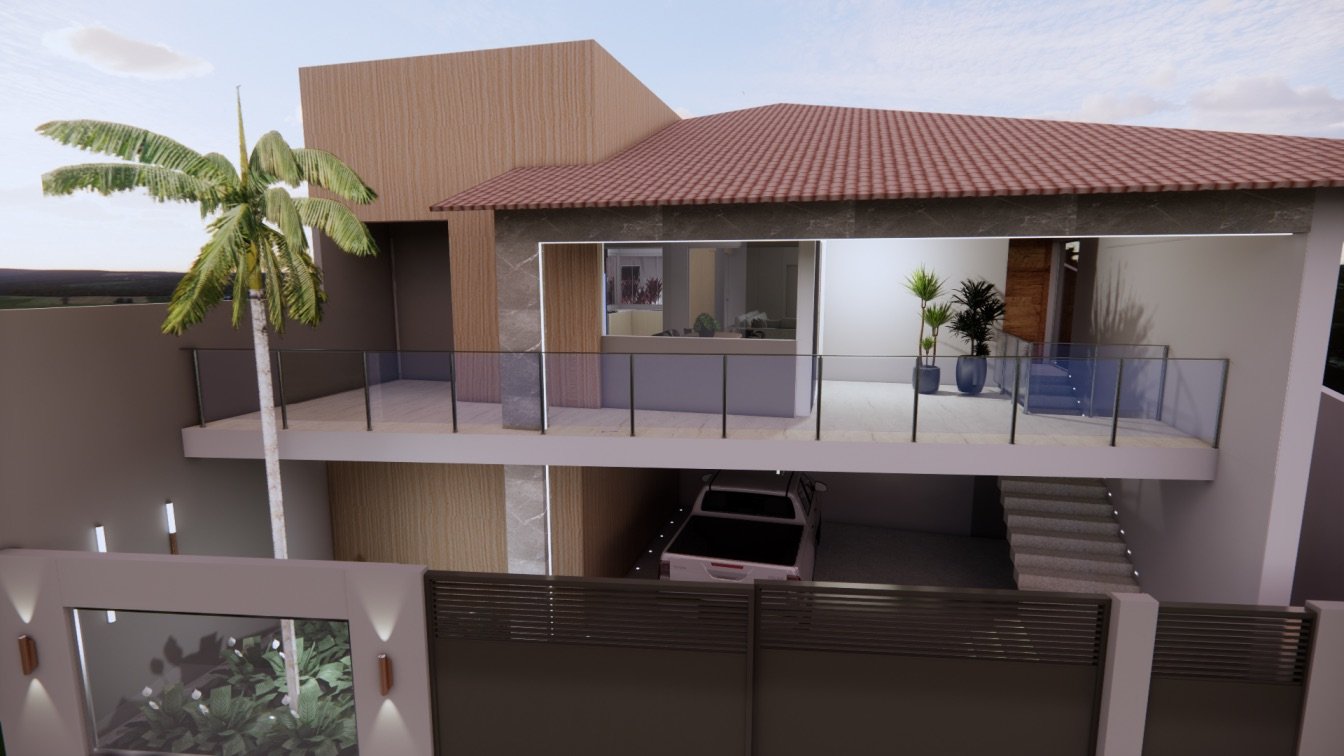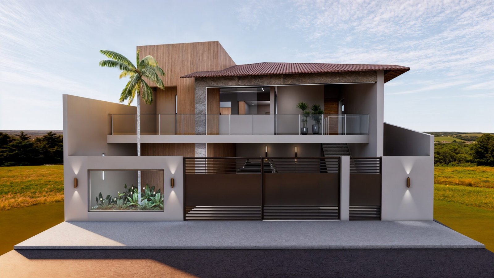 Uma residência contemporânea com toques de rusticidade e aconchego! Aqui vemos a entrada principal. Esta casa ocupará um amplo terreno, com acesso para duas ruas. O lote possui uma alta declividade. Devido a isso, buscamos aproveitar o desnível localizando a casa no nível do acesso principal e a área social (com área gourmet, pomar, playground, deck e piscina) no acesso à outra rua, em um nível abaixo. Desta forma, a residência possui dois pavimentos, devido ao desnível natural do terreno e ao aproveitamento consciente do mesmo.