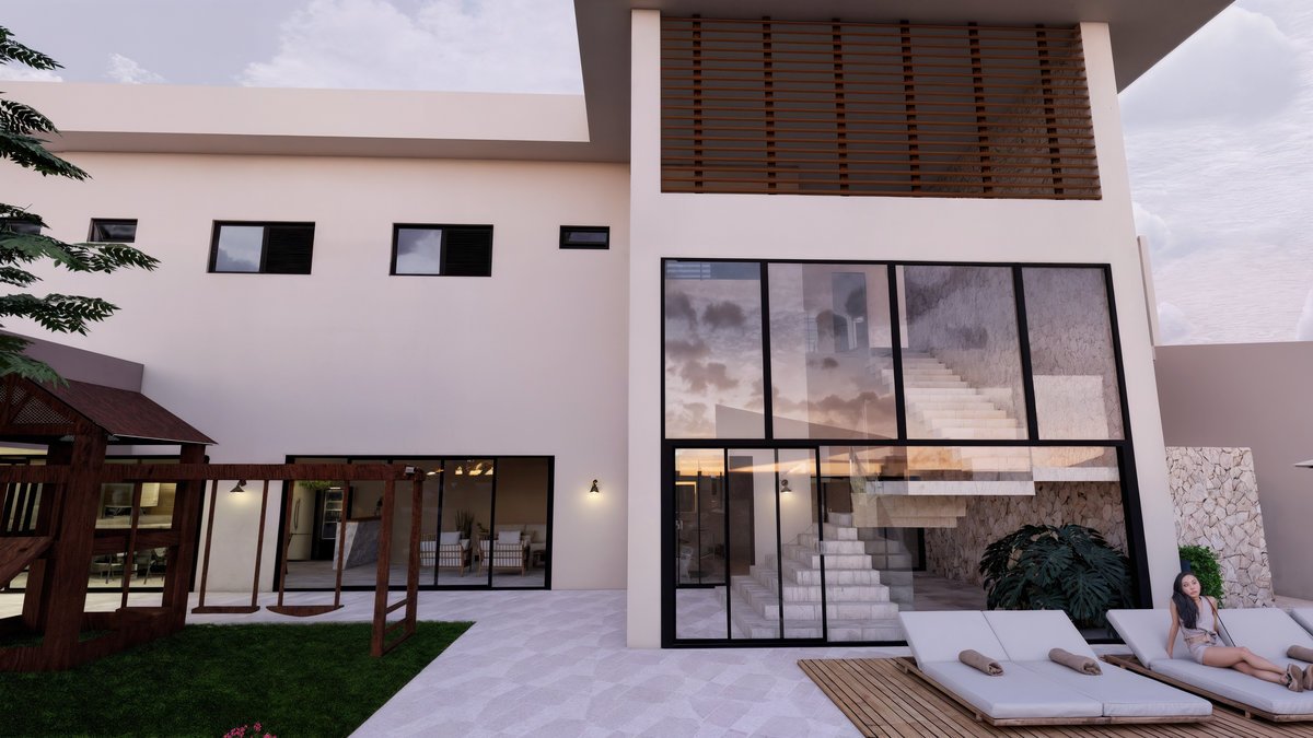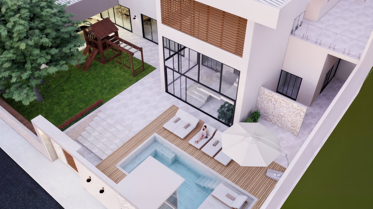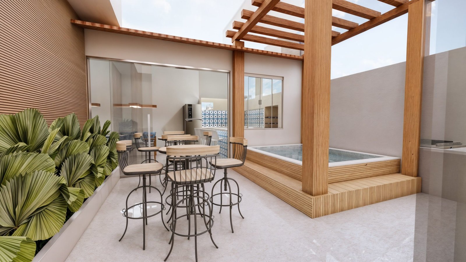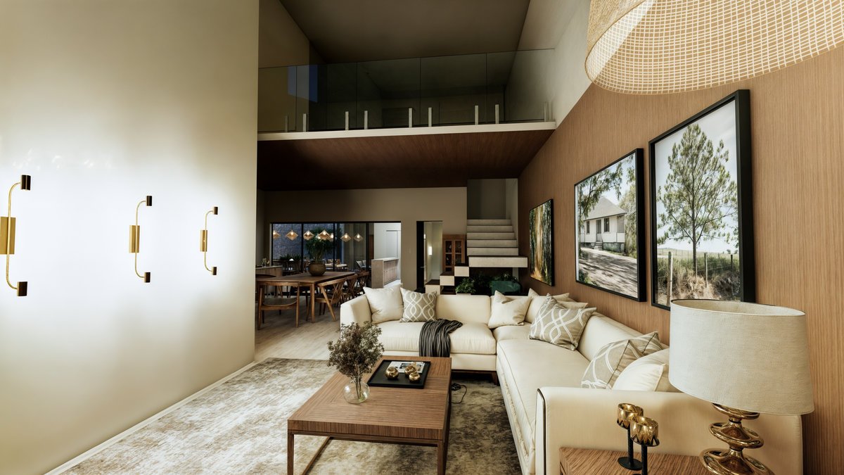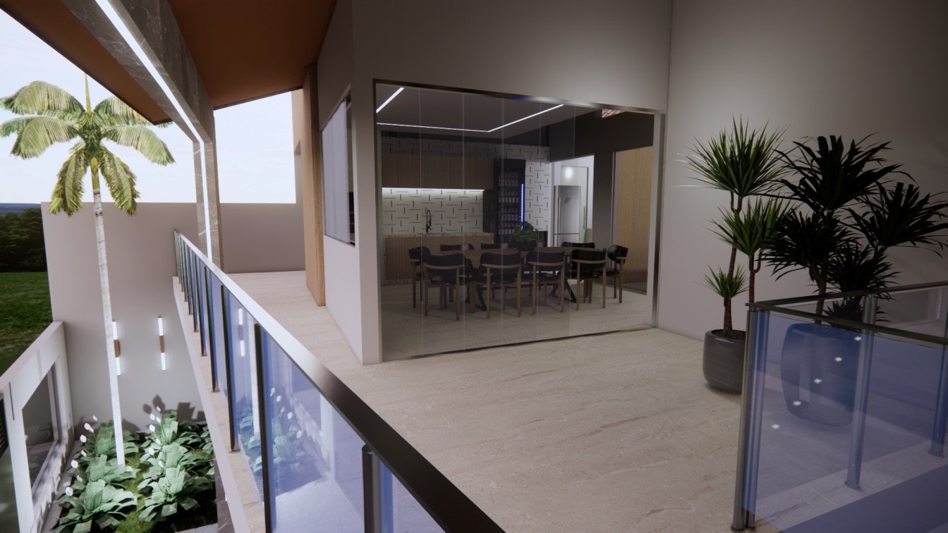 Na parte de cima, um mezanino com sala de TV e uma mini-copa faz a ligação dos quartos, com dimensão confortável e com sacadas que dão vista para a área da piscina. Uma fachada imponente e autêntica, com traços simples e esbeltos, e detalhes sutis que encantam!