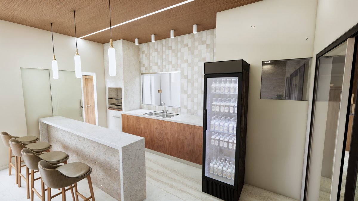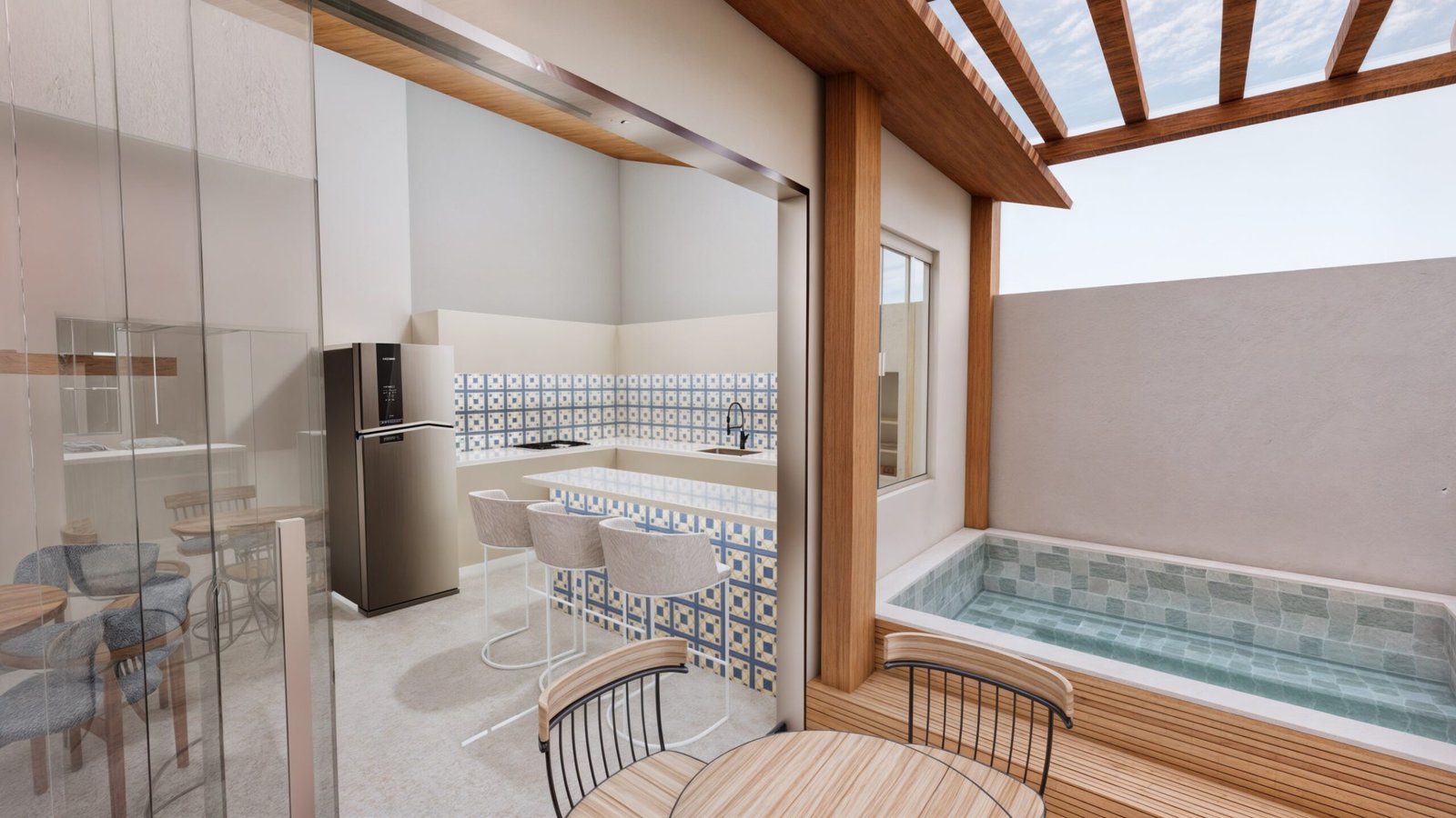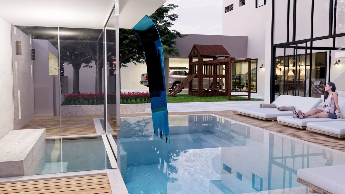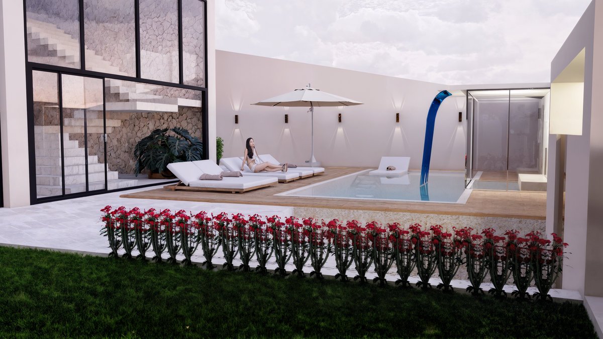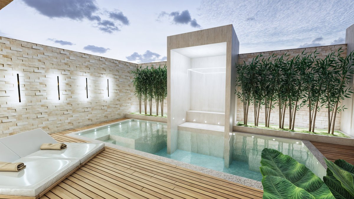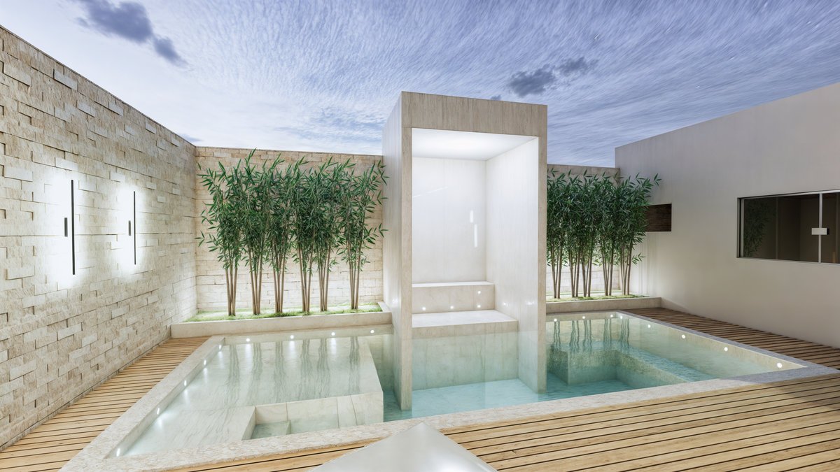 Na parte de cima, um mezanino com sala de TV e uma mini-copa faz a ligação dos quartos, com dimensão confortável e com sacadas que dão vista para a área da piscina. Uma fachada imponente e autêntica, com traços simples e esbeltos, e detalhes sutis que encantam!