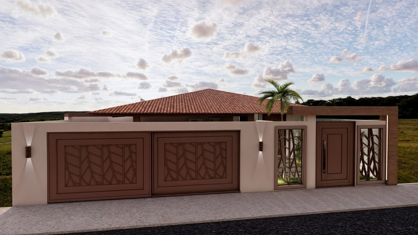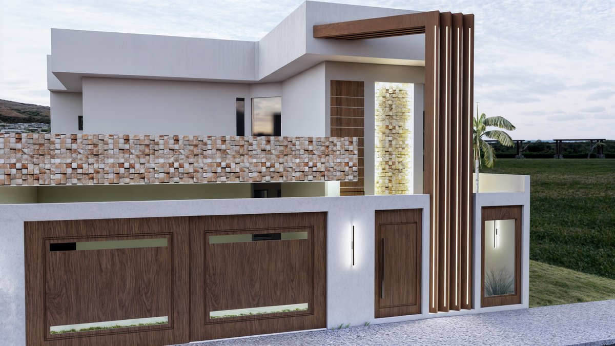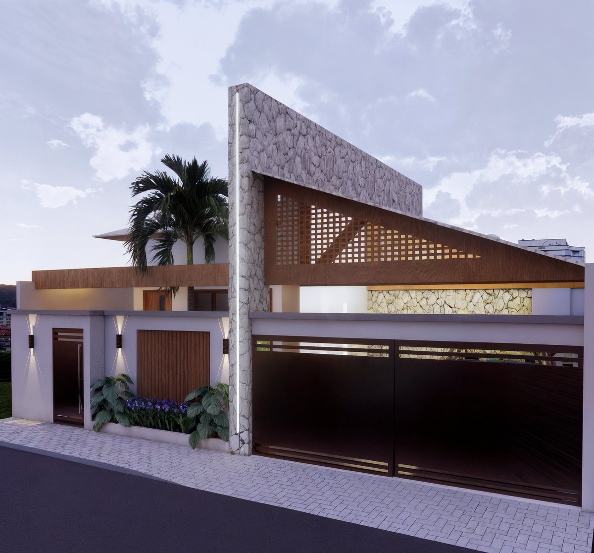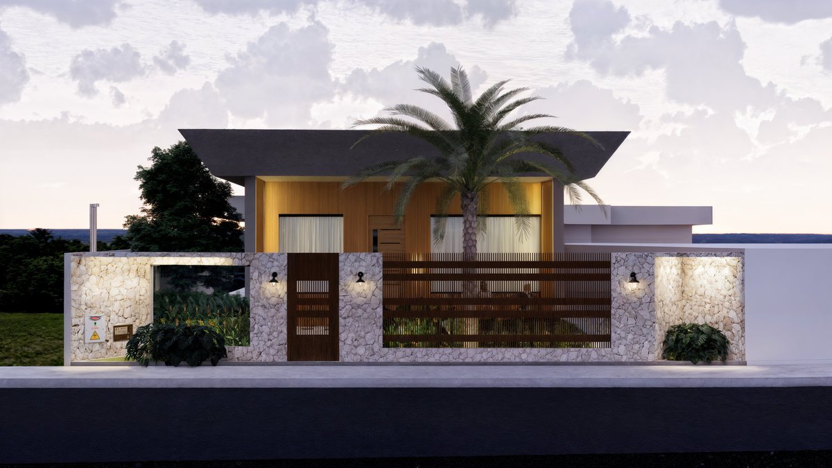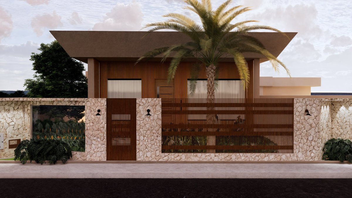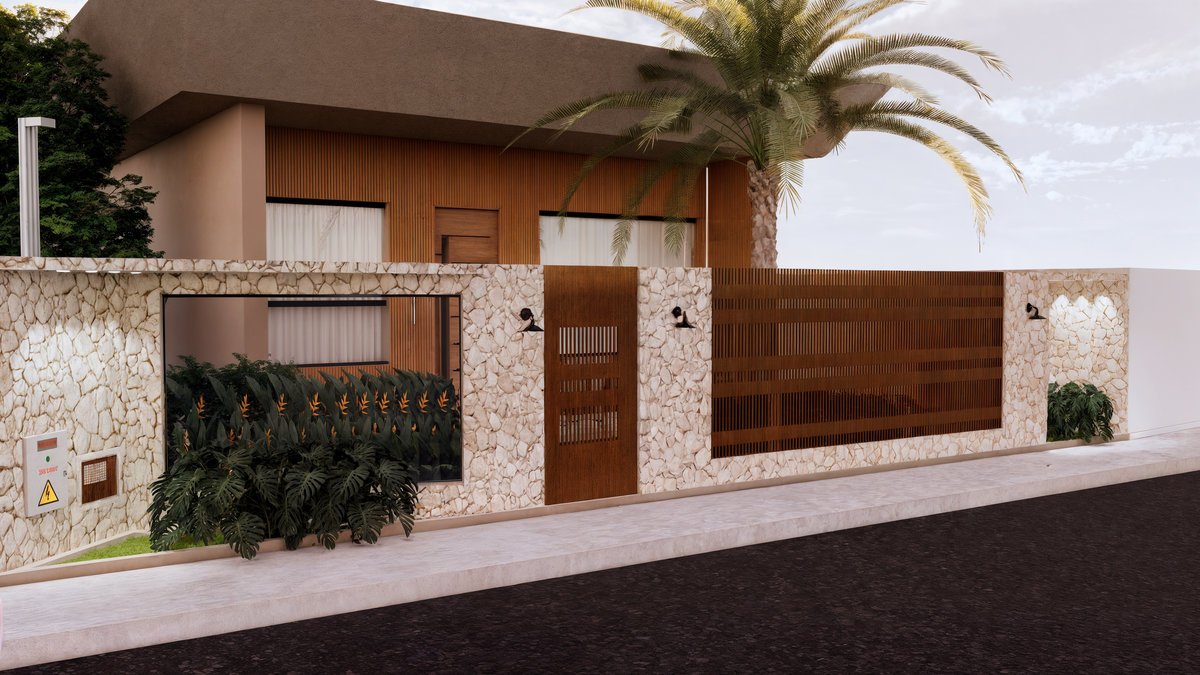 Como os moradores não moram na cidade onde ela será implantada, pretendendo utilizá-la em datas eventuais, com a família, pensamos em uma fachada de fácil manutenção, com o uso de pedras moledo champanhe, portões em WPC amadeirado e um muro de vidro refletivo, permitindo a visibilidade externa, pelos moradores, e inibindo a visibilidade de quem passa na rua.