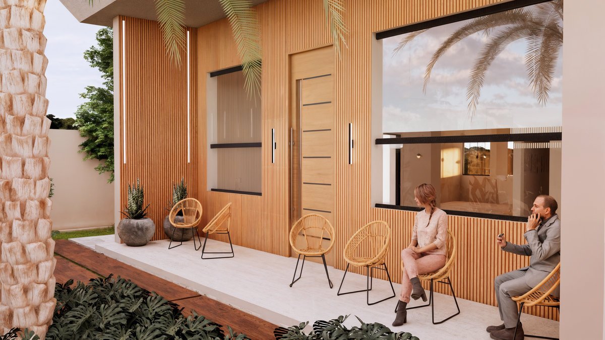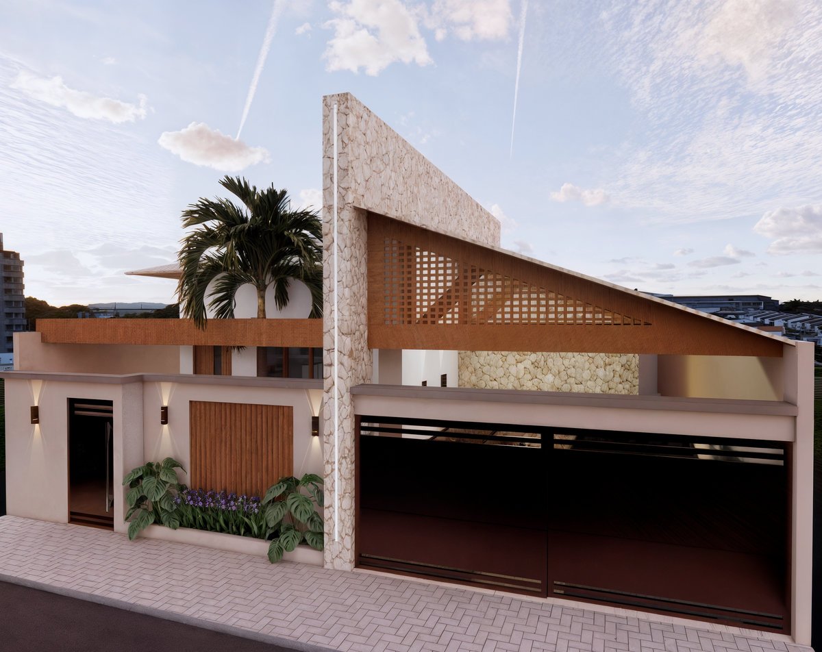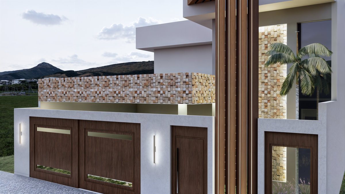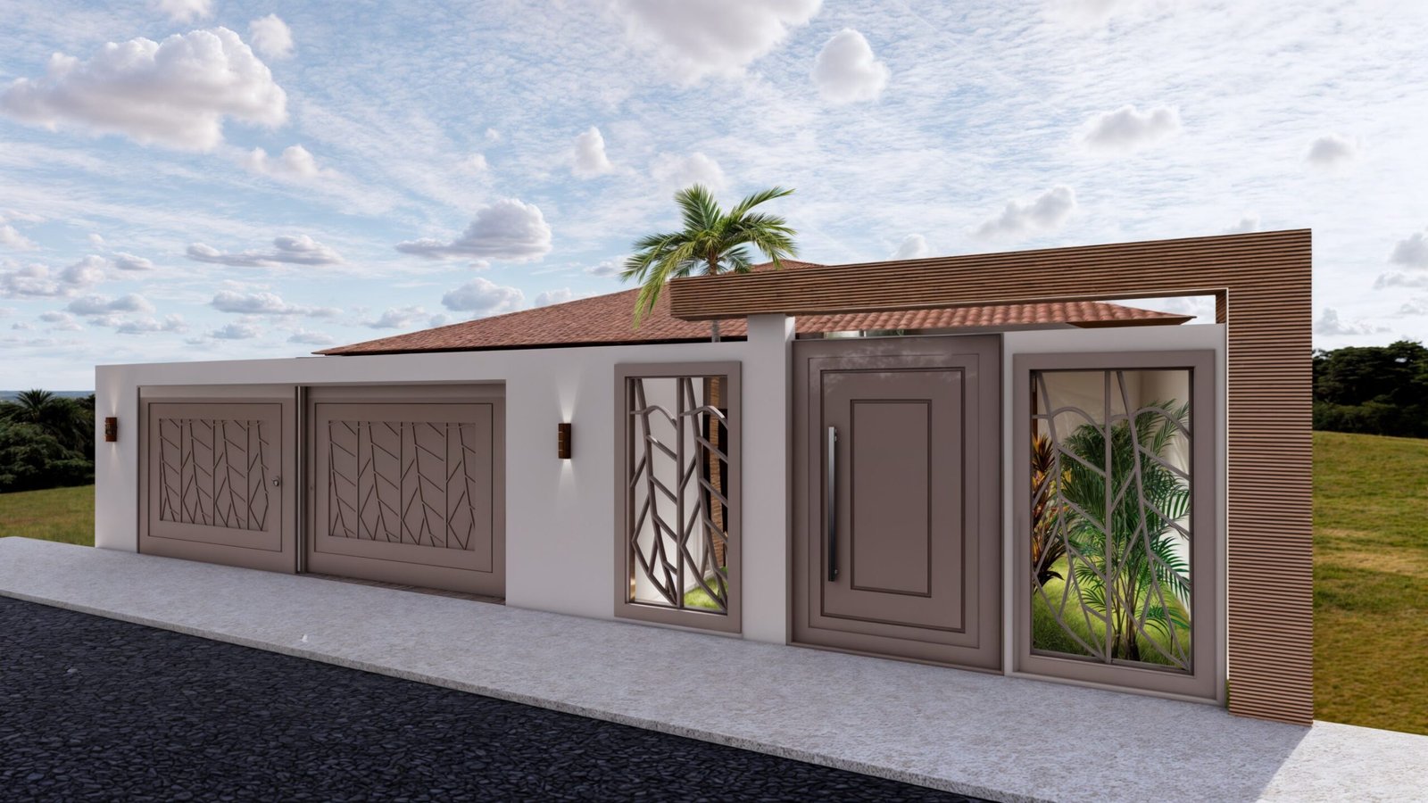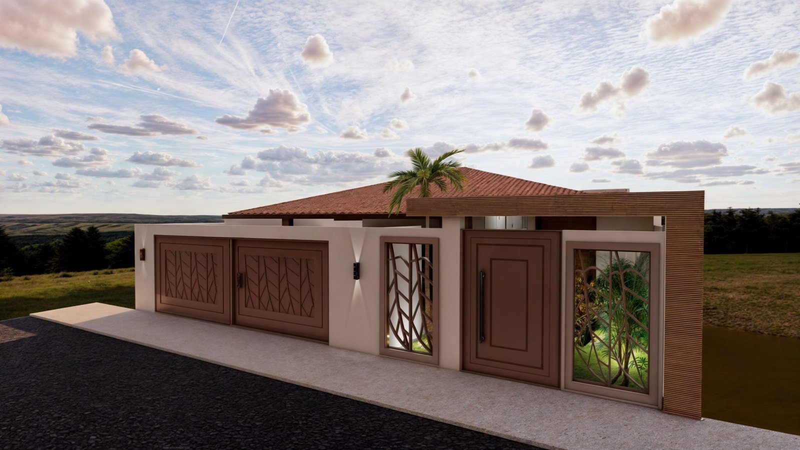 Como os moradores não moram na cidade onde ela será implantada, pretendendo utilizá-la em datas eventuais, com a família, pensamos em uma fachada de fácil manutenção, com o uso de pedras moledo champanhe, portões em WPC amadeirado e um muro de vidro refletivo, permitindo a visibilidade externa, pelos moradores, e inibindo a visibilidade de quem passa na rua.