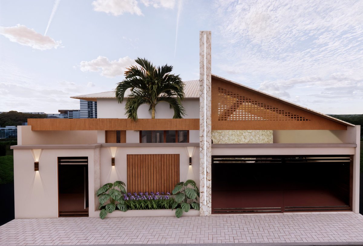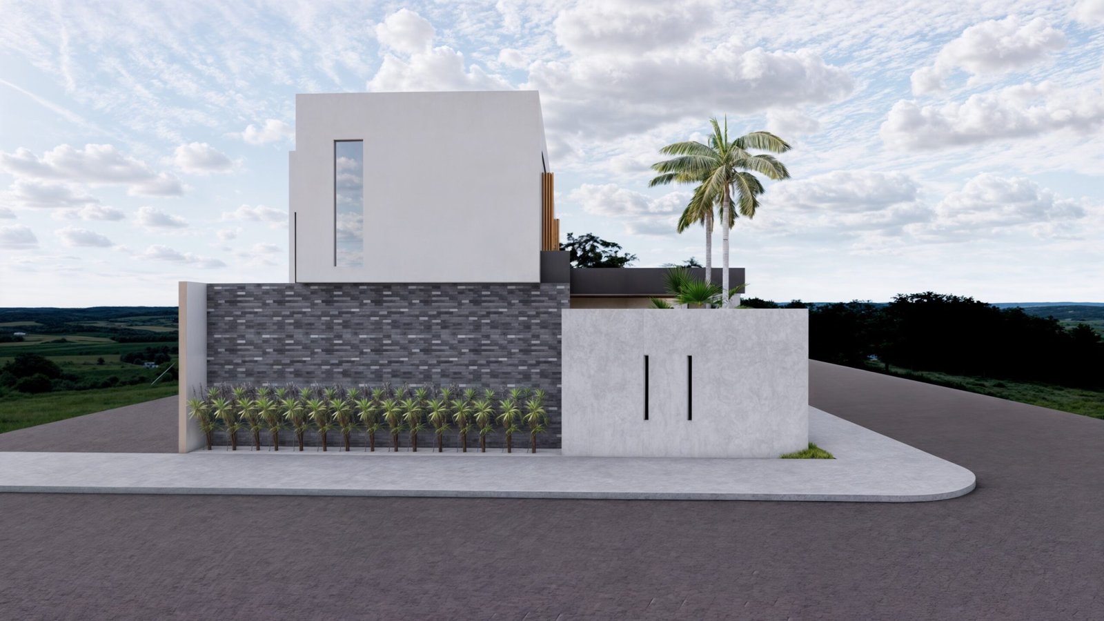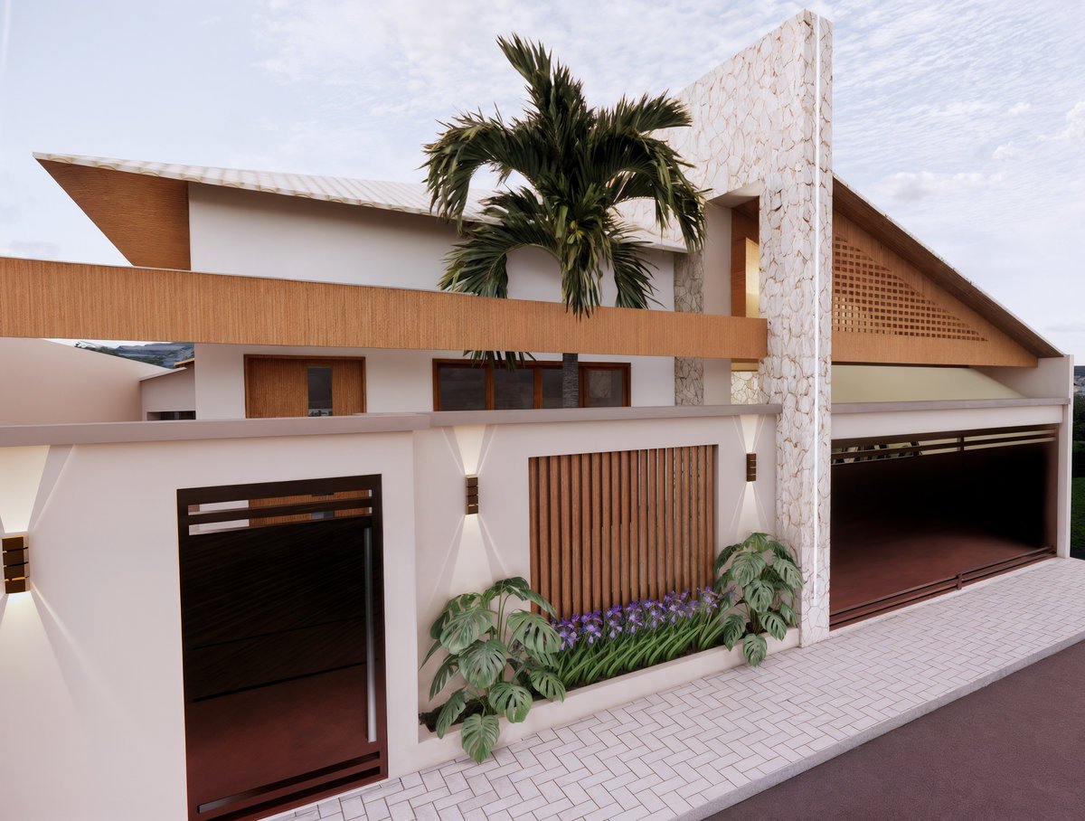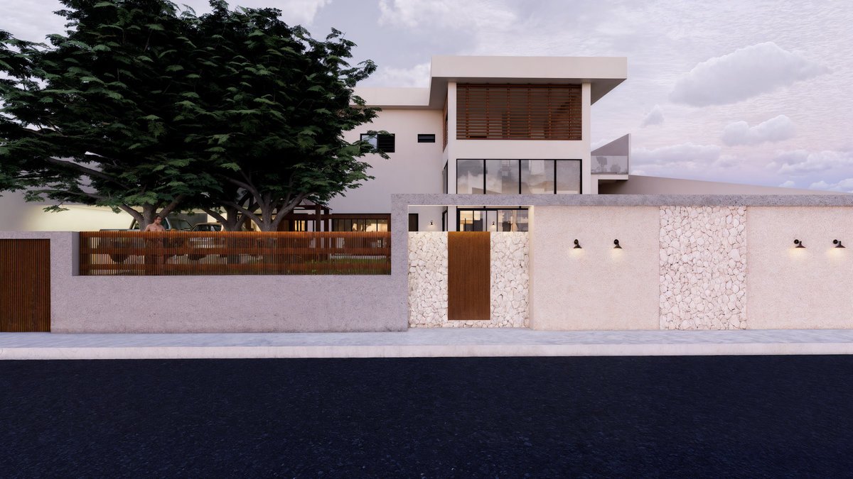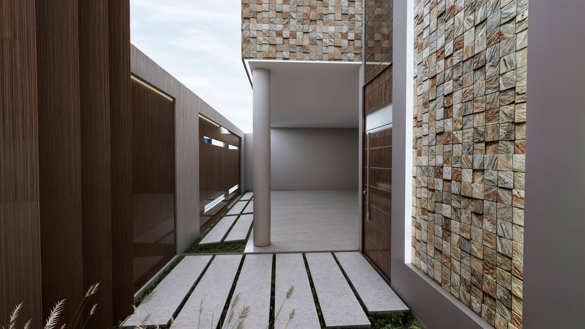 Como os moradores não moram na cidade onde ela será implantada, pretendendo utilizá-la em datas eventuais, com a família, pensamos em uma fachada de fácil manutenção, com o uso de pedras moledo champanhe, portões em WPC amadeirado e um muro de vidro refletivo, permitindo a visibilidade externa, pelos moradores, e inibindo a visibilidade de quem passa na rua.