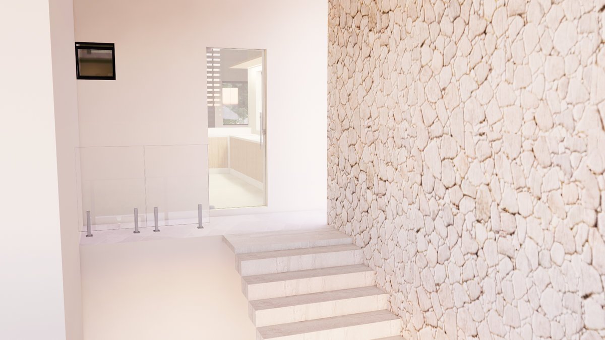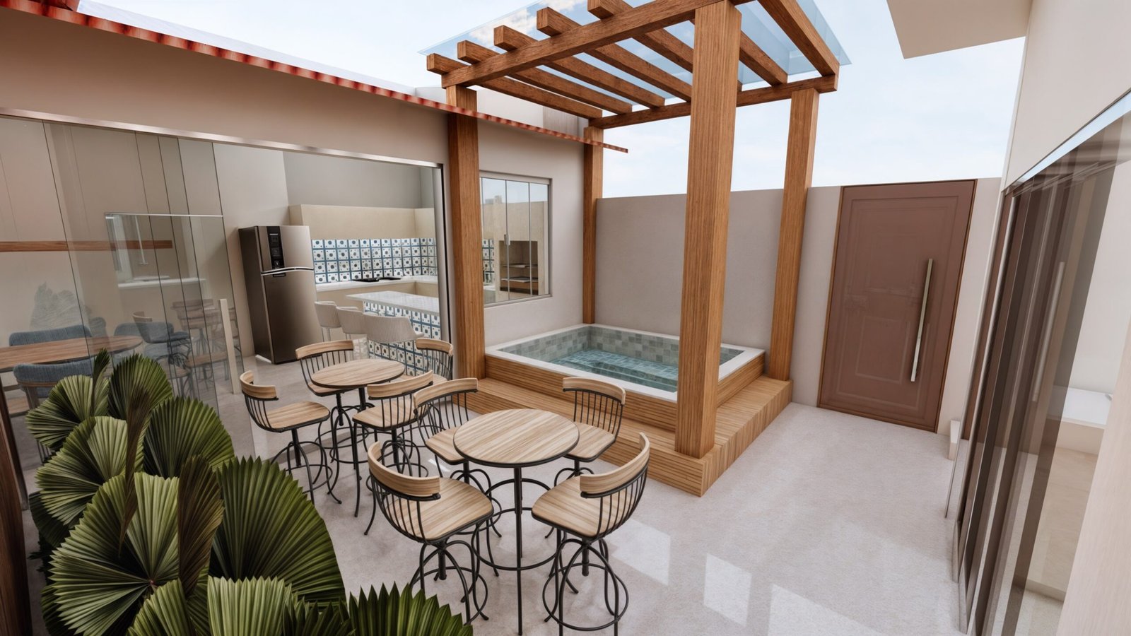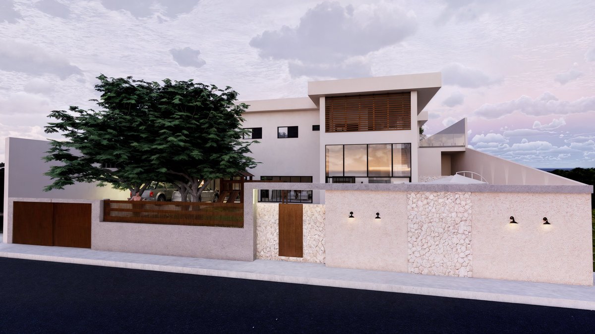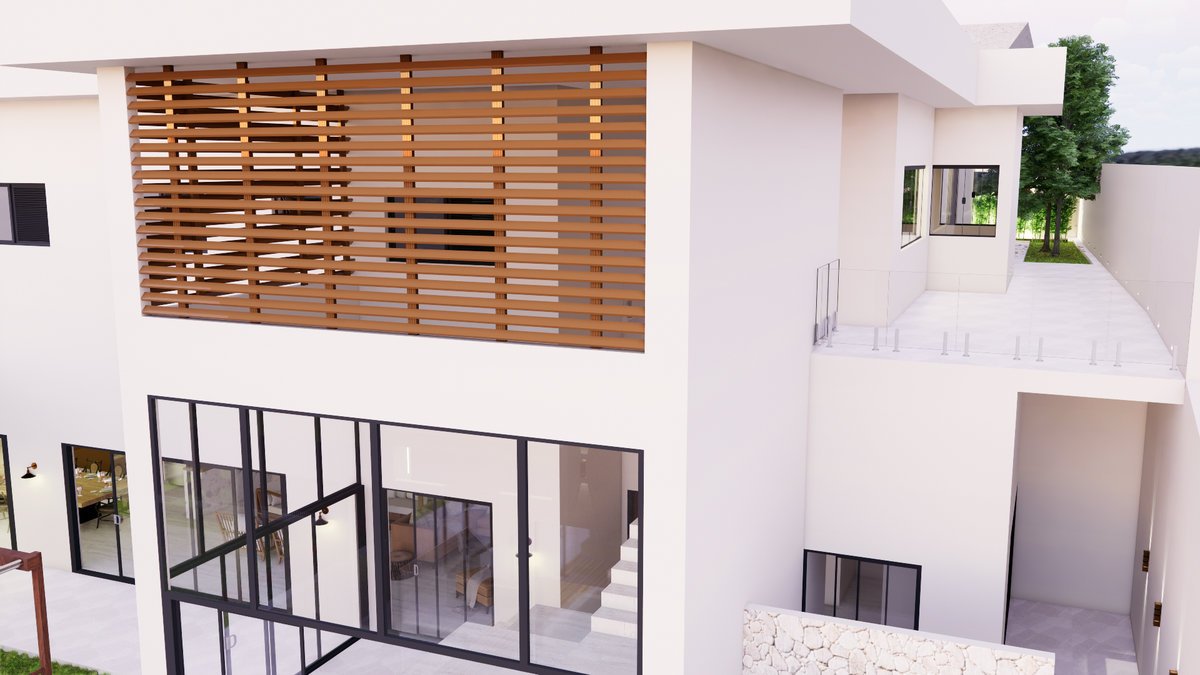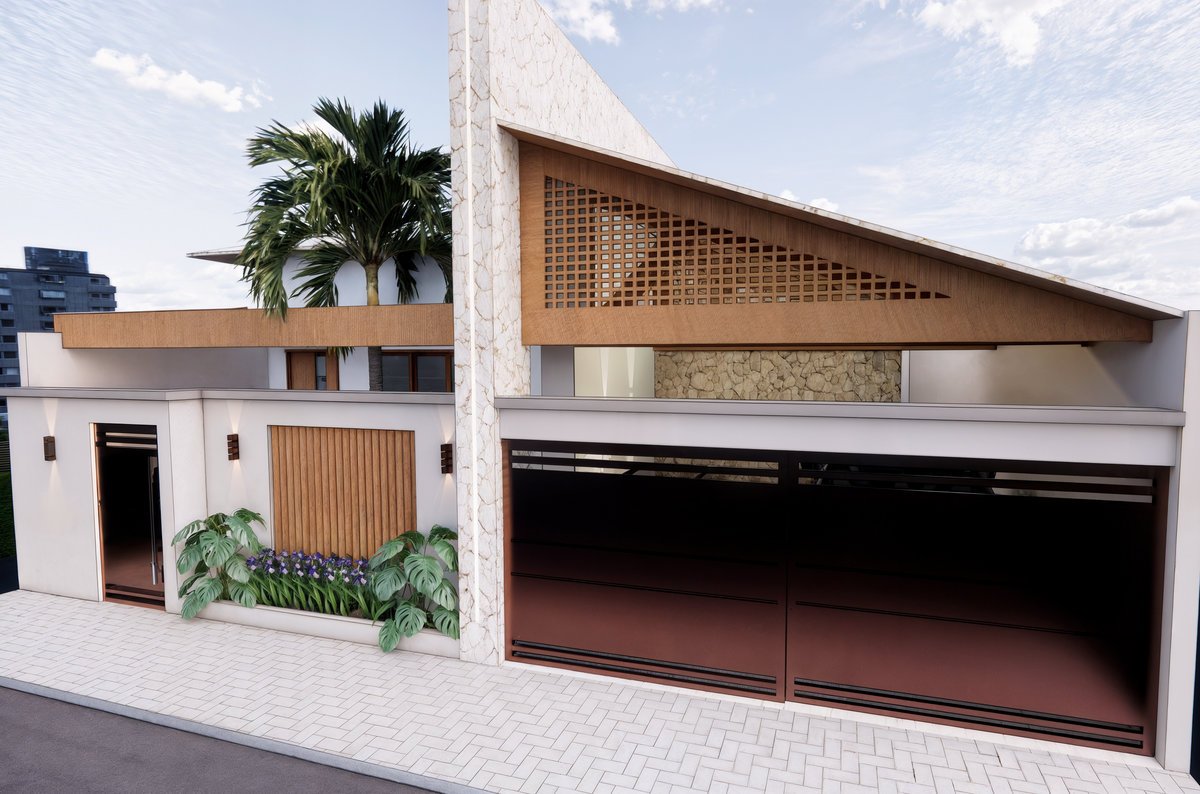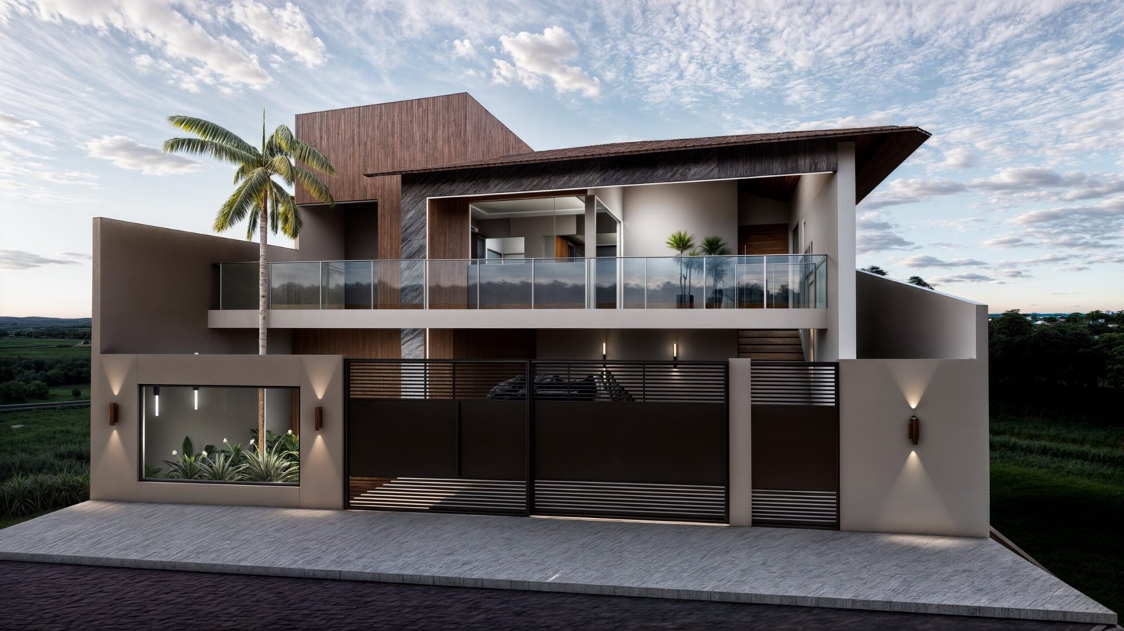 Como os moradores não moram na cidade onde ela será implantada, pretendendo utilizá-la em datas eventuais, com a família, pensamos em uma fachada de fácil manutenção, com o uso de pedras moledo champanhe, portões em WPC amadeirado e um muro de vidro refletivo, permitindo a visibilidade externa, pelos moradores, e inibindo a visibilidade de quem passa na rua.