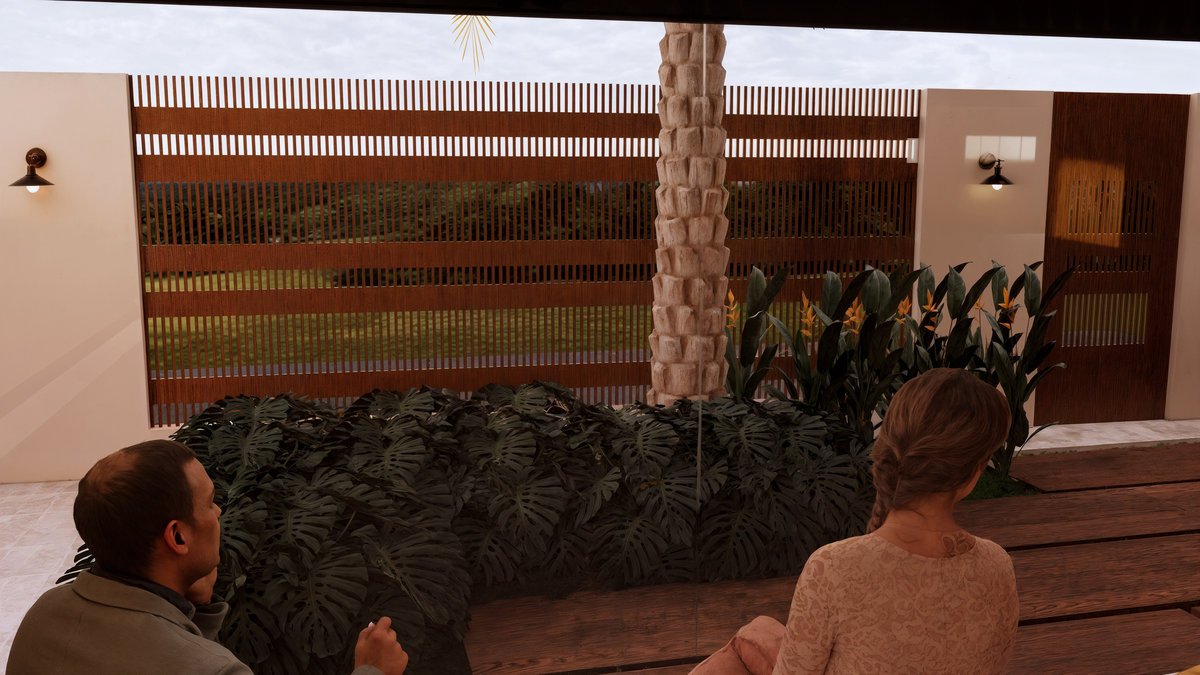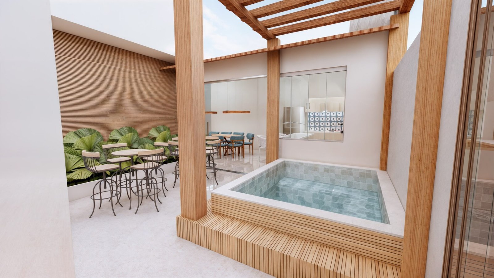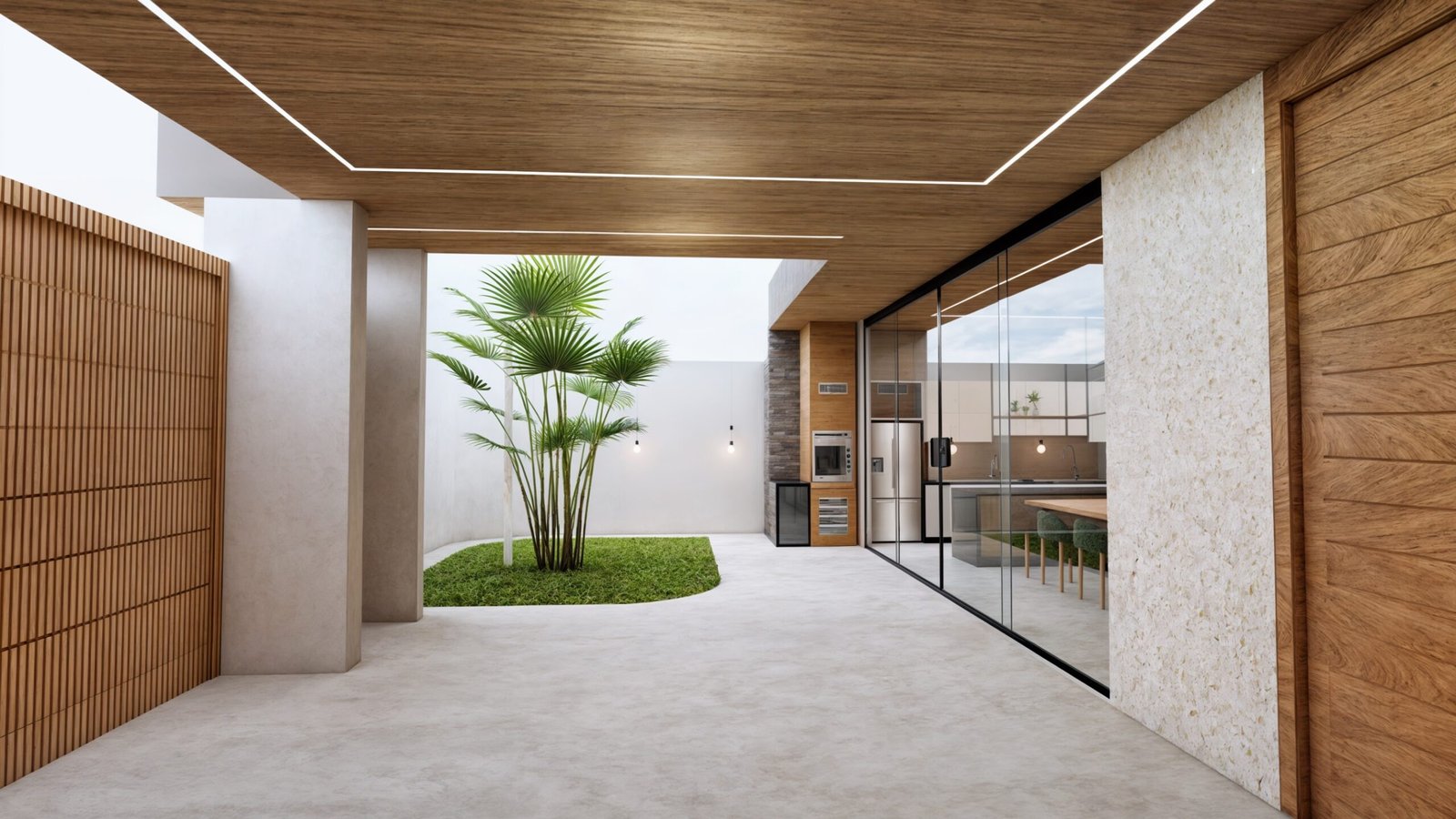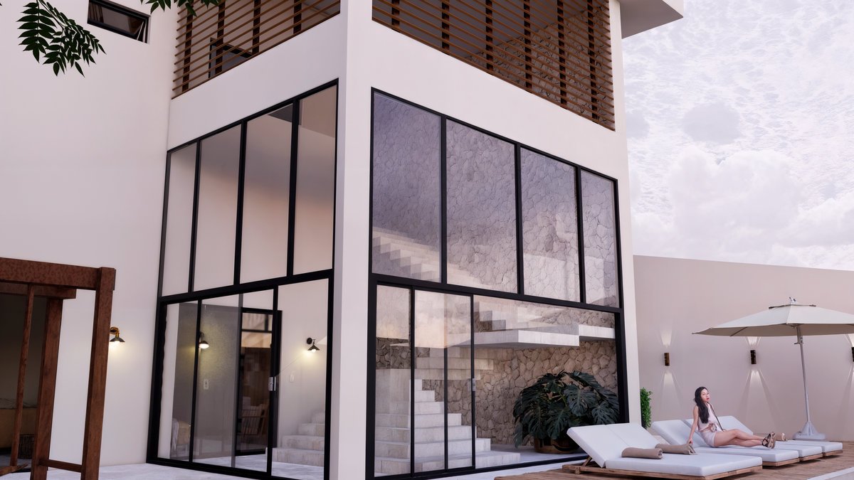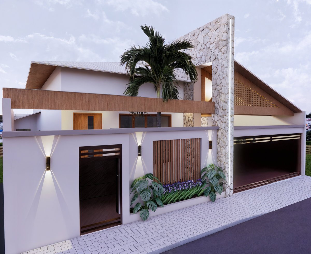 Como os moradores não moram na cidade onde ela será implantada, pretendendo utilizá-la em datas eventuais, com a família, pensamos em uma fachada de fácil manutenção, com o uso de pedras moledo champanhe, portões em WPC amadeirado e um muro de vidro refletivo, permitindo a visibilidade externa, pelos moradores, e inibindo a visibilidade de quem passa na rua.