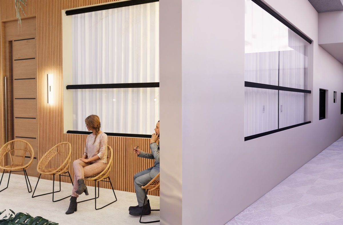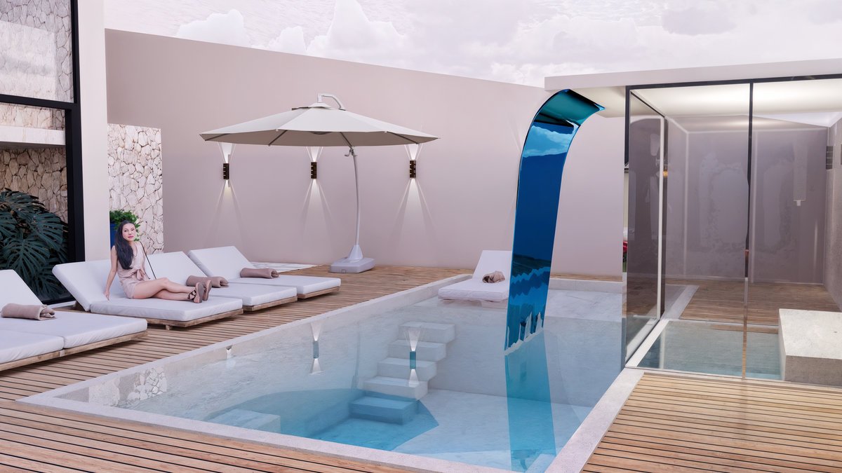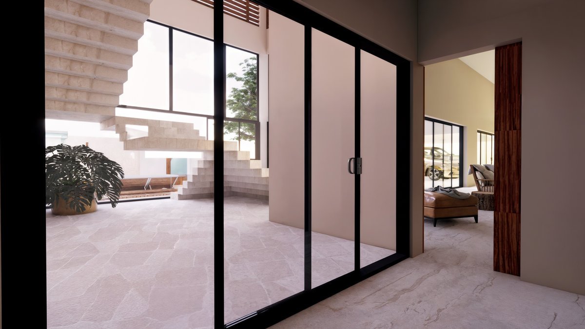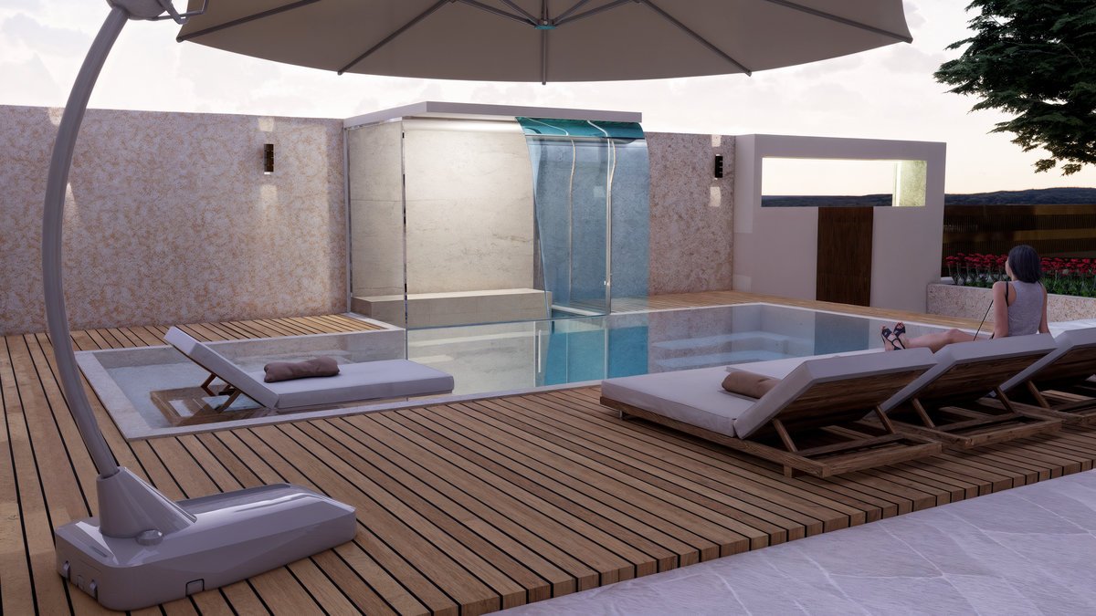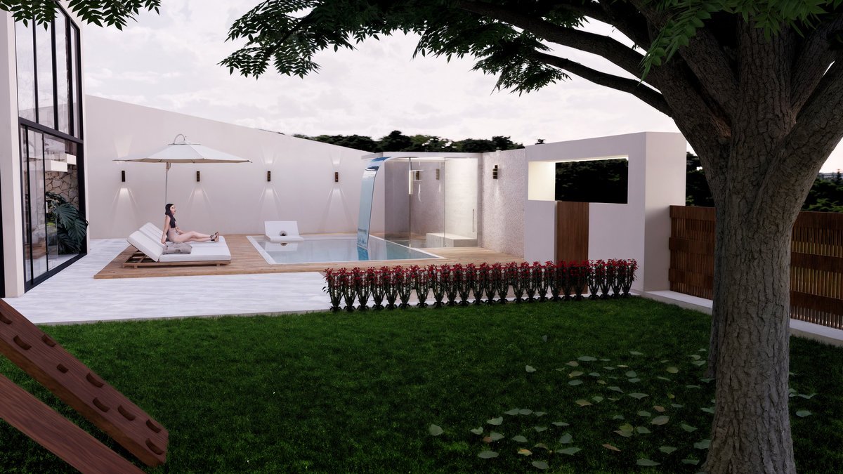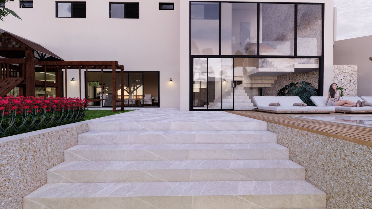Como os moradores não moram na cidade onde ela será implantada, pretendendo utilizá-la em datas eventuais, com a família, pensamos em uma fachada de fácil manutenção, com o uso de pedras moledo champanhe, portões em WPC amadeirado e um muro de vidro refletivo, permitindo a visibilidade externa, pelos moradores, e inibindo a visibilidade de quem passa na rua.