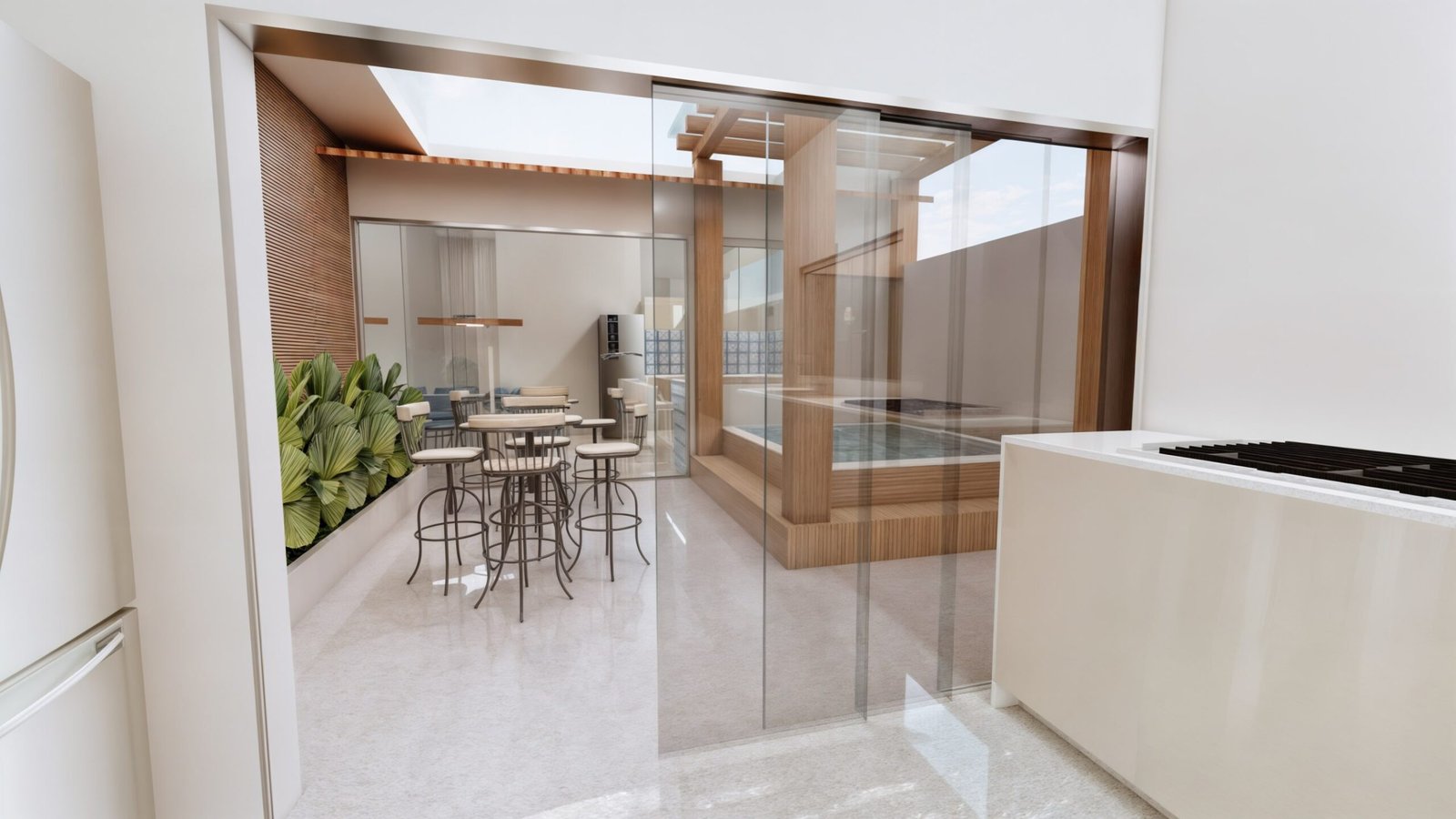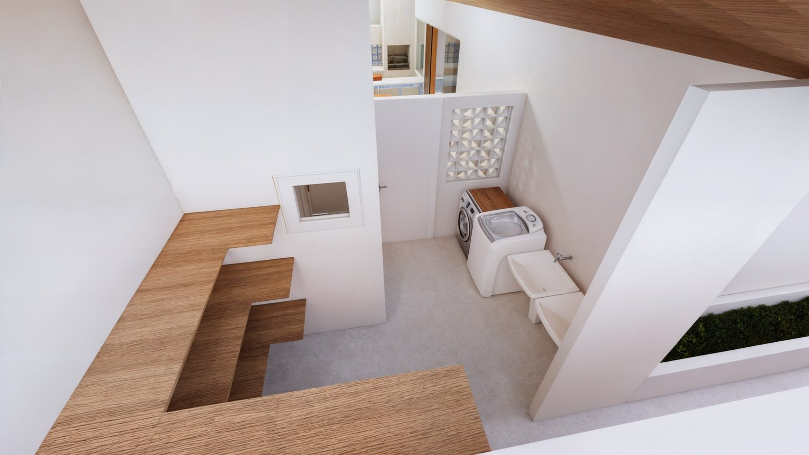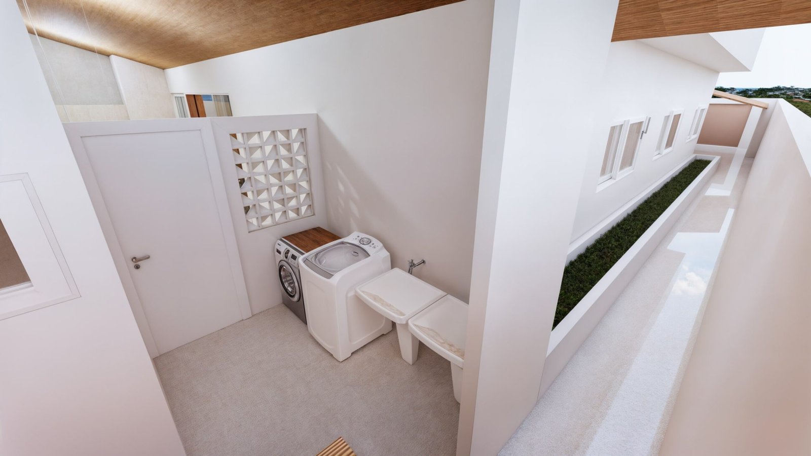 A área de serviço, ao lado da cozinha, possui ao lado uma área de secagem, sem visibilidade, com acesso para um jardim que dá vista para a sala.