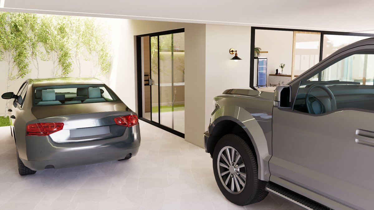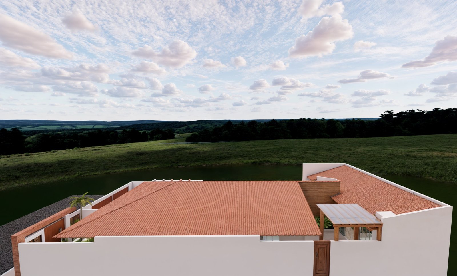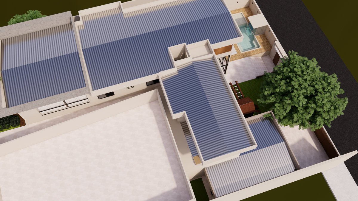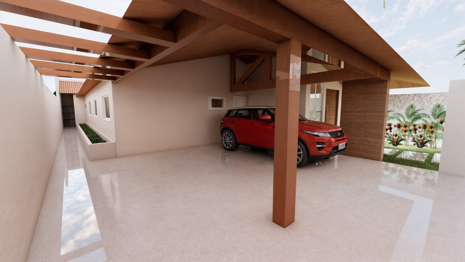 Desta forma, seguindo a horizontalidade da casa, respeitando sua linha plástica e mantendo uma harmonia com todo o contexto, sugerimos uma cobertura de três águas no corpo principal da residência, com uma estrutura integrada de madeira e aço na garagem, para possibilitar um vão maior (para três carros) sem a necessidade de muitos pilares.