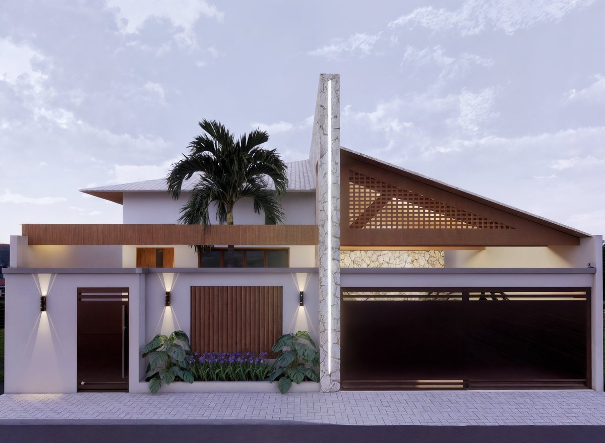 Os pórticos iluminados, na fachada, promovem personalidade e uma leve proteção ao acesso principal. Os tons da pedra, na platibanda da garagem, juntamente ao aspecto amadeirado do pórtico, dos portões e da porta principal conferem ainda mais sofisticação à residência.